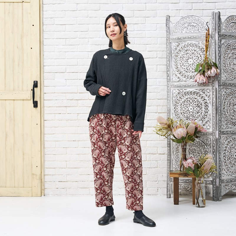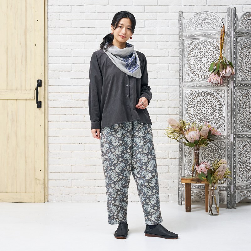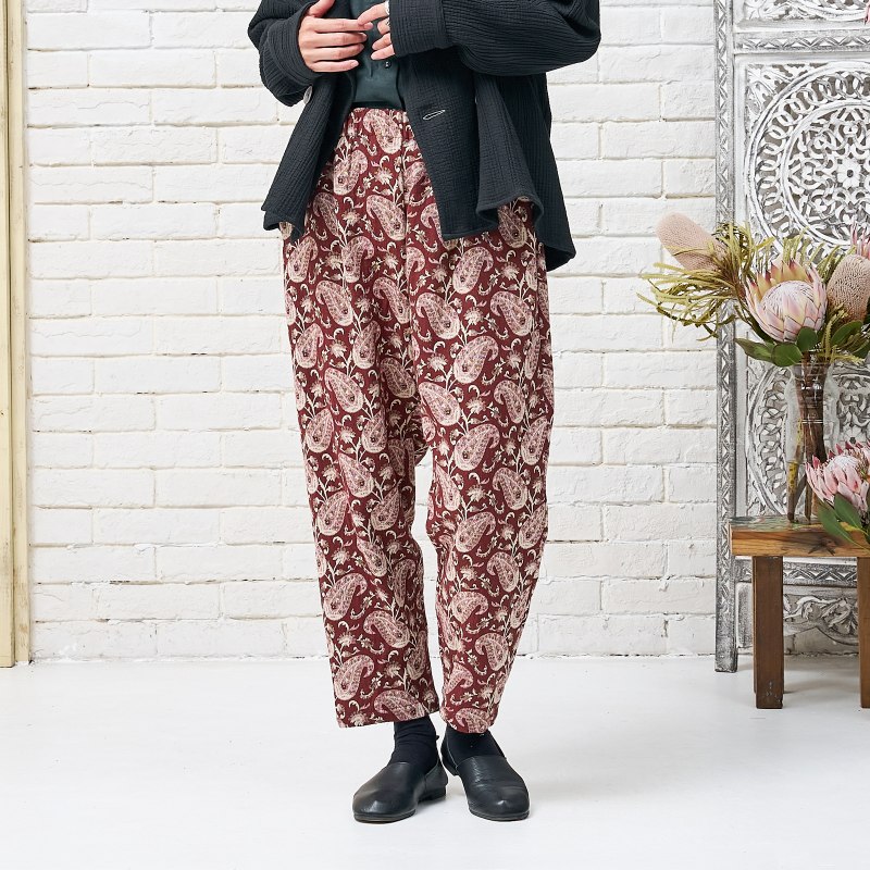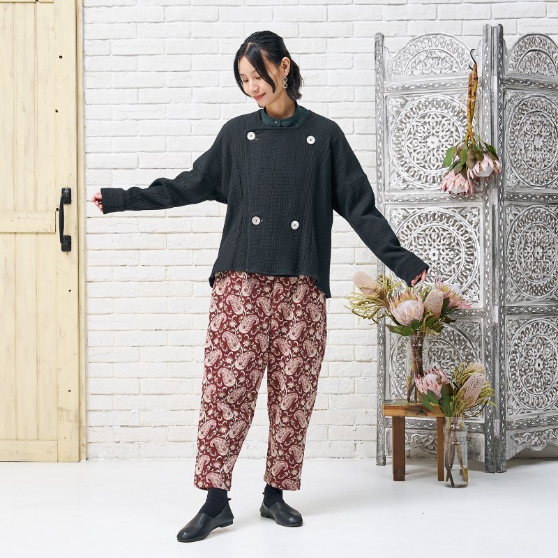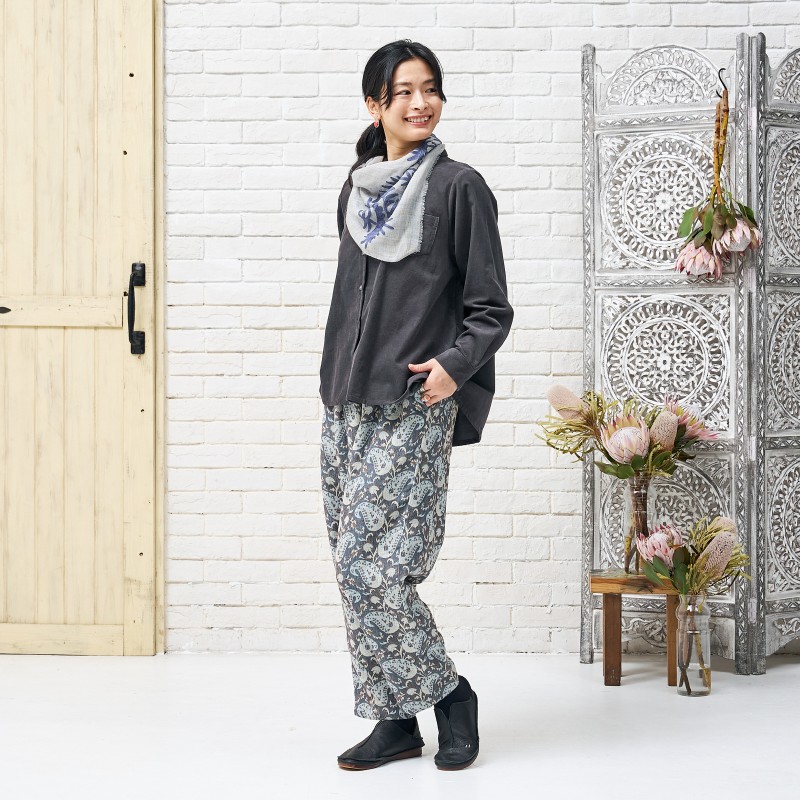 華やかな模様が目をひくペイズリー柄のパンツ。空気を含んだようなソフトな手触りが心地よく、日常使いにぴったりの一着。ゆったりとしたシルエットで着心地良いアイテム。柄物のボトムスは、落ち着いたカラーのトップスを合わせることで派手さを程よく抑えることができ、さりげない個性を感じさせる着こなしが楽しめます。