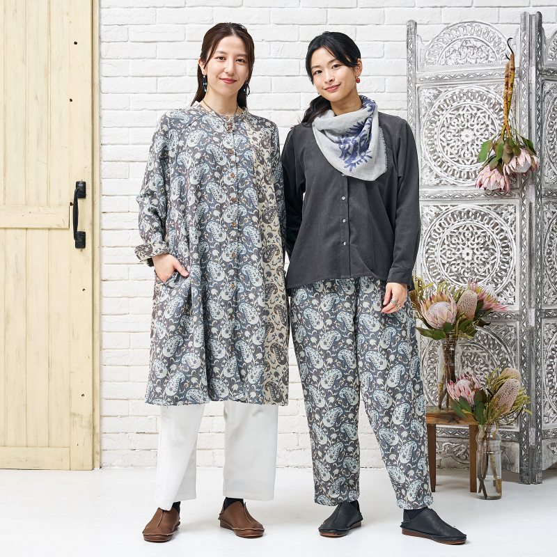 ヒンディー語で"村"という意味。都会の喧騒を離れて、自然のものと、自然に暮らす。そんな心地よい暮らしをテーマにしています。ナチュラルなで素朴な質感や着心地の良い素材。個性豊かで緩やかなシルエットが特徴のブランド。