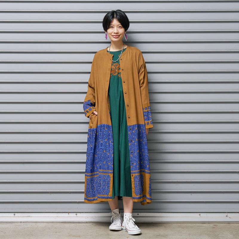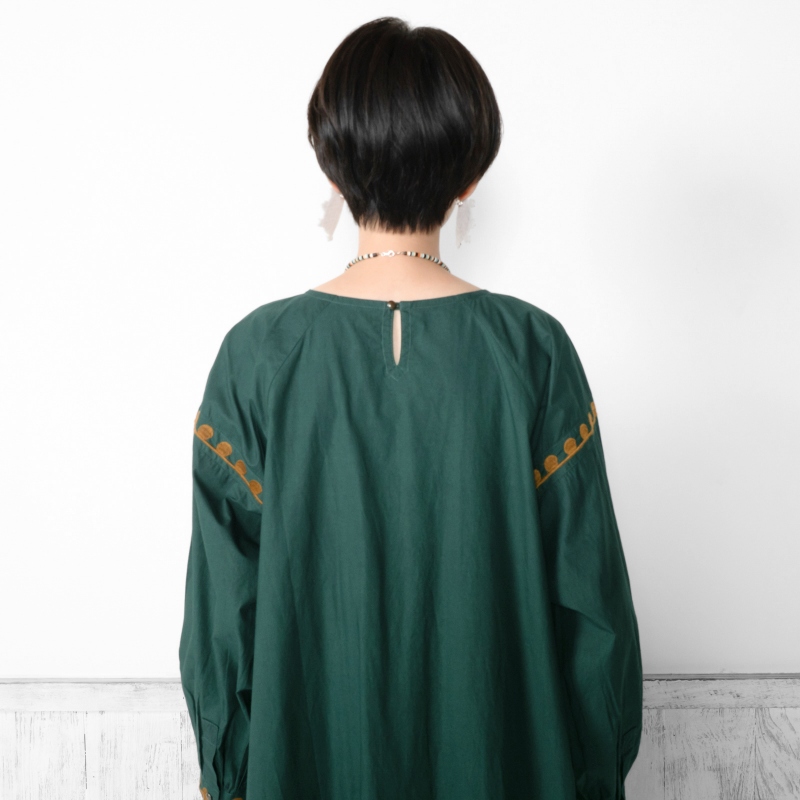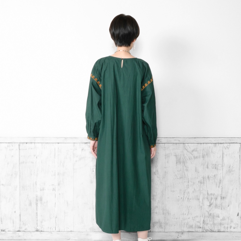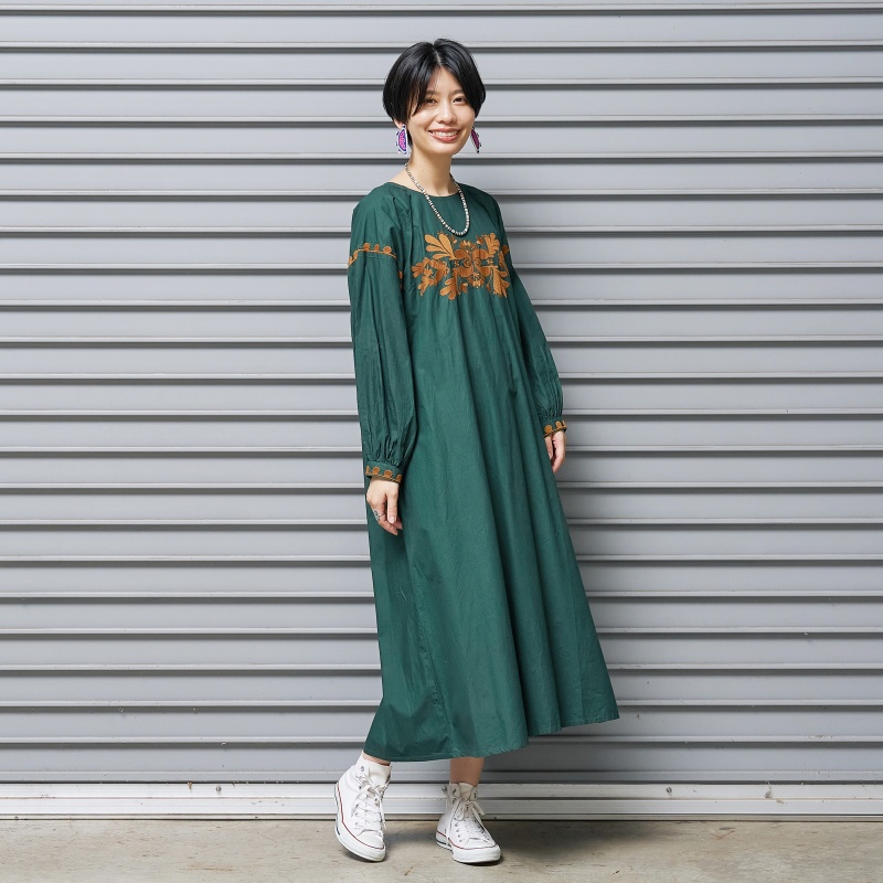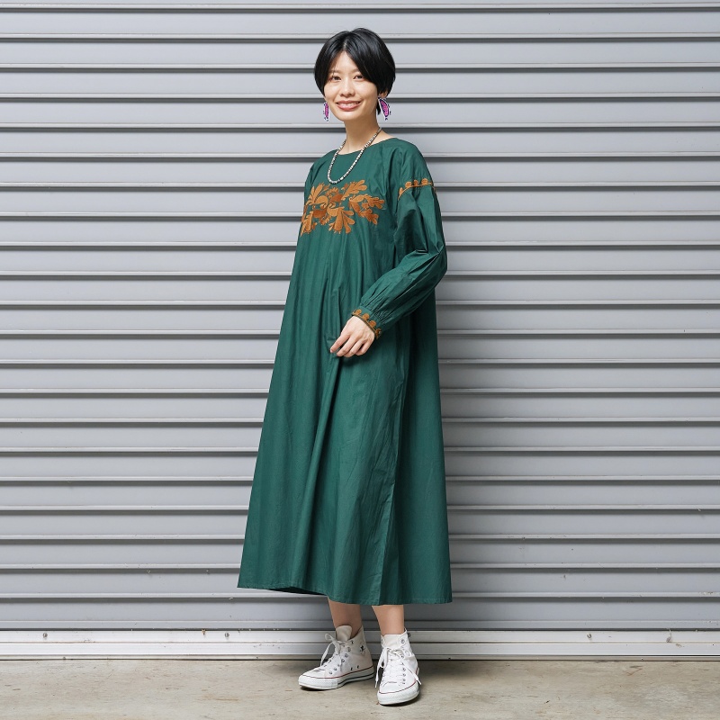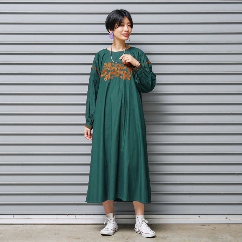 メリハリのある配色がポイントのワンピース。刺繍の柄が際立つブラック×レッドと、落ち着きのあるカラーのグリーン×ブラウンの2色展開。ギャザースリーブや部分刺繍など、ディテールにこだわったアイテム。やや光沢感のあるパリッとした質感の生地を使用し、高見え効果も期待。デイリー使いしやすいさりげないエスニック感が魅力。柄物のアイテムを合わせたり、カジュアルにデニムなど合わせた着こなしもおすすめ。