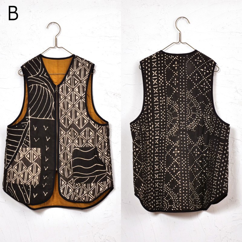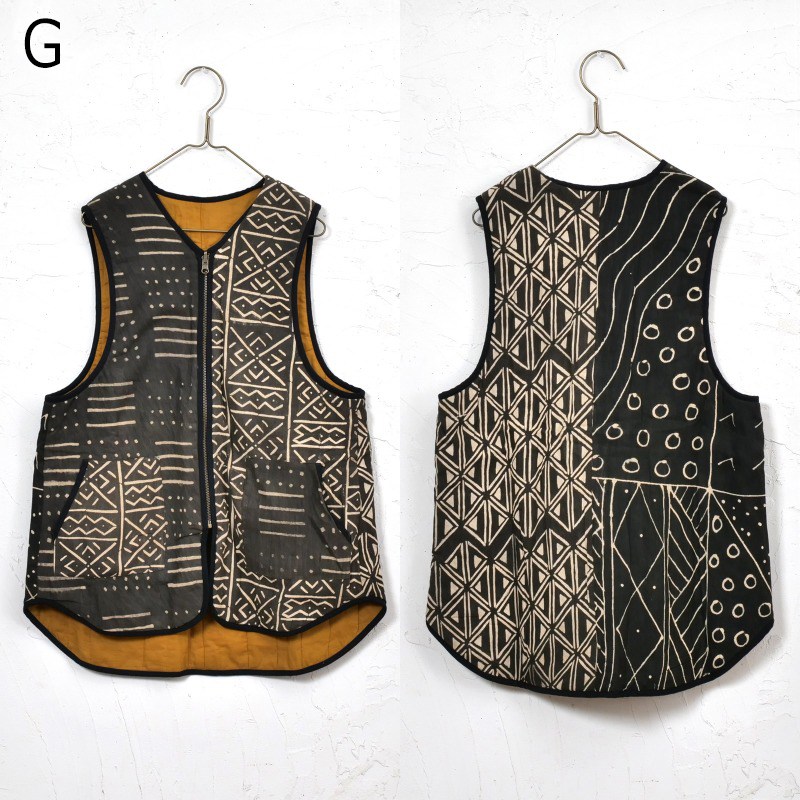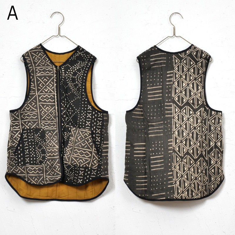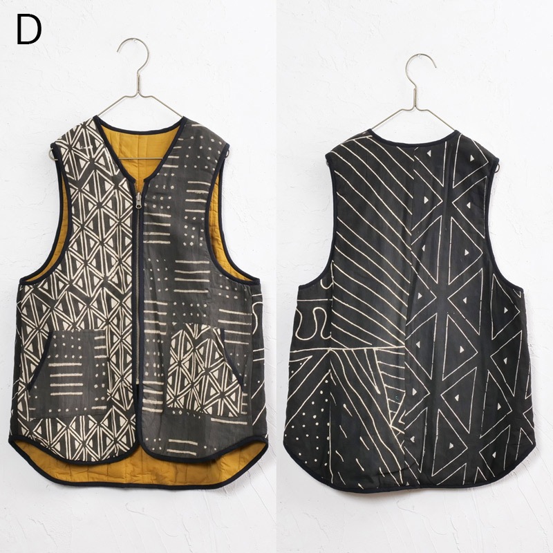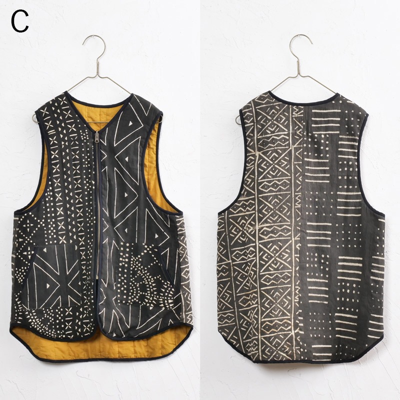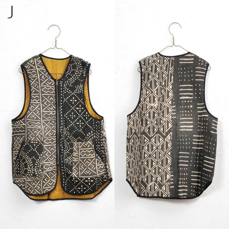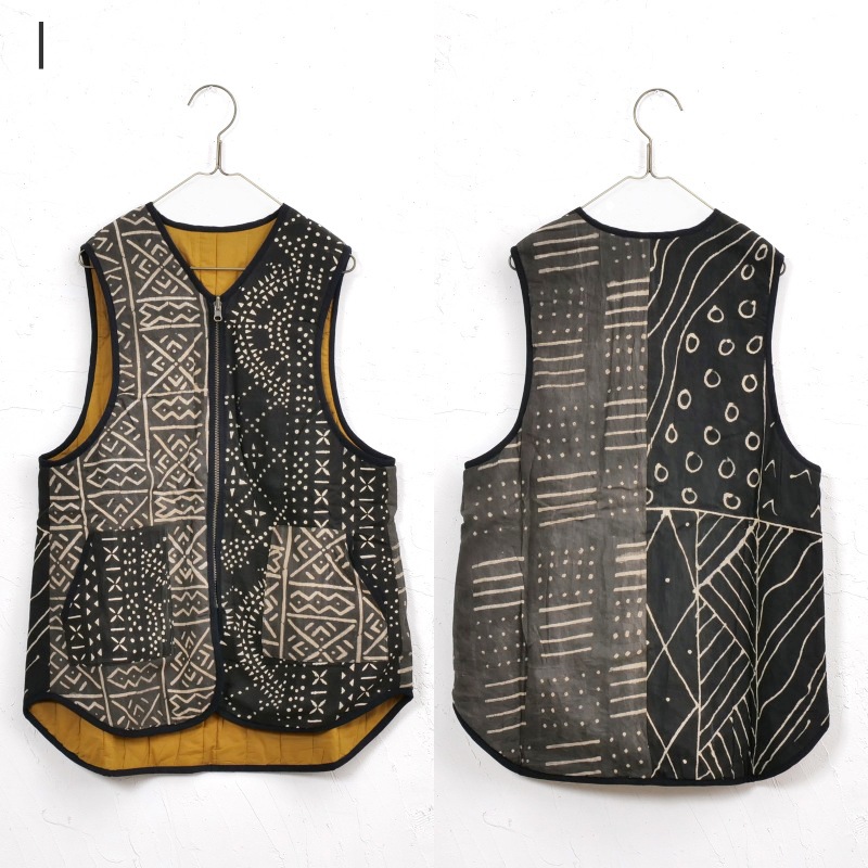 アフリカの泥染め布を大胆に用いたベスト。リバーシブル仕様で表が泥染め布、裏が無地のマスタードカラーでその日の着こなしに合わせて着ることができる1枚。アフリカの泥染め布ならではの幾何学模様がトラディショナルな雰囲気をプラス。薄手のキルティング生地なので、カジュアルな装いにもマッチし、ワンピースの上に合わせるのはもちろん、デニムなどのアイテムにも合わせやすく、幅広いコーディネートが楽しめる。