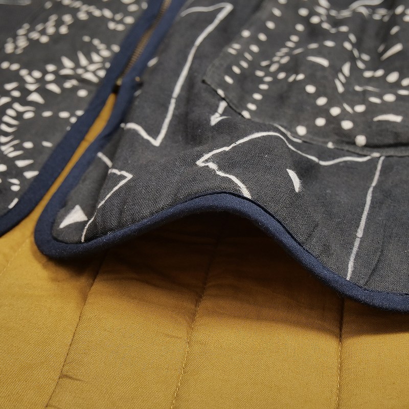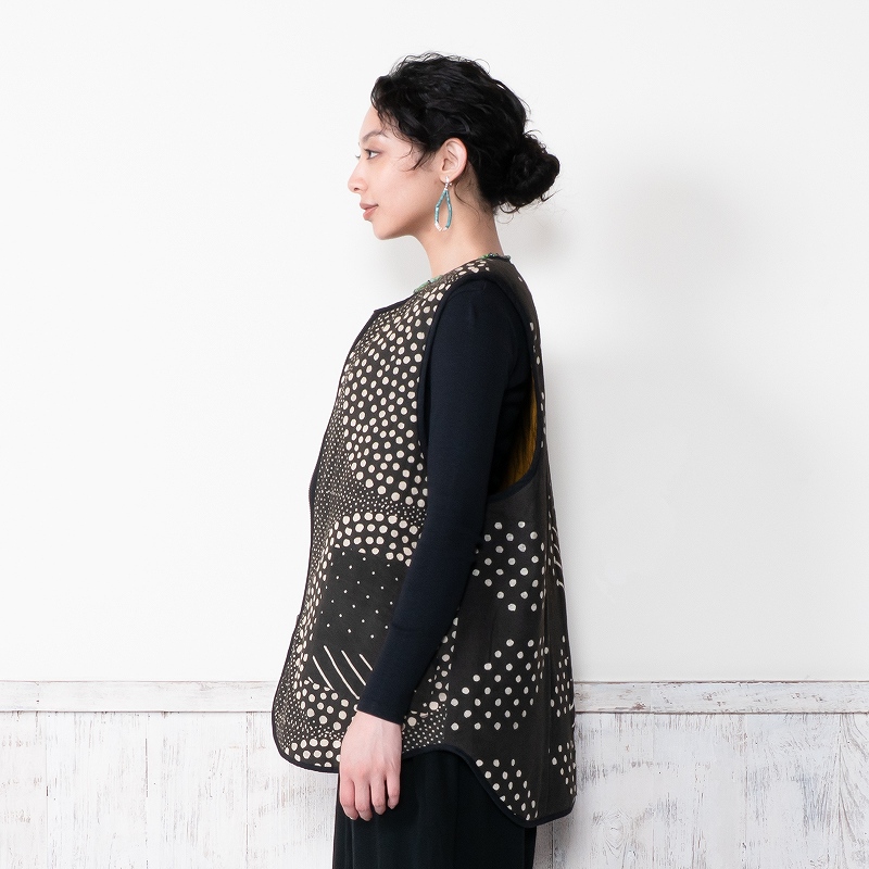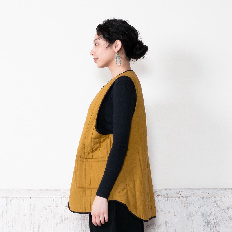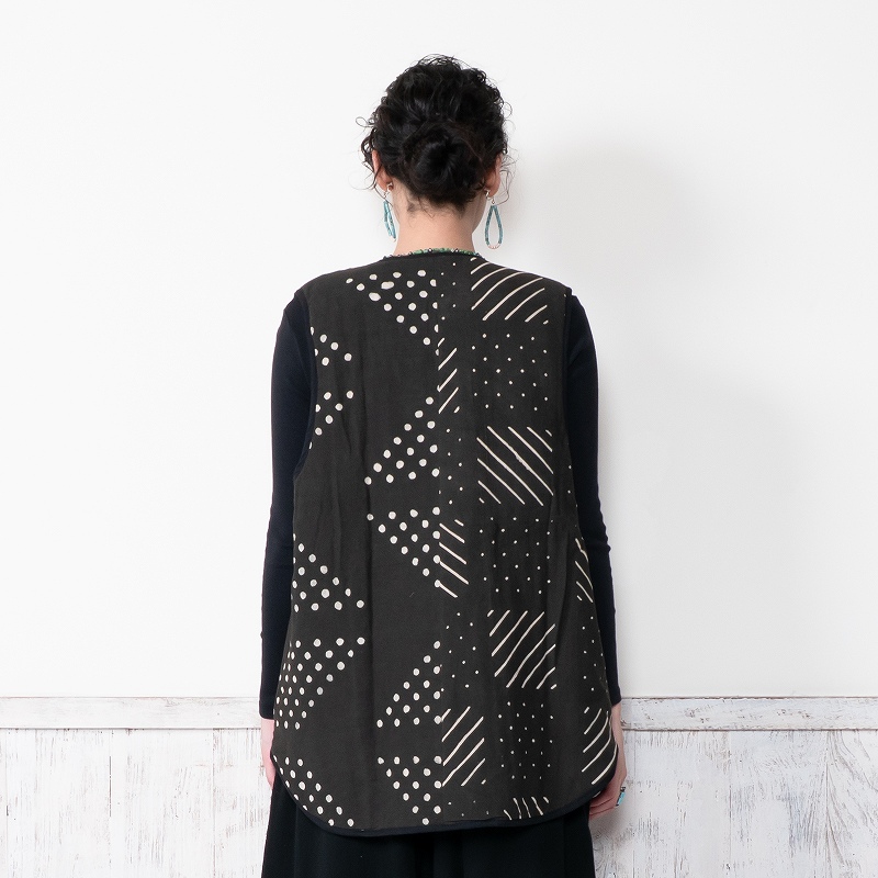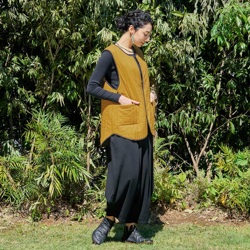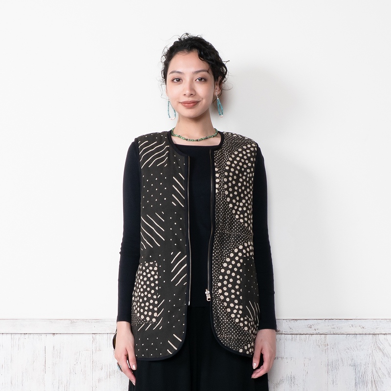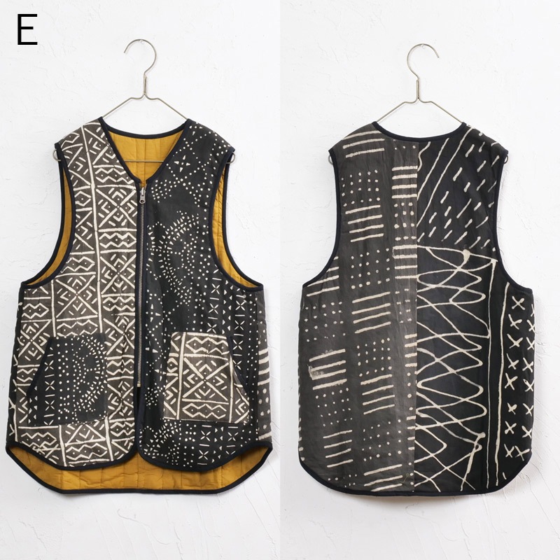 アフリカの泥染め布を大胆に用いたベスト。リバーシブル仕様で表が泥染め布、裏が無地のマスタードカラーでその日の着こなしに合わせて着ることができる1枚。アフリカの泥染め布ならではの幾何学模様がトラディショナルな雰囲気をプラス。薄手のキルティング生地なので、カジュアルな装いにもマッチし、ワンピースの上に合わせるのはもちろん、デニムなどのアイテムにも合わせやすく、幅広いコーディネートが楽しめる。