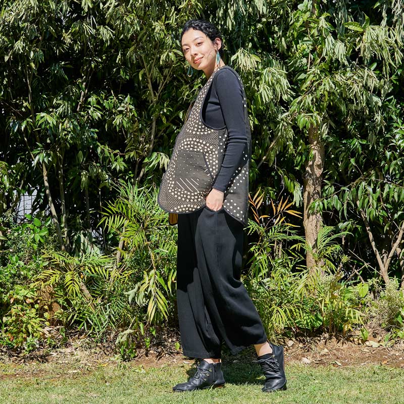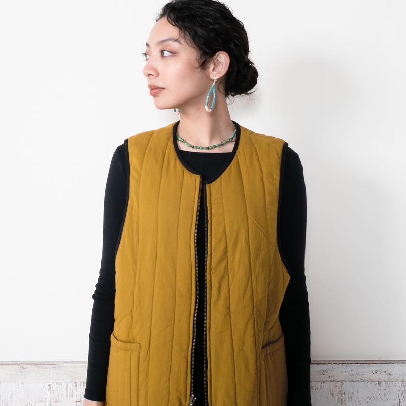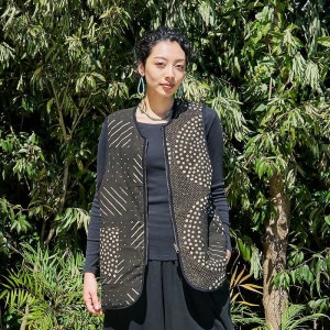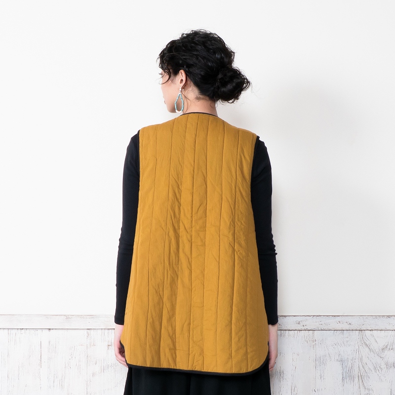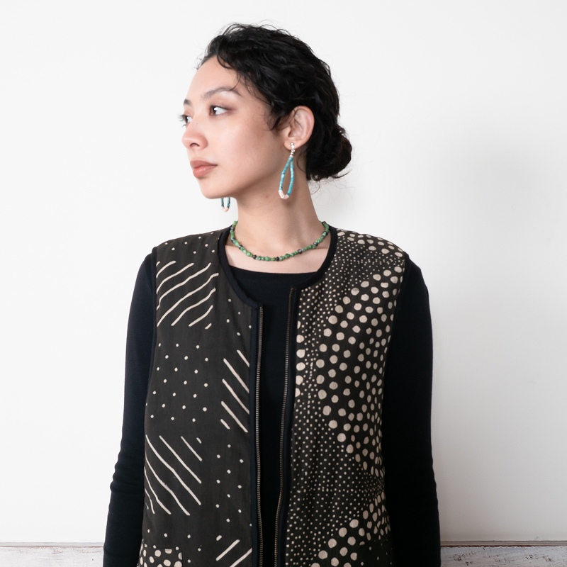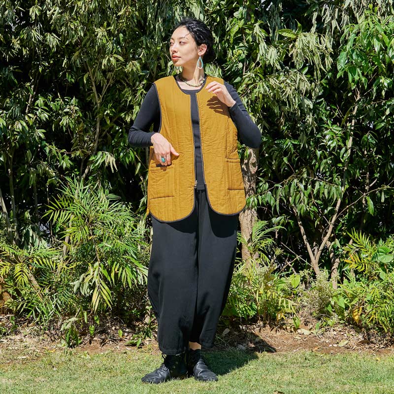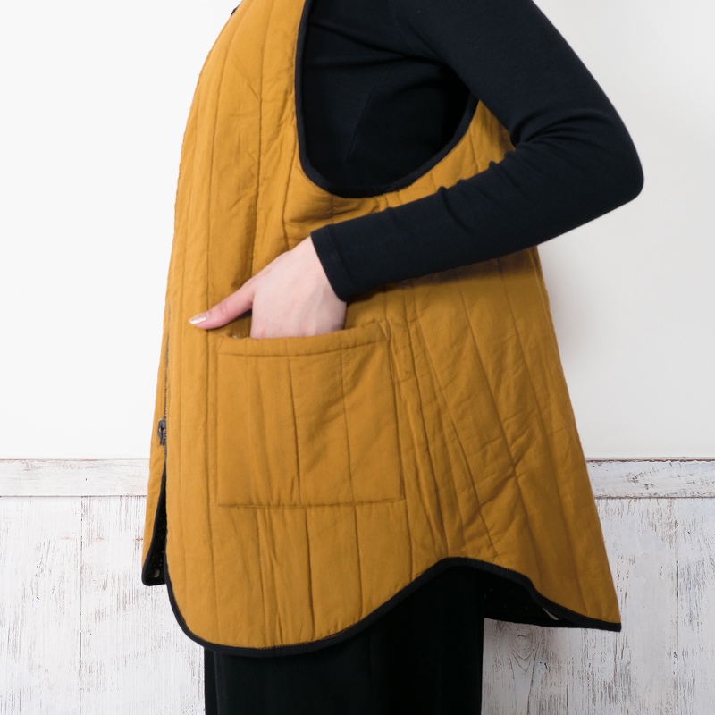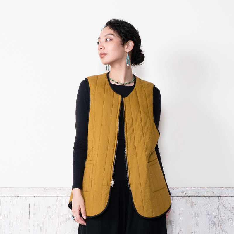 アフリカの泥染め布を大胆に用いたベスト。リバーシブル仕様で表が泥染め布、裏が無地のマスタードカラーでその日の着こなしに合わせて着ることができる1枚。アフリカの泥染め布ならではの幾何学模様がトラディショナルな雰囲気をプラス。薄手のキルティング生地なので、カジュアルな装いにもマッチし、ワンピースの上に合わせるのはもちろん、デニムなどのアイテムにも合わせやすく、幅広いコーディネートが楽しめる。