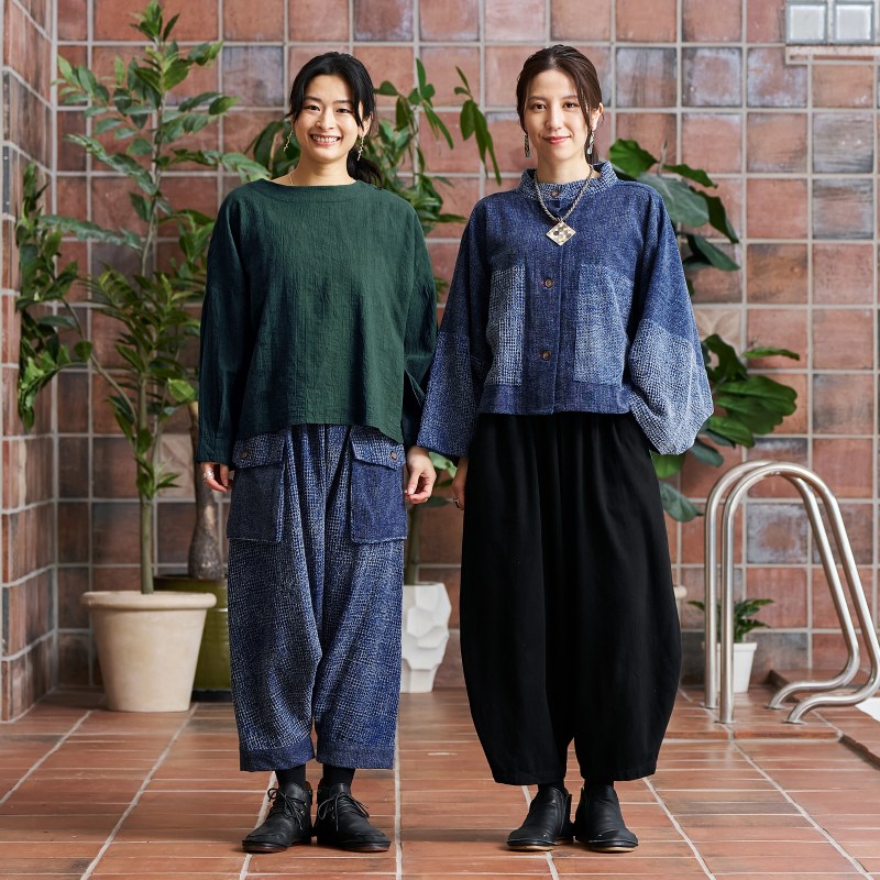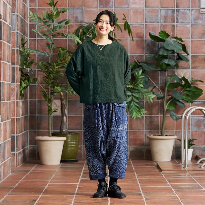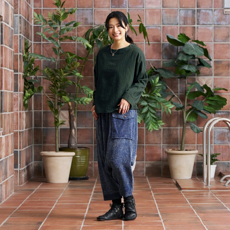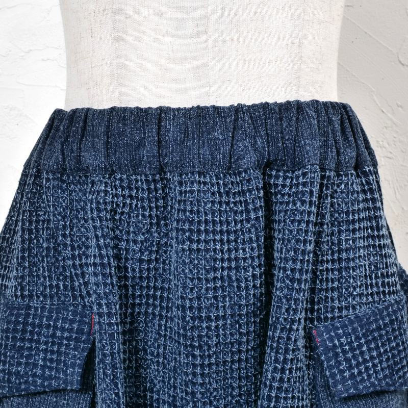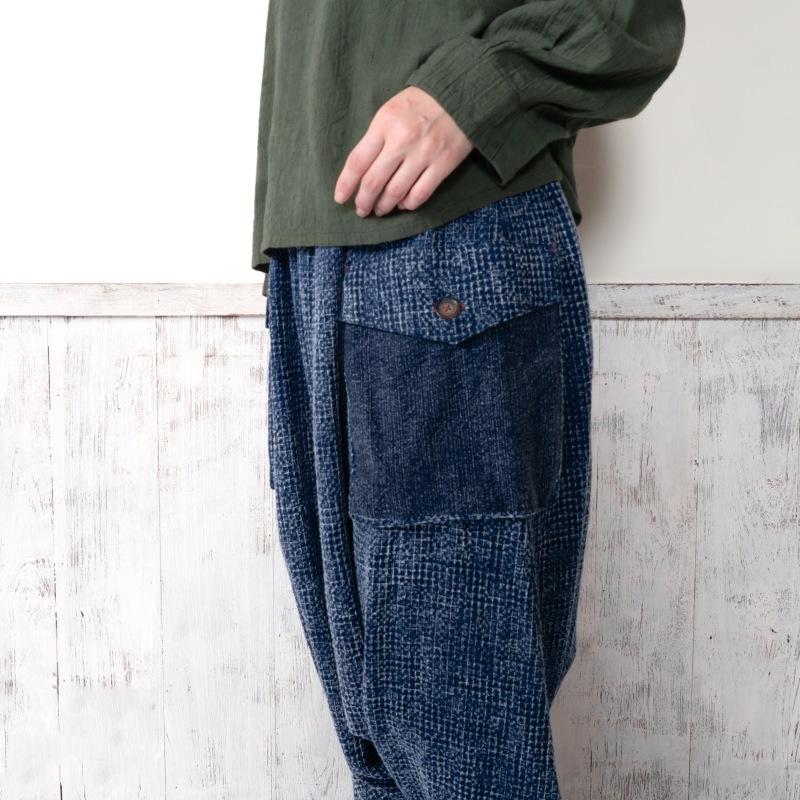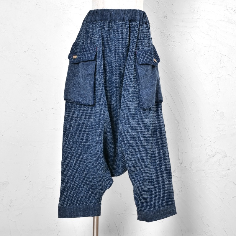 タイの藍染シリーズのサルエルパンツ。表情の異なる2 種類の生地を組合わせたデザイン。程よくルーズ感もあるゆったりとしたフォルムでリラックス感も抜群。シンプルな織り生地とワッフル生地のコンビ。ストーンウォッシュを掛けたヴィンテージ風な色合いが特徴。経年変化を楽しめる独特の風合いも魅力です。生地も厚過ぎずロングシーズン着こなせるアイテムです。