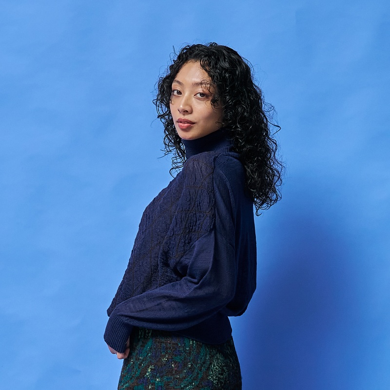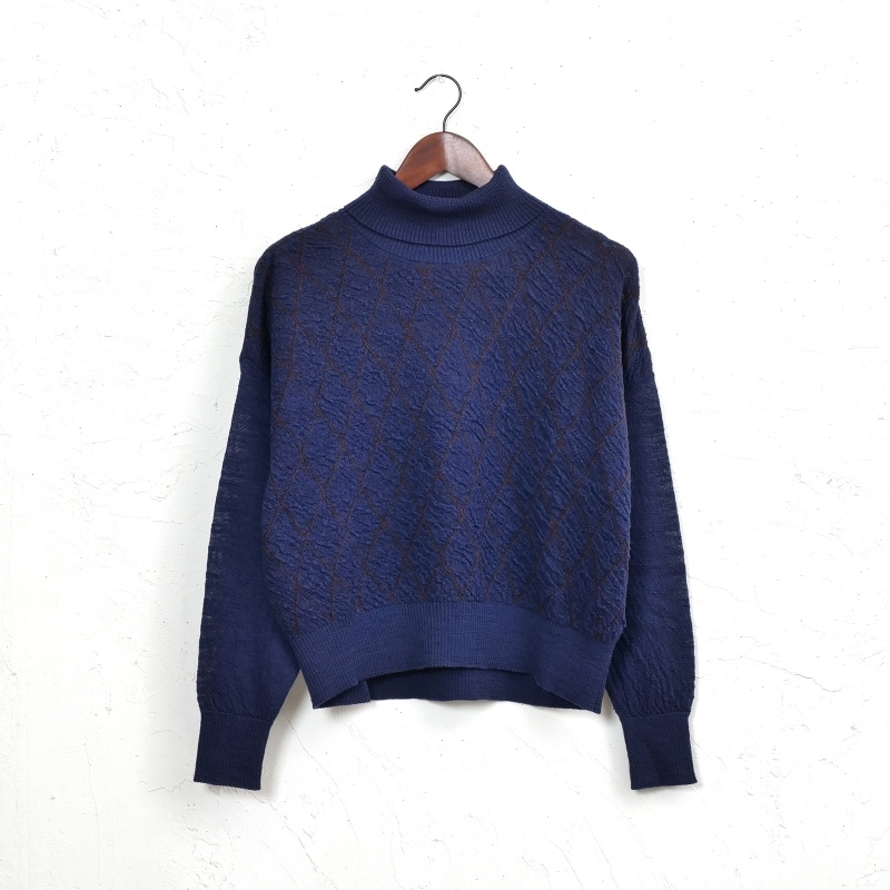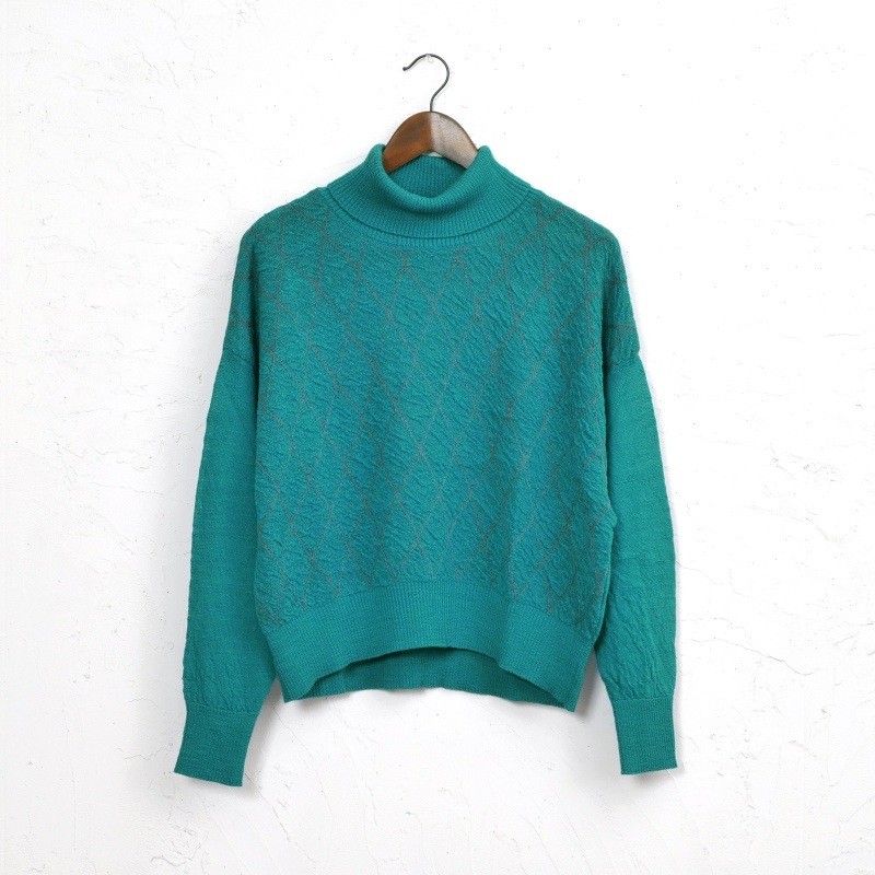 フロント部分に菱形の模様を施したタートルネックのセーターです。選び抜かれたウール100%の柔らかい肌触りが魅力のアイテムです。袖口と裾のリブを長めにデザインしました。ベーシックなブラックと発色の良いグリーン・ネイビーの3色展開です。密度が緩めのふんわりとした肌心地のニットは熟練の職人さんによる技が光ります。