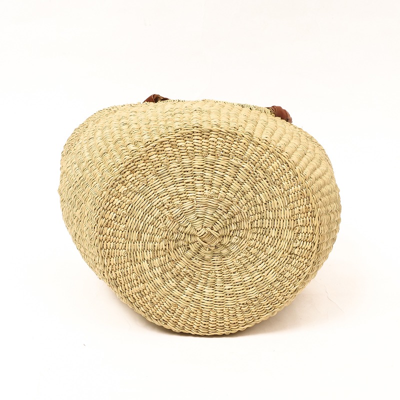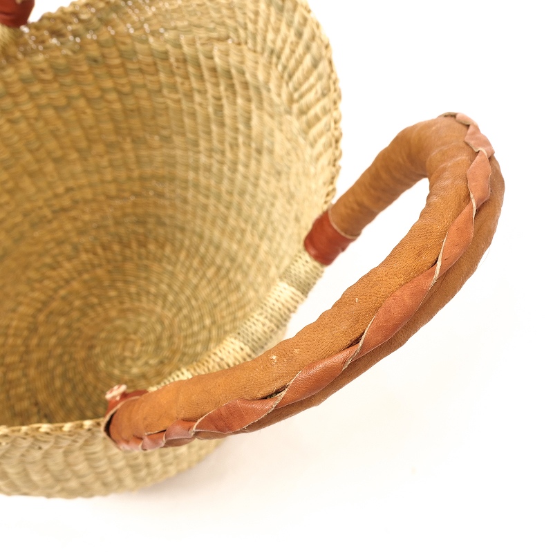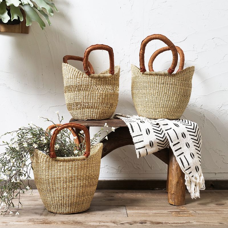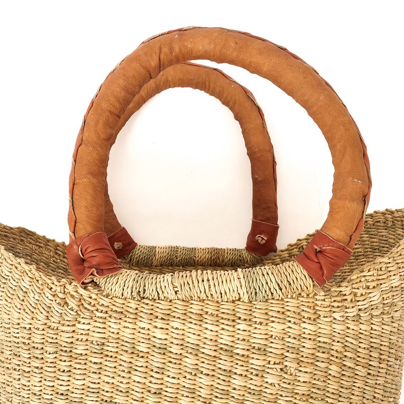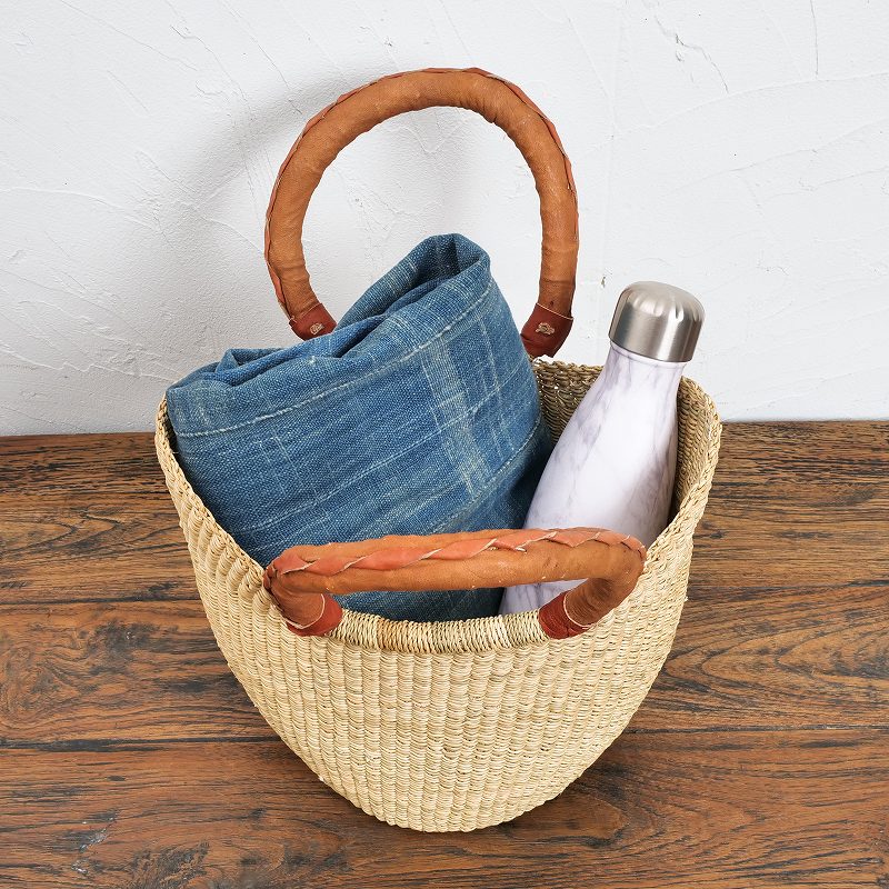 アフリカ・ガーナ北部の州都ボルガタンガで作られるバスケットは、ナチュラルな風合いとアフリカらしいカラフルさで世界中で人気。エレファントグラスと呼ばれる水草を用いボルガタンガでバスケットが編まれ、その後ブルキナファソの革職人に送られ山羊革のハンドルを着けられます。「ボルガバスケット」「ブルキナバスケット」のふたつの名があるのはそのため。エレファントグラスはイネ科の植物で水に強く、ロープに用いられるほど強靭な繊維。そのバスケットは弾力性があり丈夫で長持ち、汚れたら水でザブザブ洗えるのも魅力。現地では買い物などに使われ生活に欠かせないアイテムです。