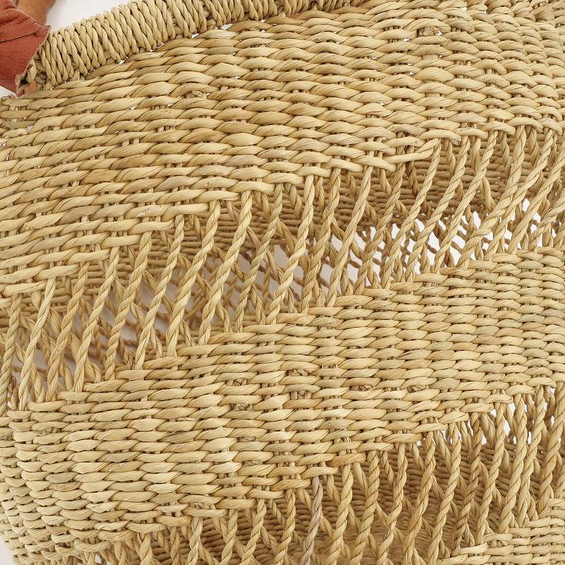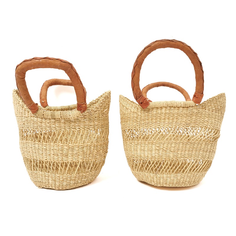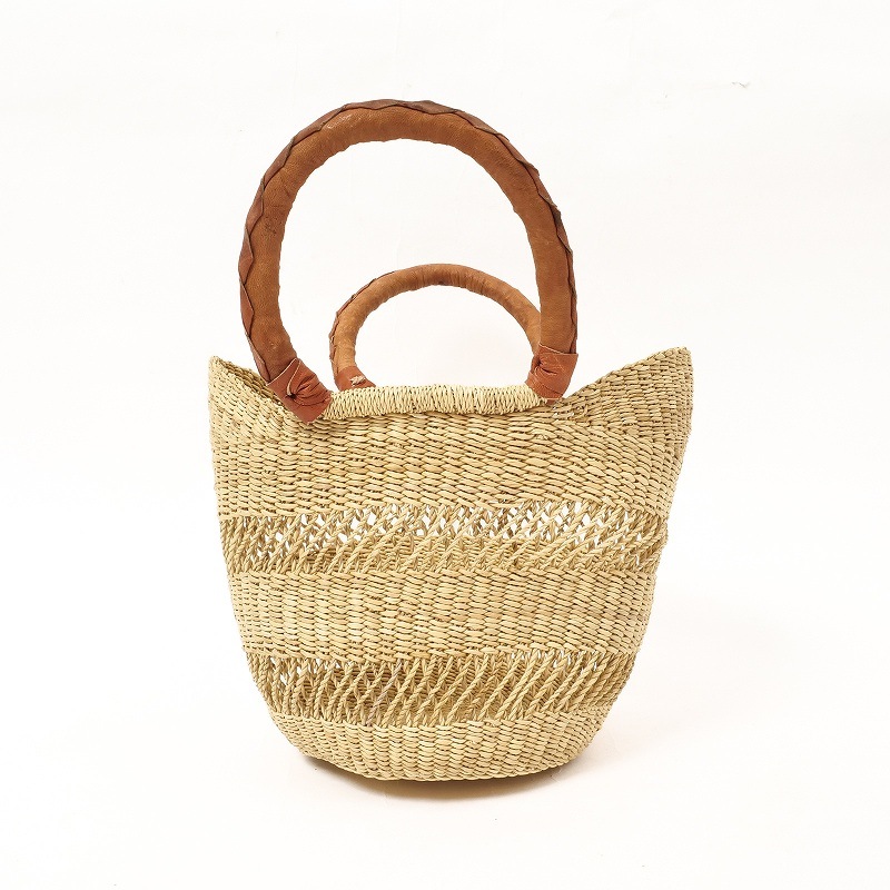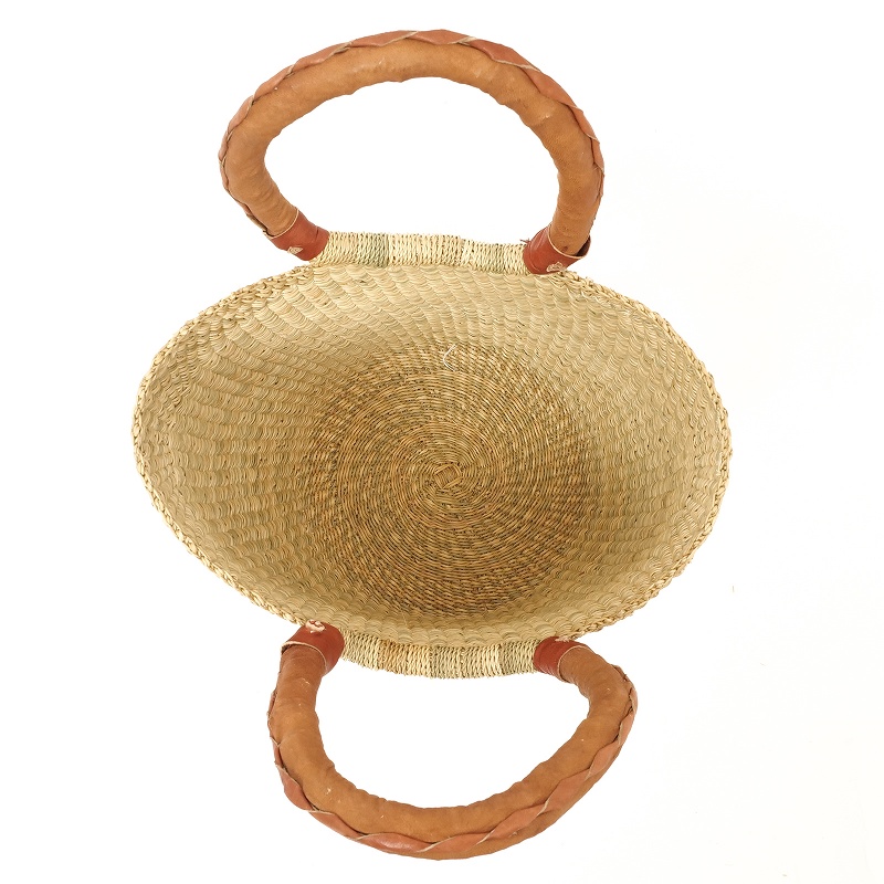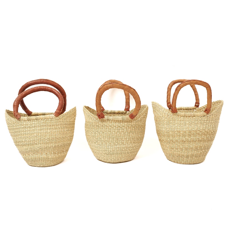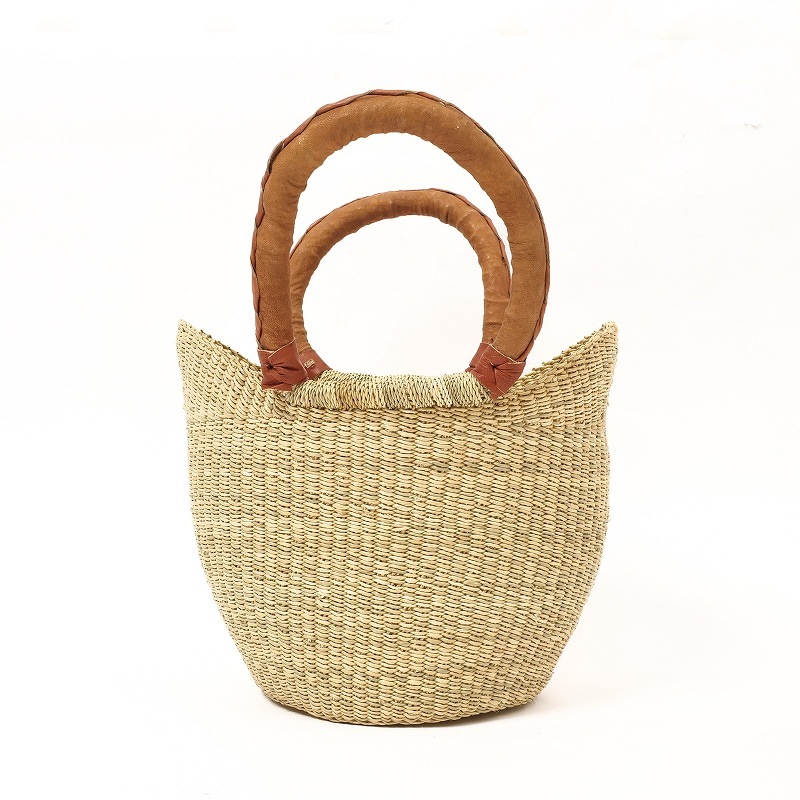 アフリカ・ガーナ北部の州都ボルガタンガで作られるバスケットは、ナチュラルな風合いとアフリカらしいカラフルさで世界中で人気。エレファントグラスと呼ばれる水草を用いボルガタンガでバスケットが編まれ、その後ブルキナファソの革職人に送られ山羊革のハンドルを着けられます。「ボルガバスケット」「ブルキナバスケット」のふたつの名があるのはそのため。エレファントグラスはイネ科の植物で水に強く、ロープに用いられるほど強靭な繊維。そのバスケットは弾力性があり丈夫で長持ち、汚れたら水でザブザブ洗えるのも魅力。現地では買い物などに使われ生活に欠かせないアイテムです。