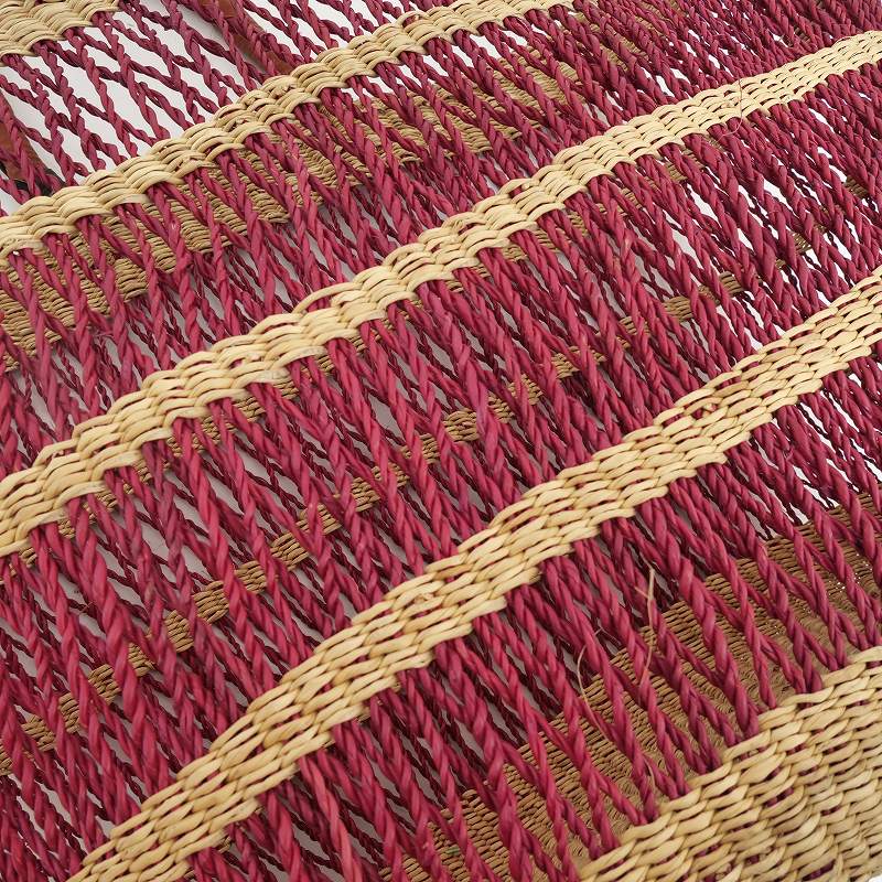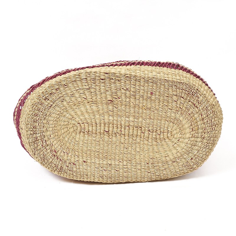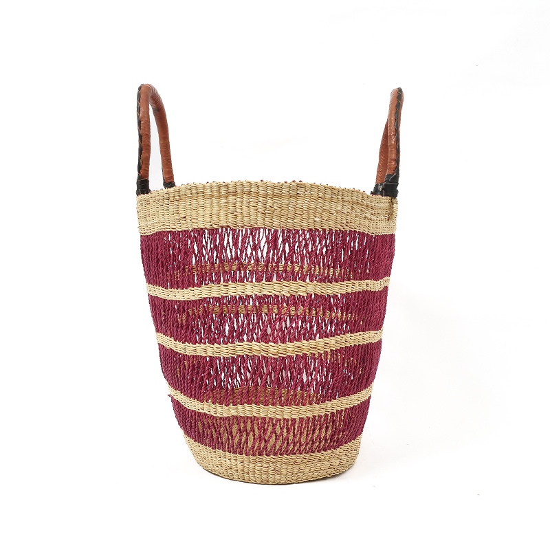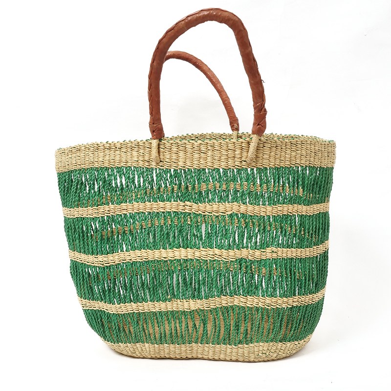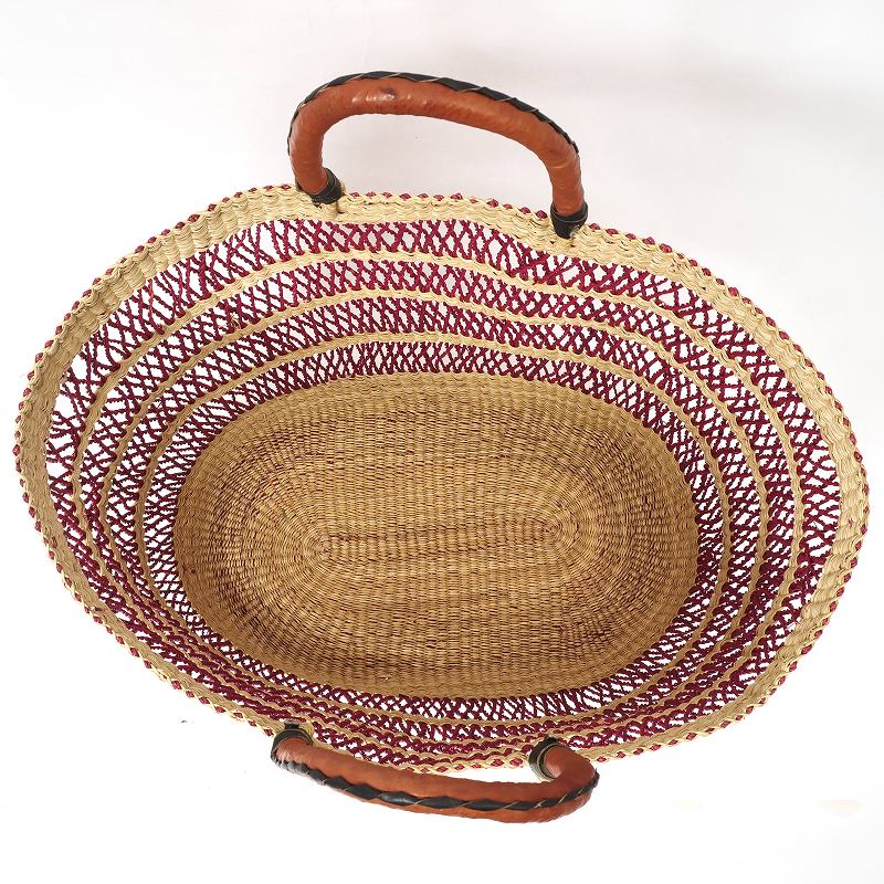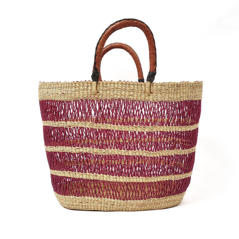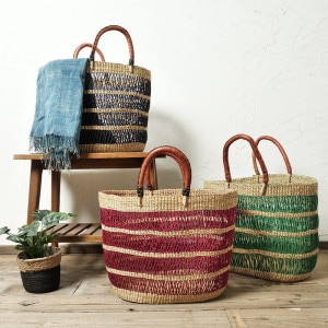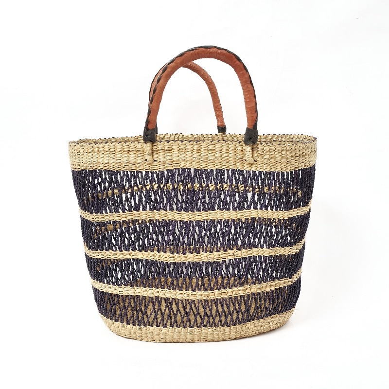 アフリカ・ガーナ北部の州都ボルガタンガで作られるバスケットは、ナチュラルな風合いとアフリカらしいカラフルさで世界中で人気。エレファントグラスと呼ばれる水草を用いボルガタンガでバスケットが編まれ、その後ブルキナファソの革職人に送られ山羊革のハンドルを着けられます。「ボルガバスケット」「ブルキナバスケット」のふたつの名があるのはそのため。エレファントグラスはイネ科の植物で水に強く、ロープに用いられるほど強靭な繊維。そのバスケットは弾力性があり丈夫で長持ち、汚れたら水でザブザブ洗えるのも魅力。現地では買い物などに使われ生活に欠かせないアイテムです。