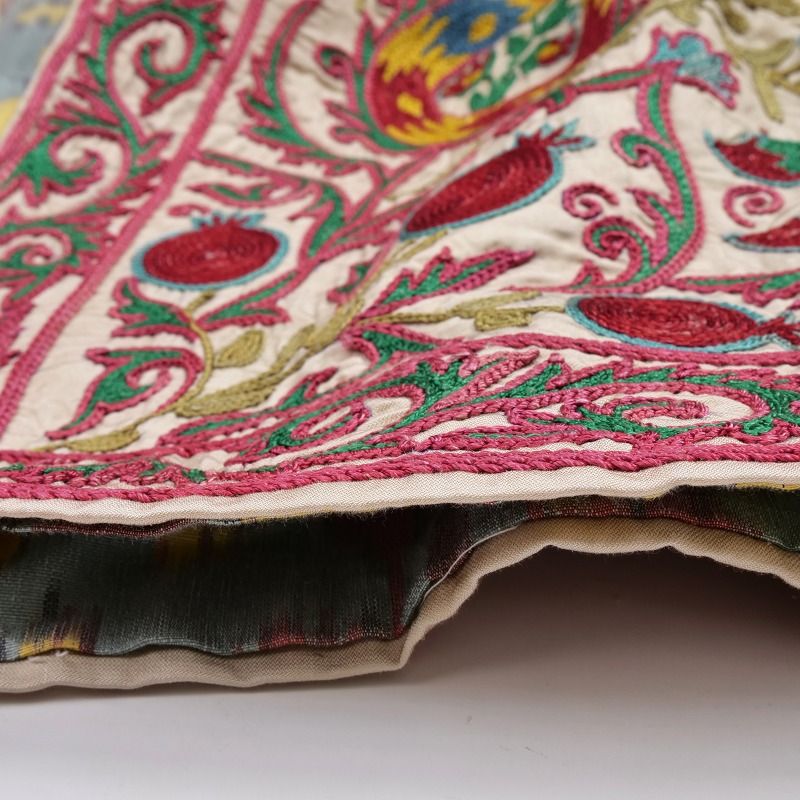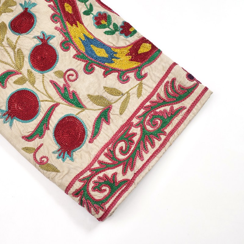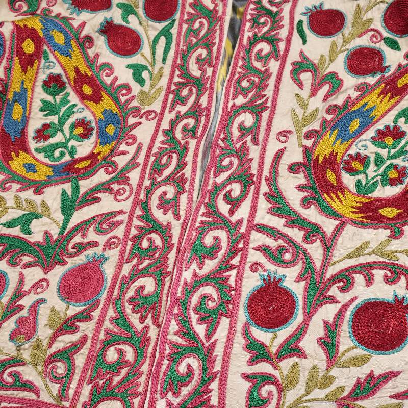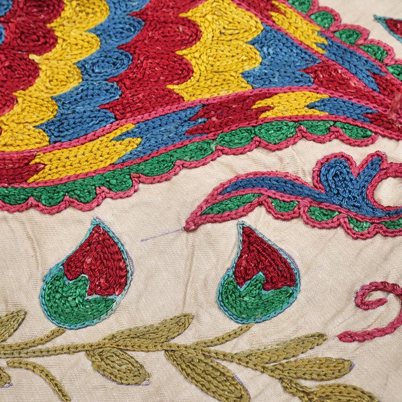 カザフスタンからウズベキスタン、キルギス、タジキスタン、トルクメニスタン、アフガニスタンにかけて広く見られる伝統技法で、チェーンステッチやカウチンぐステッチによってびっしりと施された刺繍には立体感があり、中央アジアならではの美しい配色や繊細な絵柄が表現されています。