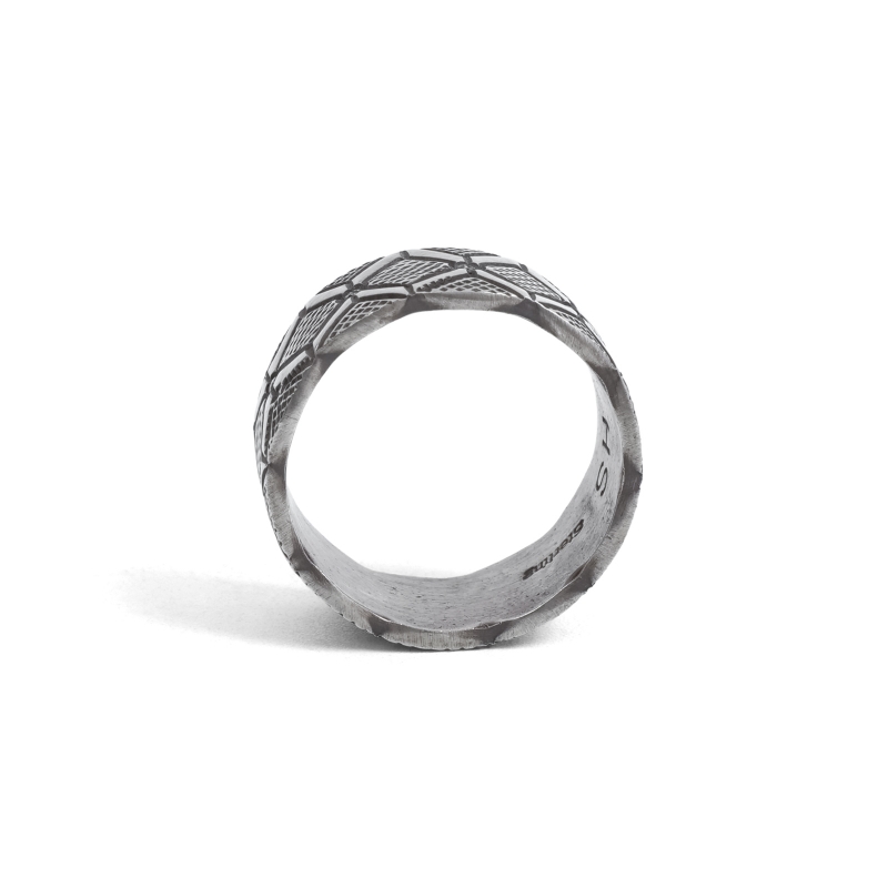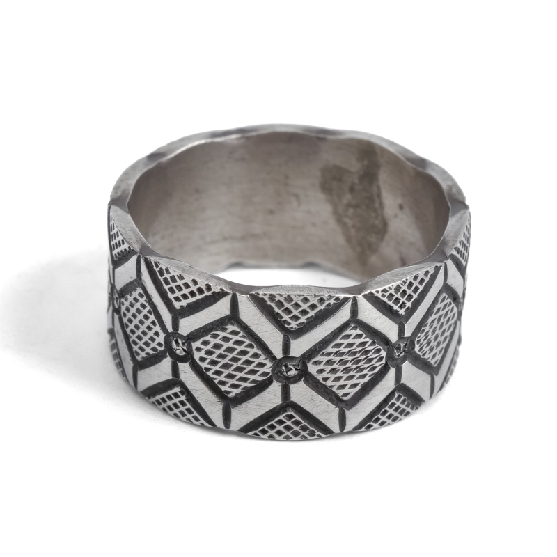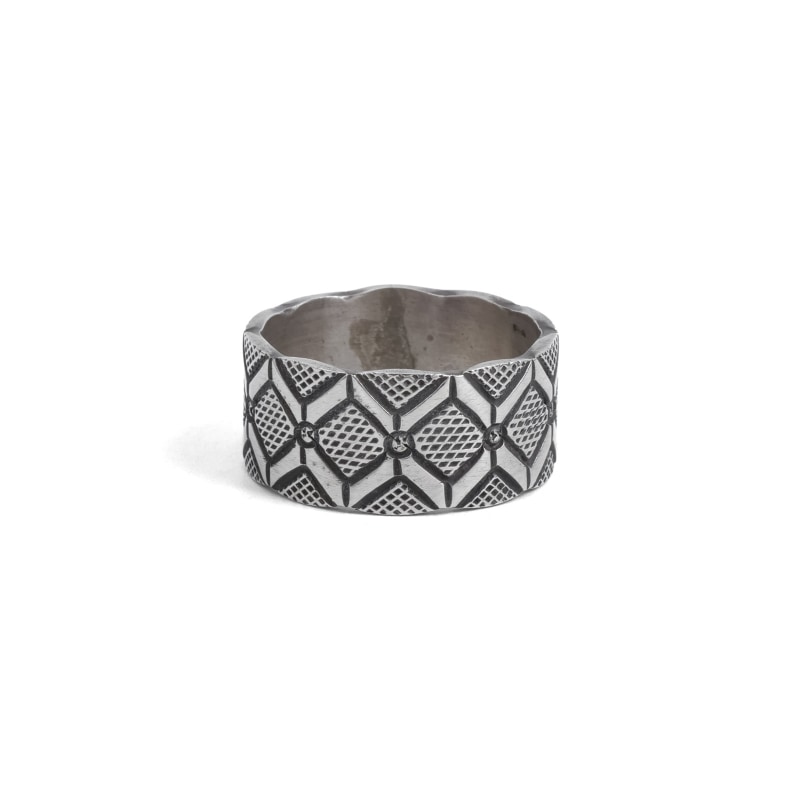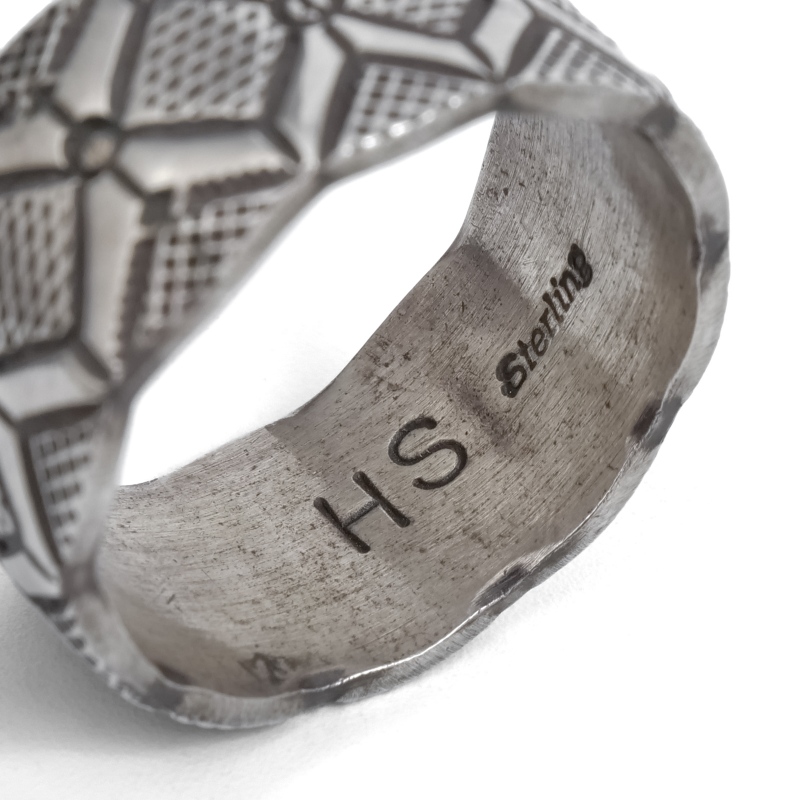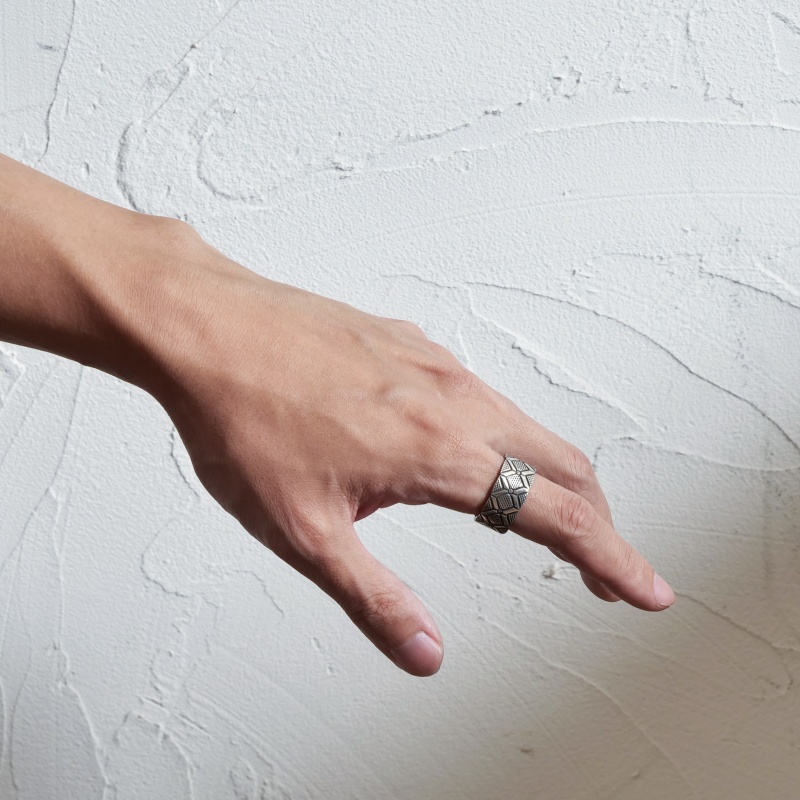 ハーマンスミスのスタンプワークリングです。艶消し肉厚なシルバーにテクスチャとラインのタガネでラグを思わせるスタンプが打たれています。仕立ての丁寧さはリングの継ぎ目がほとんどわからないほど。普段使いのリングとして使いやすく経年変化も楽しみ。