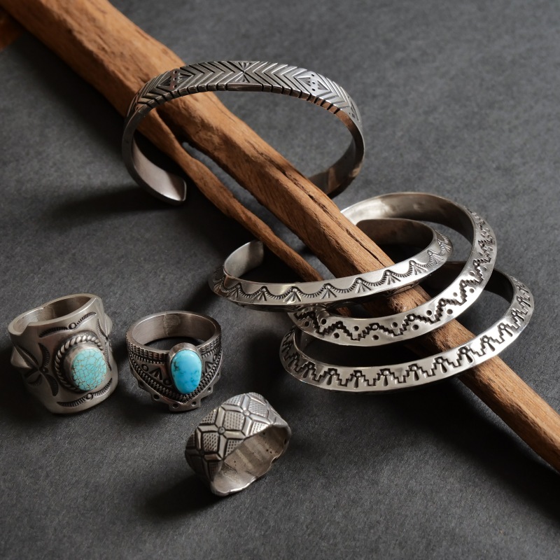 | ご注意 | ※ハンドクラフト特有のゆがみ・ずれ等がある為、表記サイズには多少の誤差がございます。 ※銀は経年で硫化する為、画像より黒ずみが増える、またはより綺麗に磨かれてのお届けとなる場合がございます。 ※インディアンジュエリーは伝統的な手仕事による製法上キズ・銀面のムラ・接合のラフさなどが多く見られるジュエリーです。味わいのうちとしてお楽しみください。 |