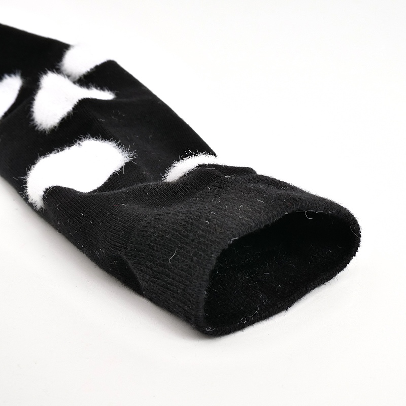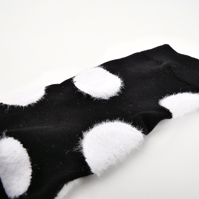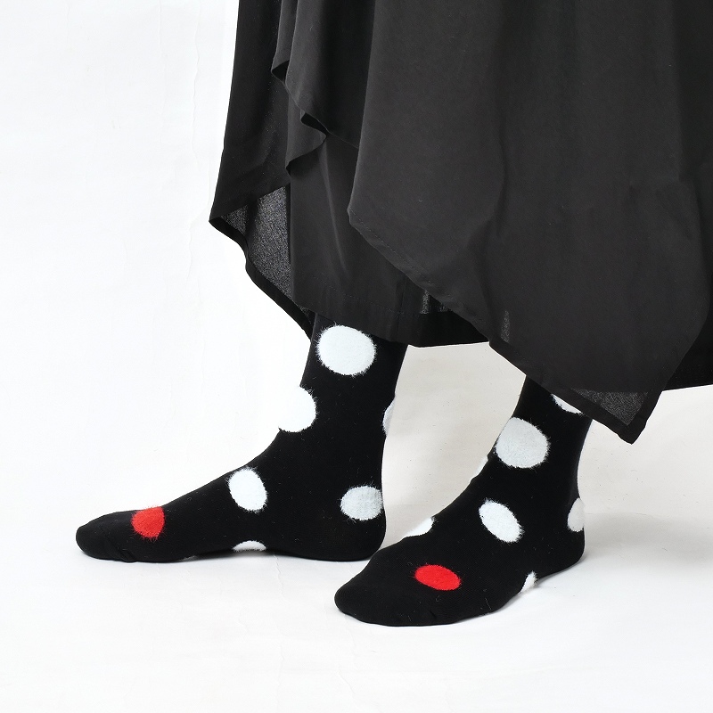 BLACK MALAIKAのひざ下丈のドットソックス。ランダムに配置されたドット部分は毛足の長い起毛になっています。つま先部分に1カ所赤いドットがあり、靴を脱いだ時だけ見える遊び心のあるデザイン。BLACK MALAIKAのパンツとのトータルコーディネートがおすすめ。