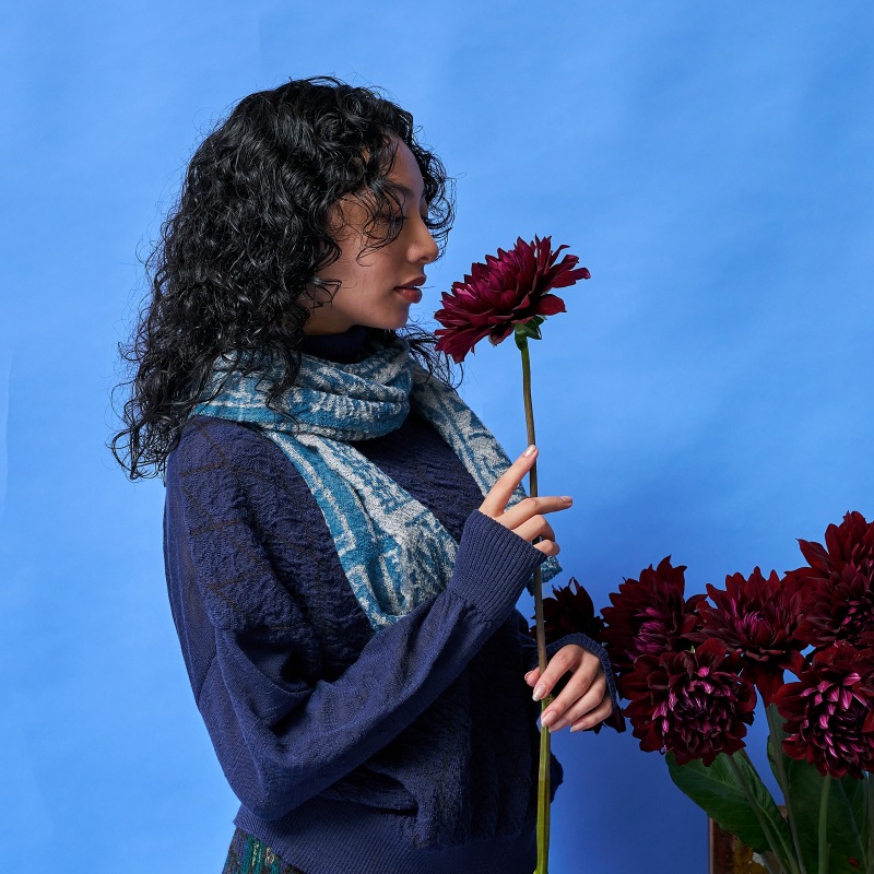 アフリカンファブリックのバミレケ布の柄を落とし込んだストールです。選び抜かれたウール100%の柔らかい肌触りが魅力のアイテムです。幅が広すぎず、程よいサイズ感です。ブラック・ブラウン・ブルー使いやすい3色展開です。密度が緩めのふんわりとした肌心地のニットは熟練の職人さんによる技が光ります。