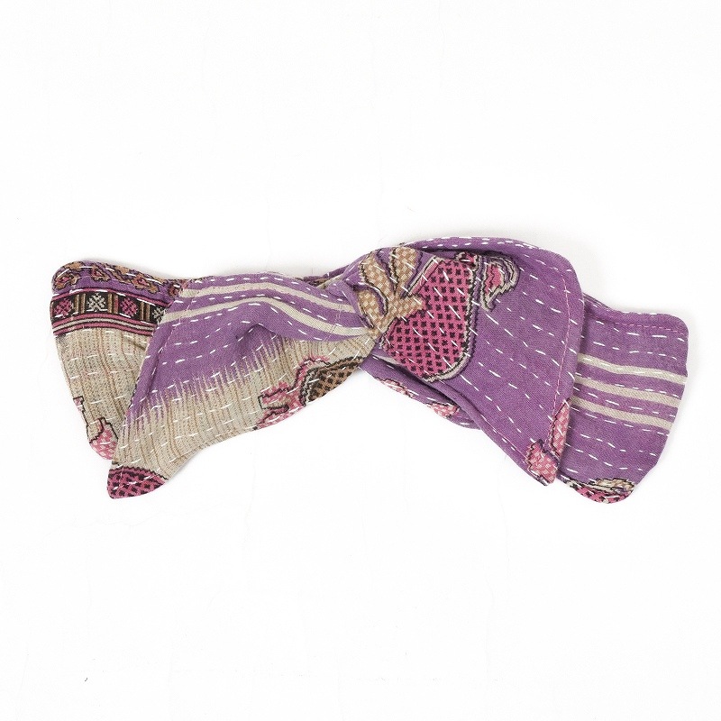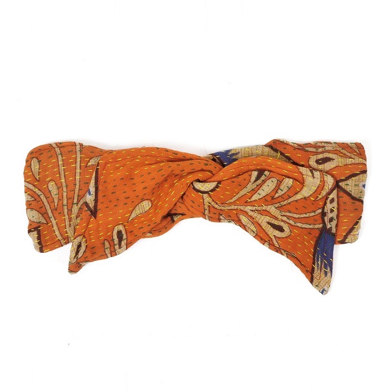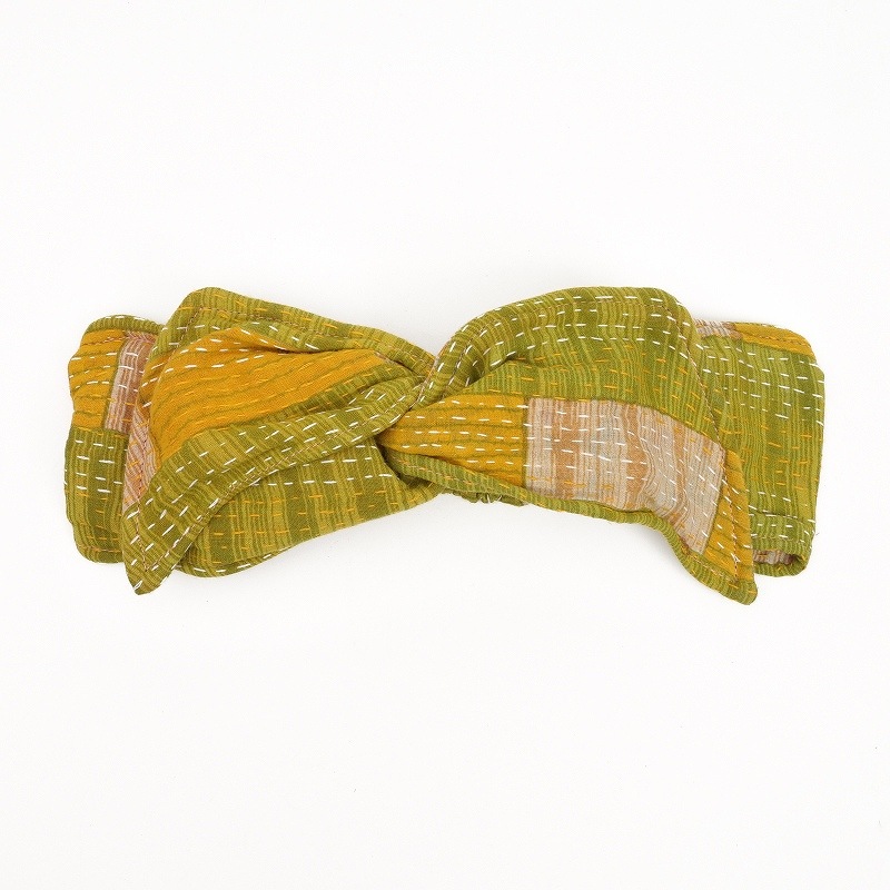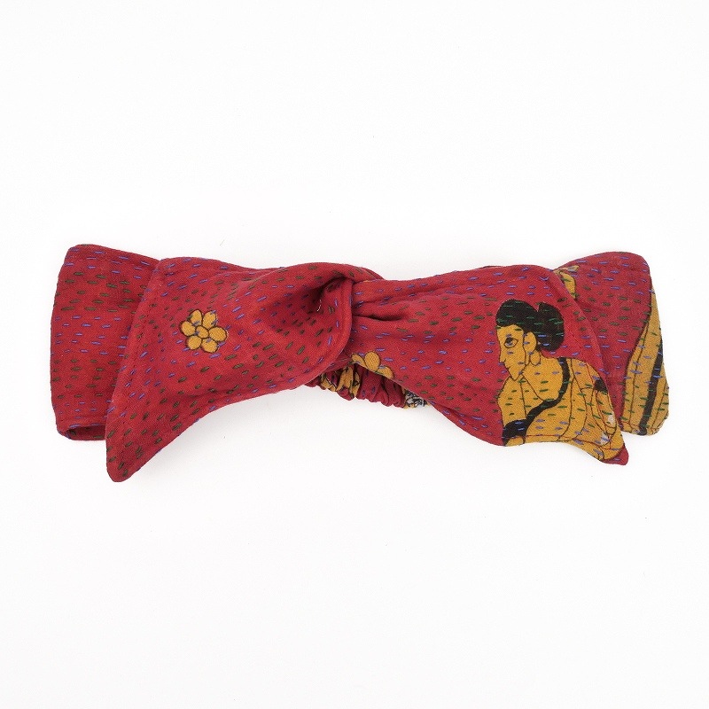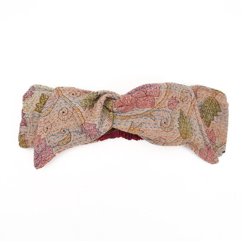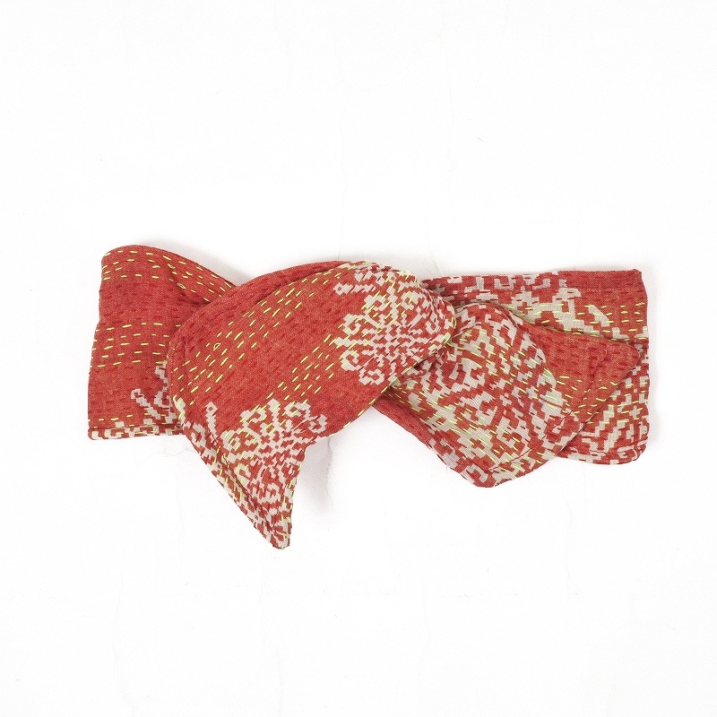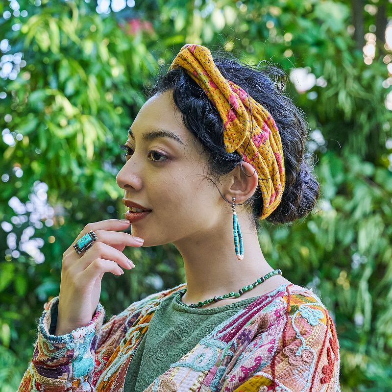 コットングドゥリーを使ったワイヤー入りヘアーバンド。頭囲サイズやゴムのきつさ・ゆるさを気にせず使えます。ゴム部分を首の後ろにあててワイヤーリボンを前に持って来て左右を交差し、先端を頭の形に沿って寝かせて着用します。リボン部分を広げて幅広ヘアーバンドにも、キュッと細くしても、交差させる部分をセンターにしたり横にずらしたり、リボンの先端の形を少し下向きにしたりワイヤー入りならではの形の変化を楽しめます。「既存のヘアーバンドはちょっとキツイ・ゆるい」、「リボンやスカーフをターバンにするとずれてきてしまう」そんな方にも安心しておすすめできます。色柄は全て1点ものです。