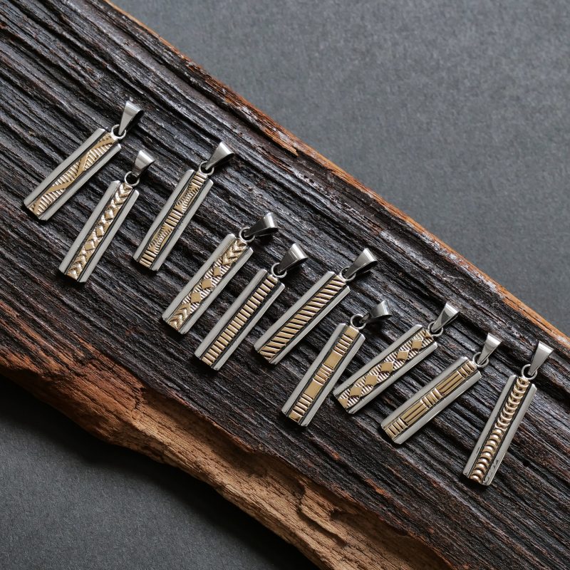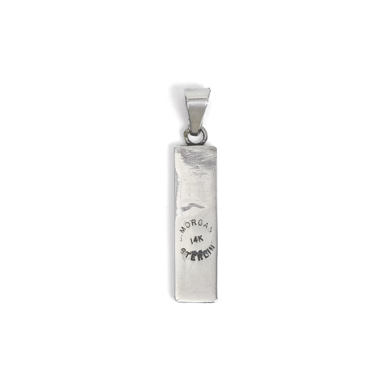 ブルースモーガンの14Kツートーンペンダントです。 細身のシルバープレートに14金を薄くオーバーレイしひとつひとつスタンプを打ち込んだ1点。シンプルモダンなブルース作品はインディアンジュエリーとしての枠を超え、装いを選ばないユニセックスなファッションジュエリーとして人気、ペアジュエリーやギフトにも最適です。