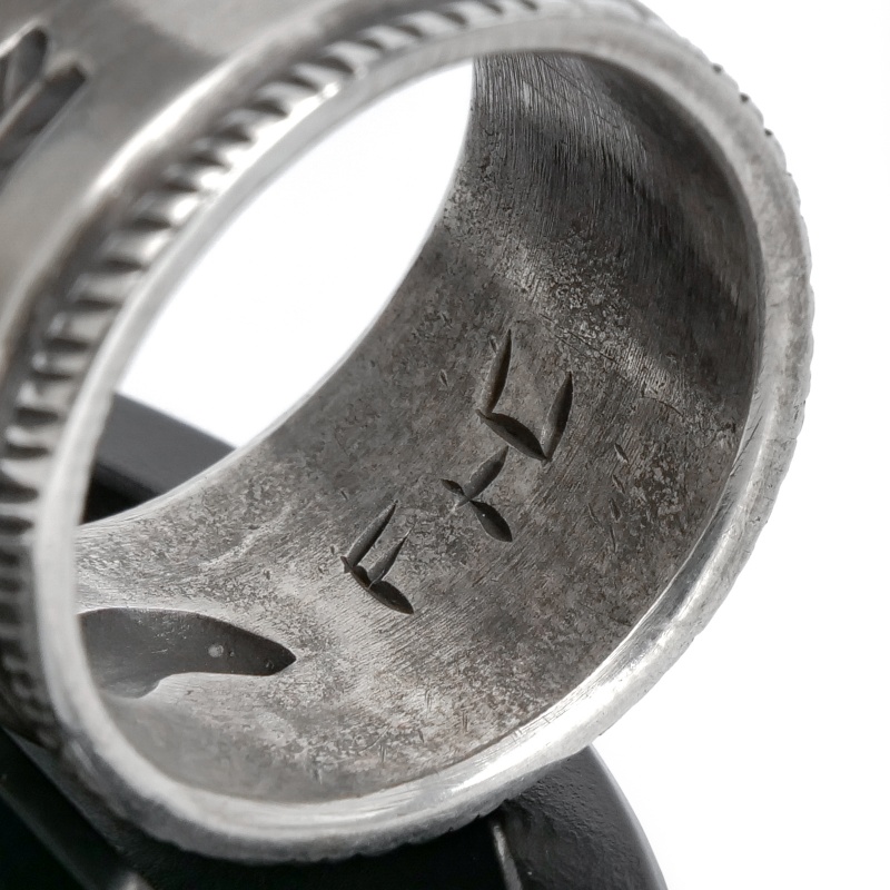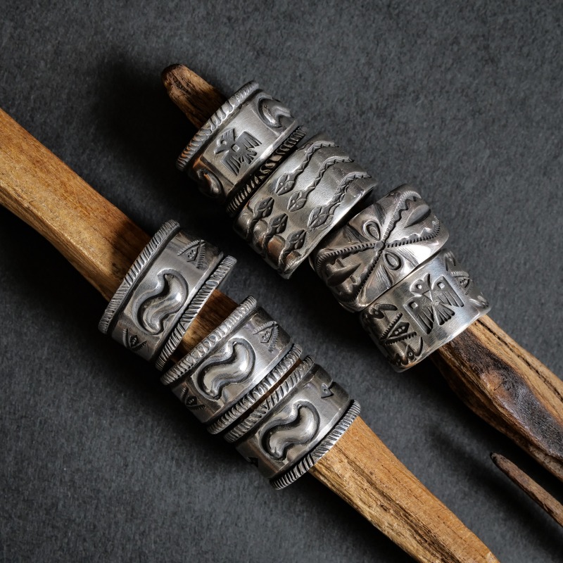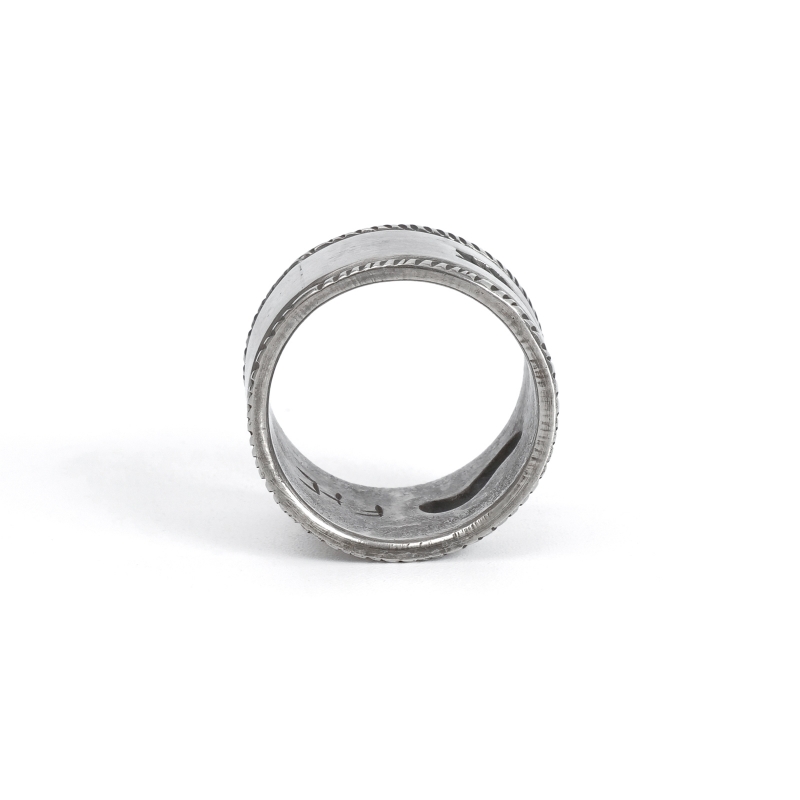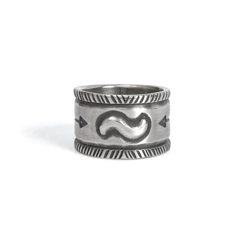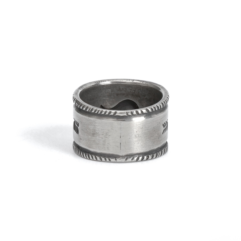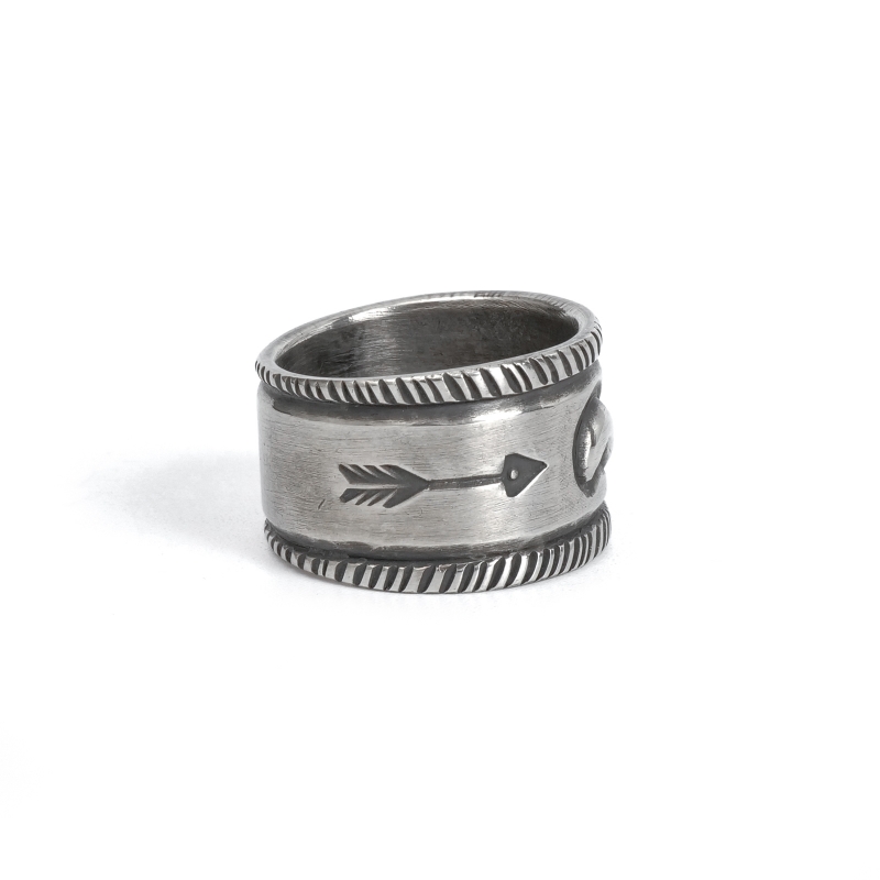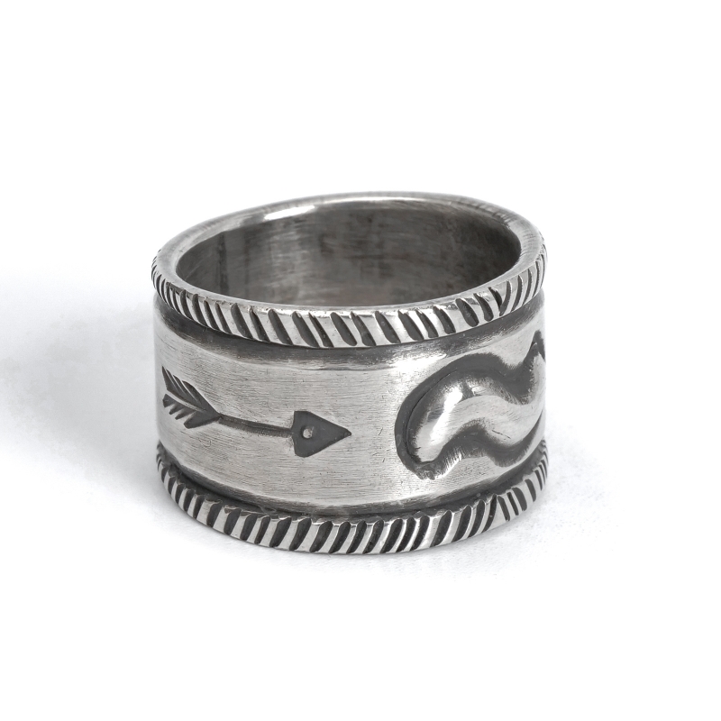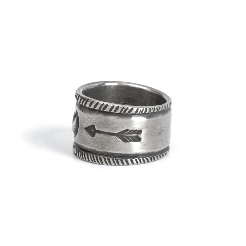ファルコントレーディングカンパニーのスタンプワークリングです。銀貨と同じ純度の90.0%に合わせ銀塊を溶かし、叩き鍛えて作る銀インゴットの肉厚な銀板に、ヴィンテージなS字バンプのタガネを中心にデザインした味わいある仕上がりの1点。サイドには「護符」となるアローのスタンプも。機械を使わずに研磨することで古びた風合いを生み出しています。背面にかけて軽くテーパーダウンしており幅広ながら着け心地滑らか、着ければ着けるほど味わいが増していく、経年変化を楽しむ1点。
