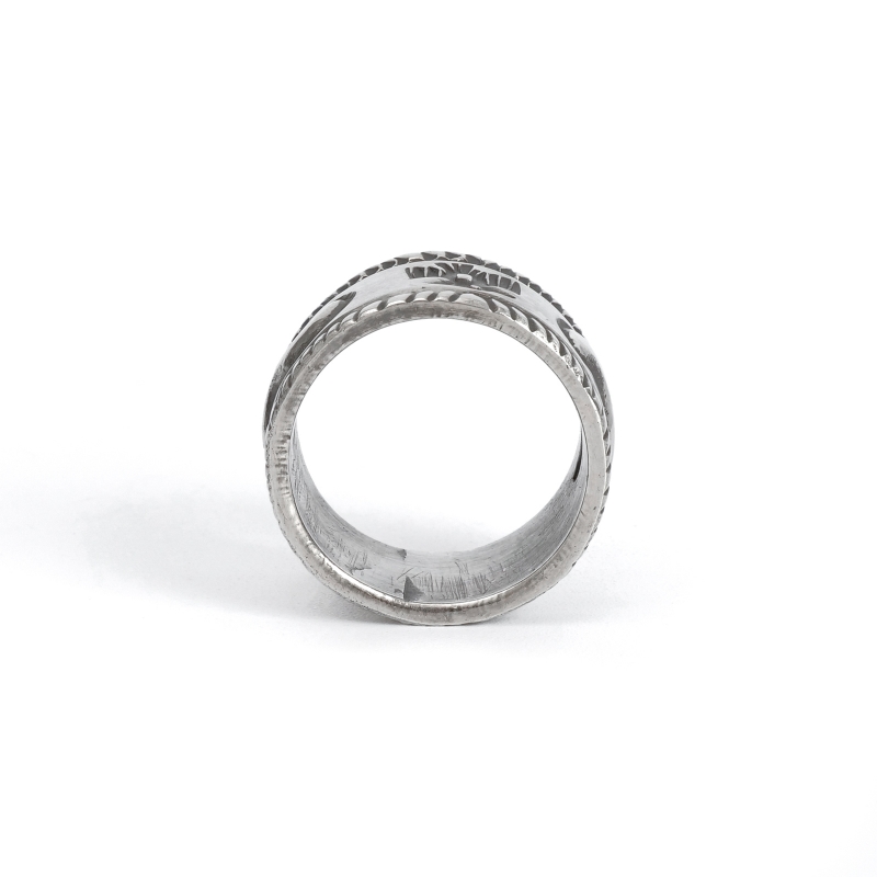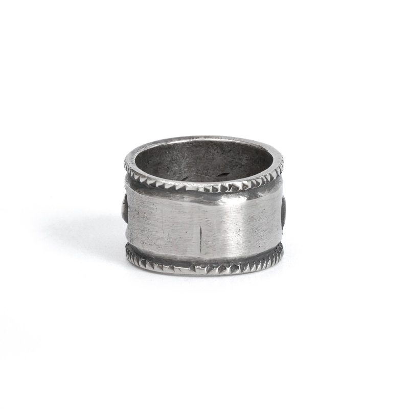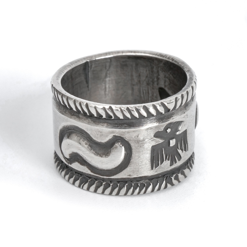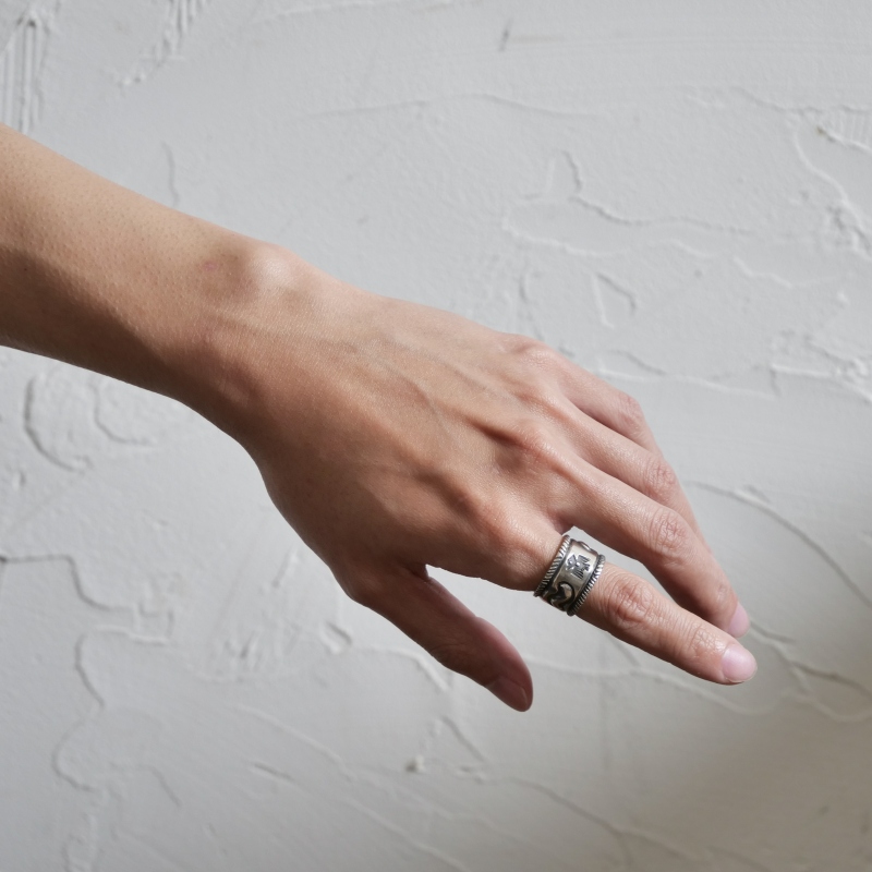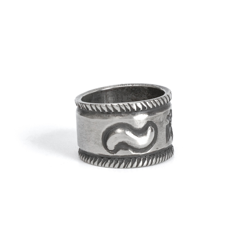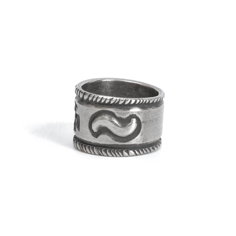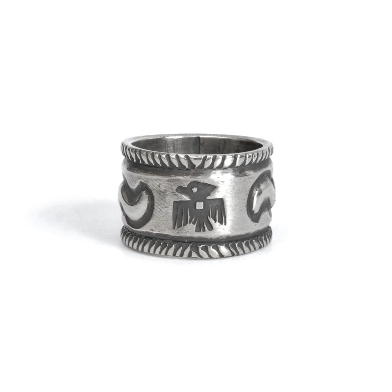 ファルコントレーディングカンパニーのスタンプワークリングです。銀貨と同じ純度の90.0%に合わせ銀塊を溶かし、叩き鍛えて作る銀インゴットの肉厚な銀板に、レトロなサンダーバードとS字バンプのタガネでデザインした味わいある仕上がりの1点。機械を使わずに研磨することで古びた風合いを生み出しています。背面にかけて軽くテーパーダウンしており幅広ながら着け心地滑らか、着ければ着けるほど味わいが増していく、経年変化を楽しむ1点。