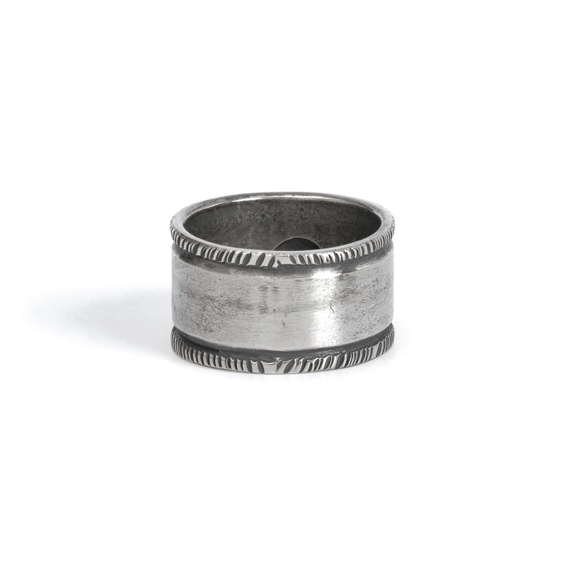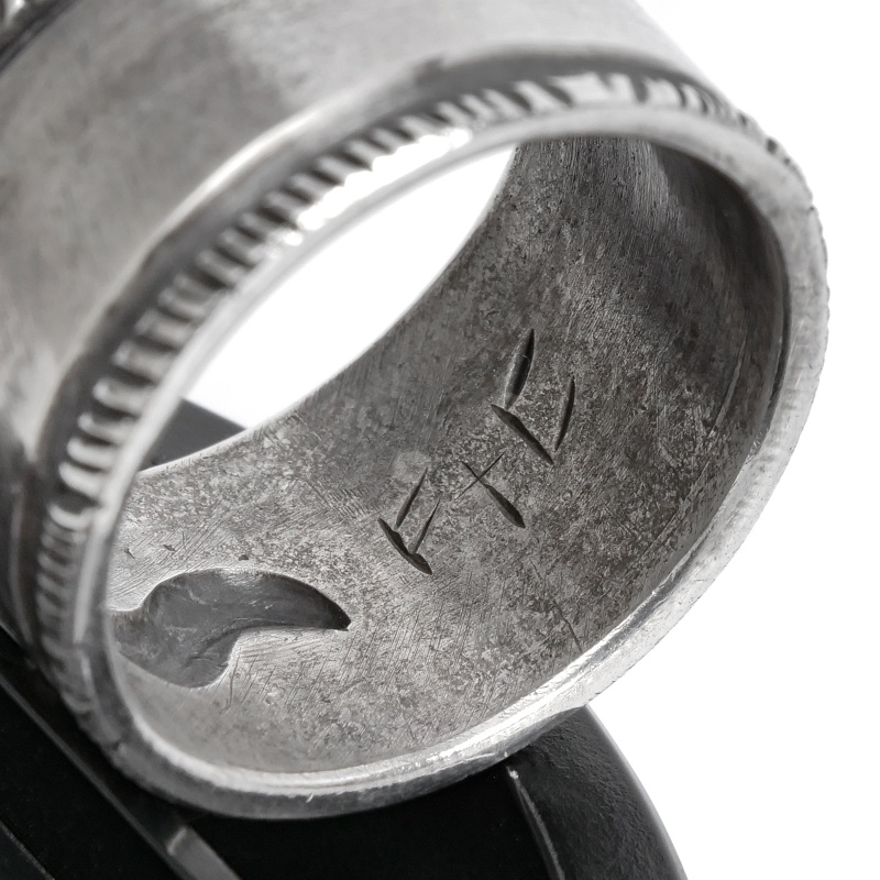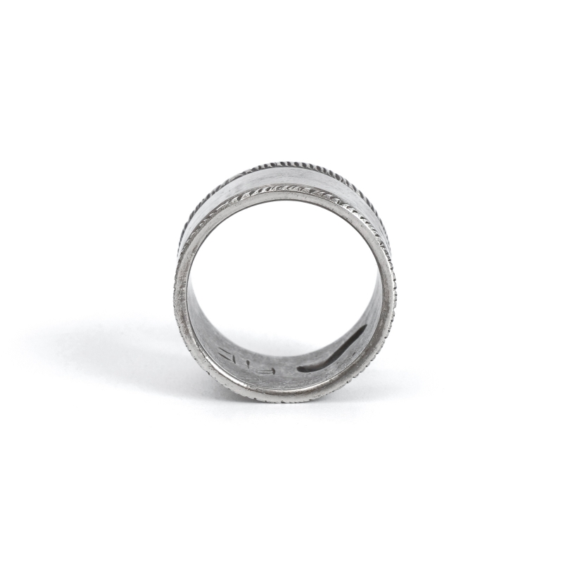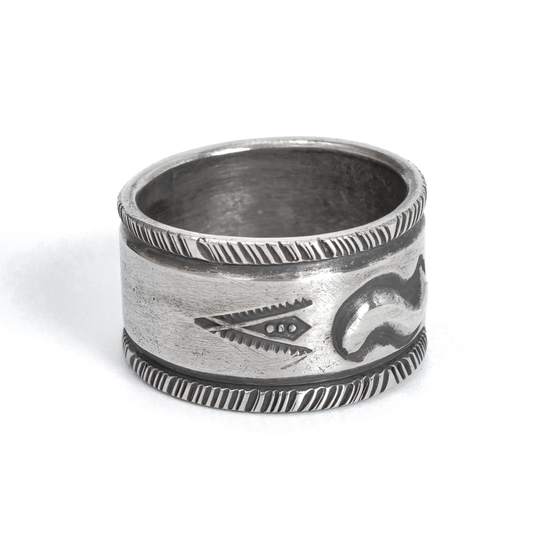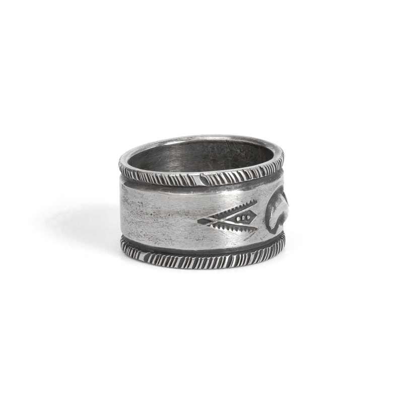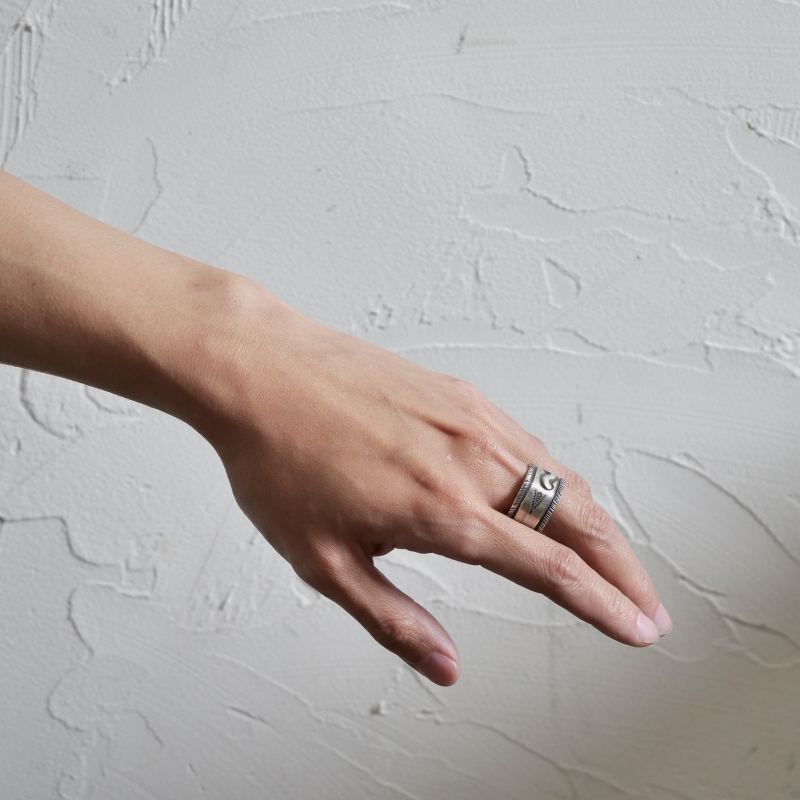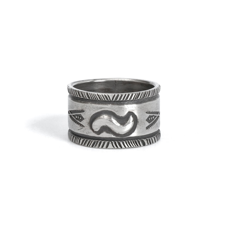 ファルコントレーディングカンパニーのスタンプワークリングです。銀貨と同じ純度の90.0%に合わせ銀塊を溶かし、叩き鍛えて作る銀インゴットの肉厚な銀板に、ヴィンテージなS字バンプのタガネを中心にデザインした味わいある仕上がりの1点。機械を使わずに研磨することで古びた風合いを生み出しています。幅広ながら着け心地滑らか、着ければ着けるほど味わいが増していく、経年変化を楽しむ1点。