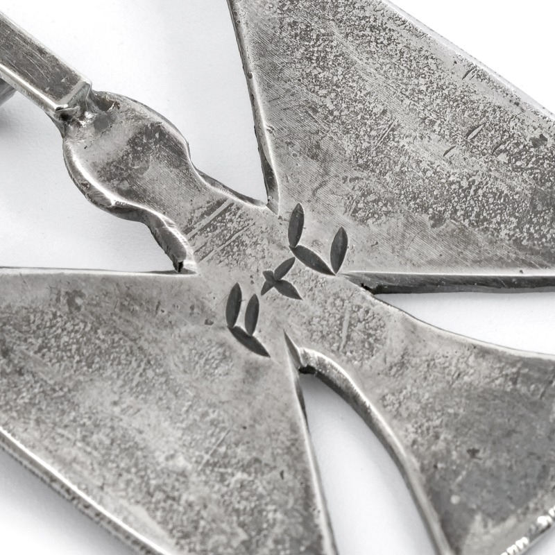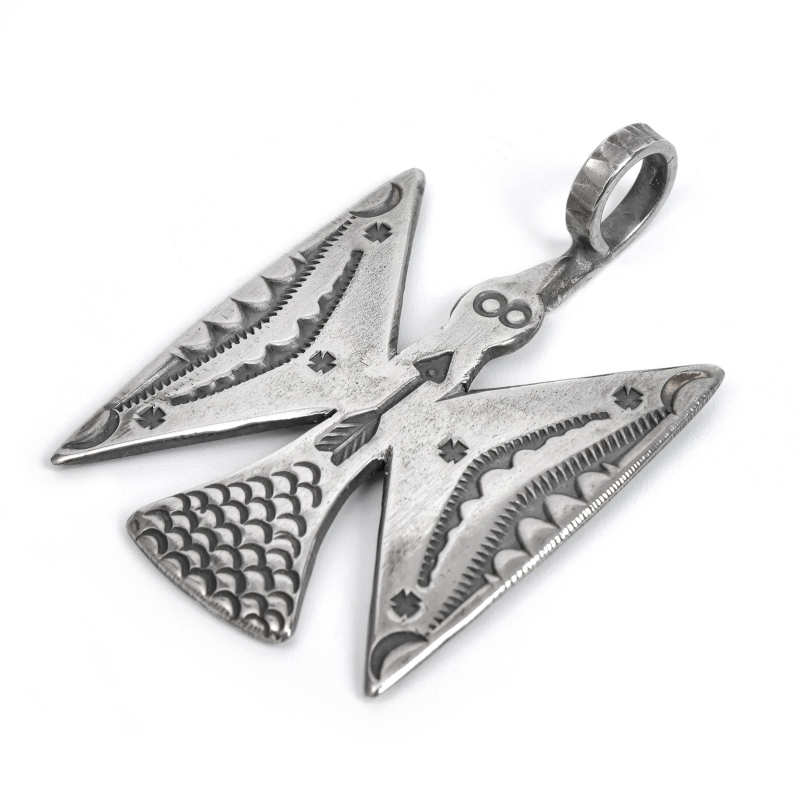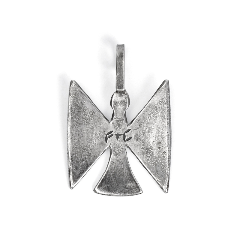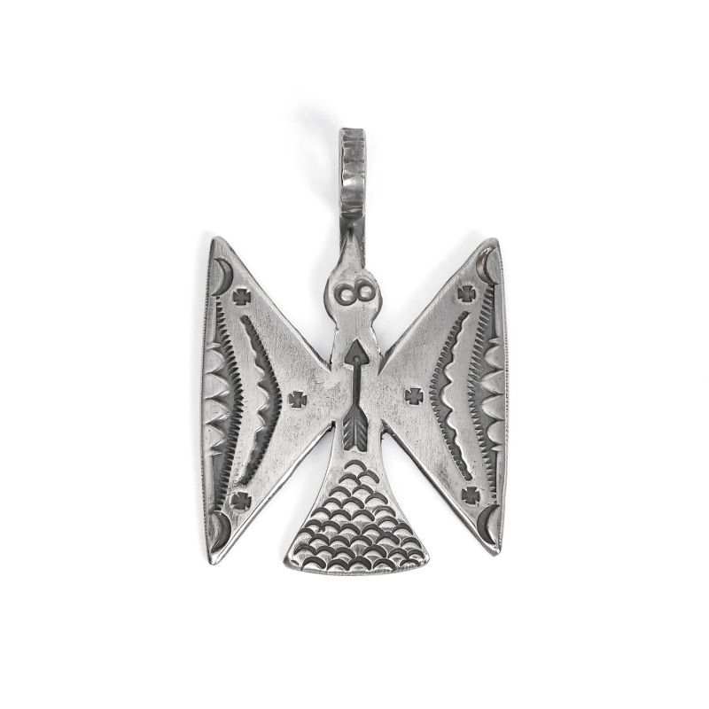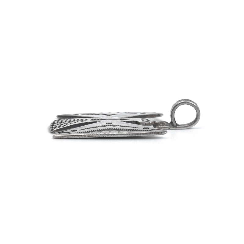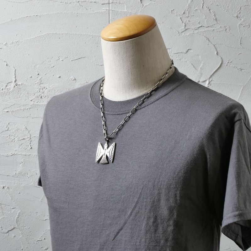 ファルコントレーディングカンパニーのスタンプワークペンダントです。銀貨と同じ純度の90.0%に合わせ銀塊を溶かし、叩き鍛えて作る銀インゴットの肉厚な銀板を使用。レトロジュエリーのようなユニークなウォーターバード(水鳥)のフォルムにし、ヴィンテージスタンプで装飾した味わいある1点。水鳥の行く方向で水場が見つかることから『導くもの』の意味があり、胸元には『護符』の意味を持つアロースタンプが。機械を使わずに研磨することで古びた風合いを生み出しています。幅広ながら着け心地滑らか、着ければ着けるほど味わいが増していく、経年変化を楽しむ1点。