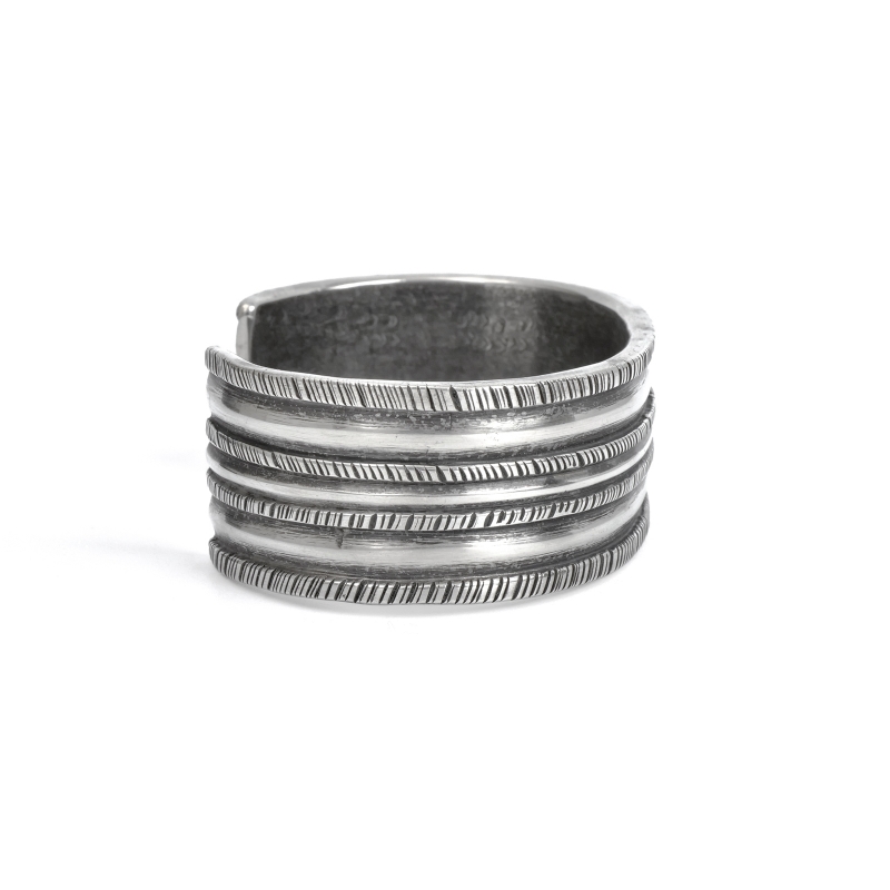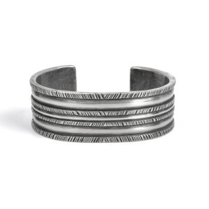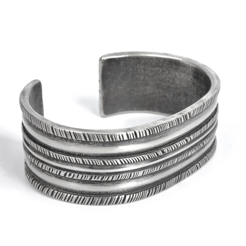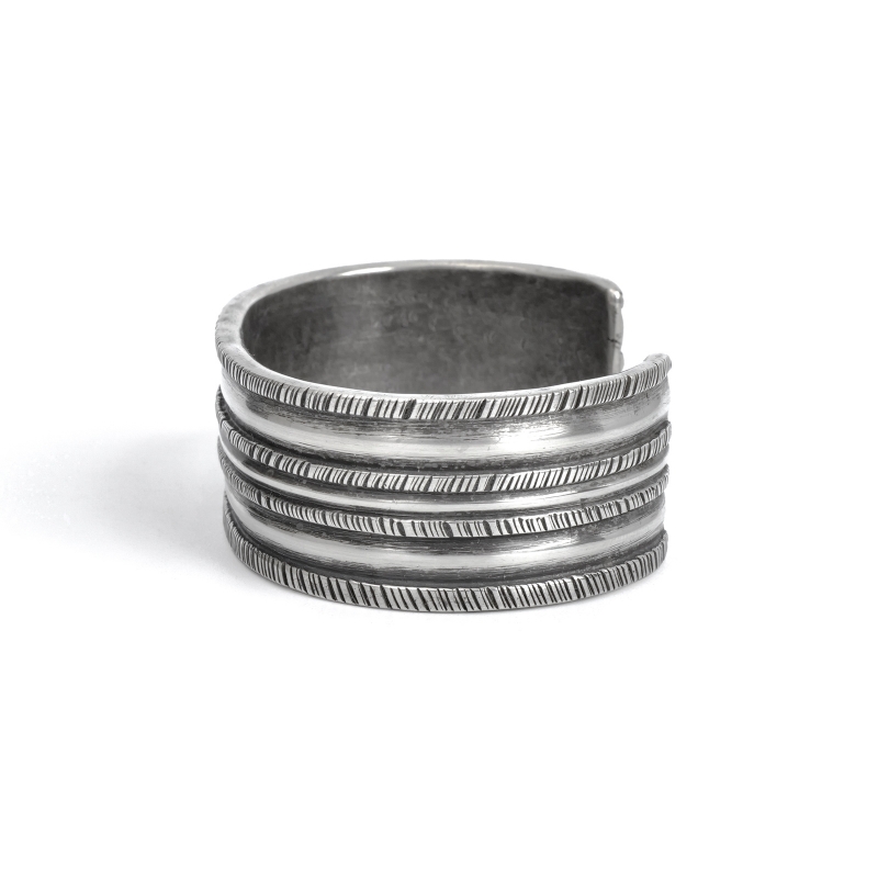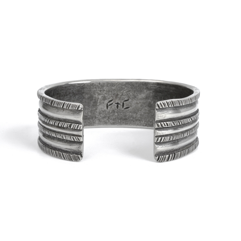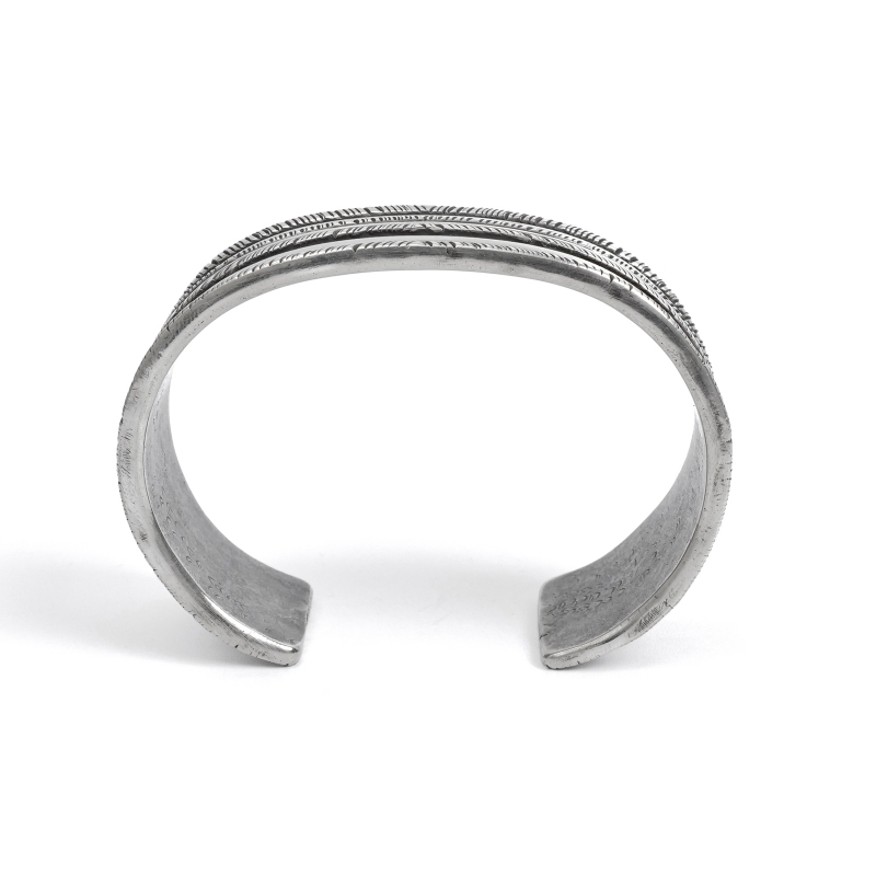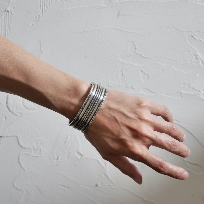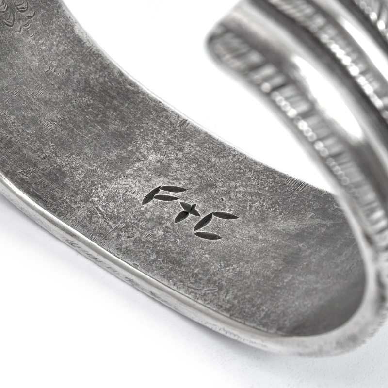 ファルコントレーディングカンパニーのスタンプワークバングルです。銀貨と同じ純度の90.0%に合わせ銀塊を溶かし、叩き鍛えて作る重厚な銀インゴットで仕立てたずしりと重いヘヴィバングル。ファイリングの立体成形以外は直線のチゼルのみ、という潔さですが、あえて均一ではなく打ち込むことで肉厚な銀に生命感を吹きこむことに成功しています。機械を使わずに研磨することで古びた風合いと滑らかな着け心地を実現、着ければ着けるほど味わいが増していく、経年変化を楽しむ1点。