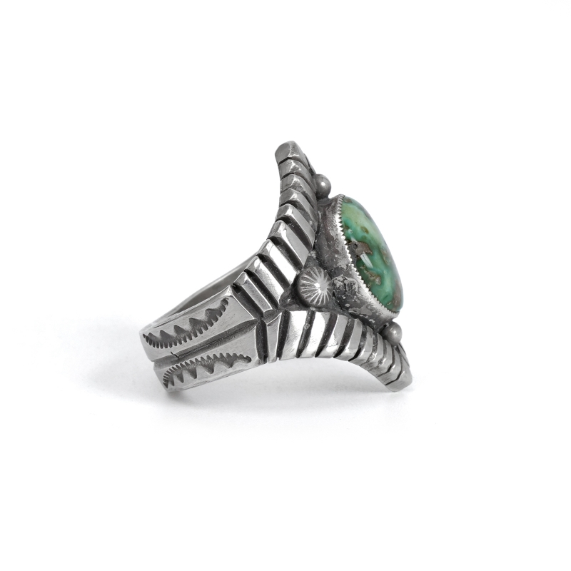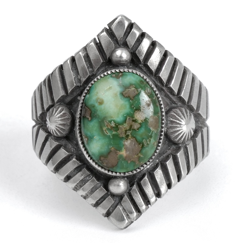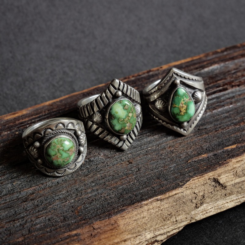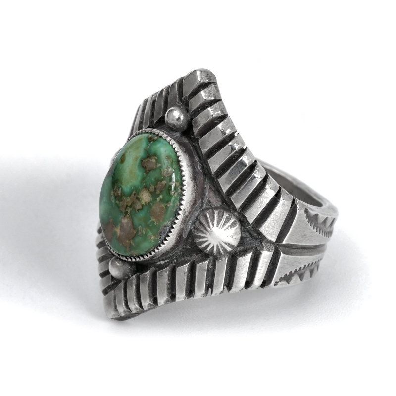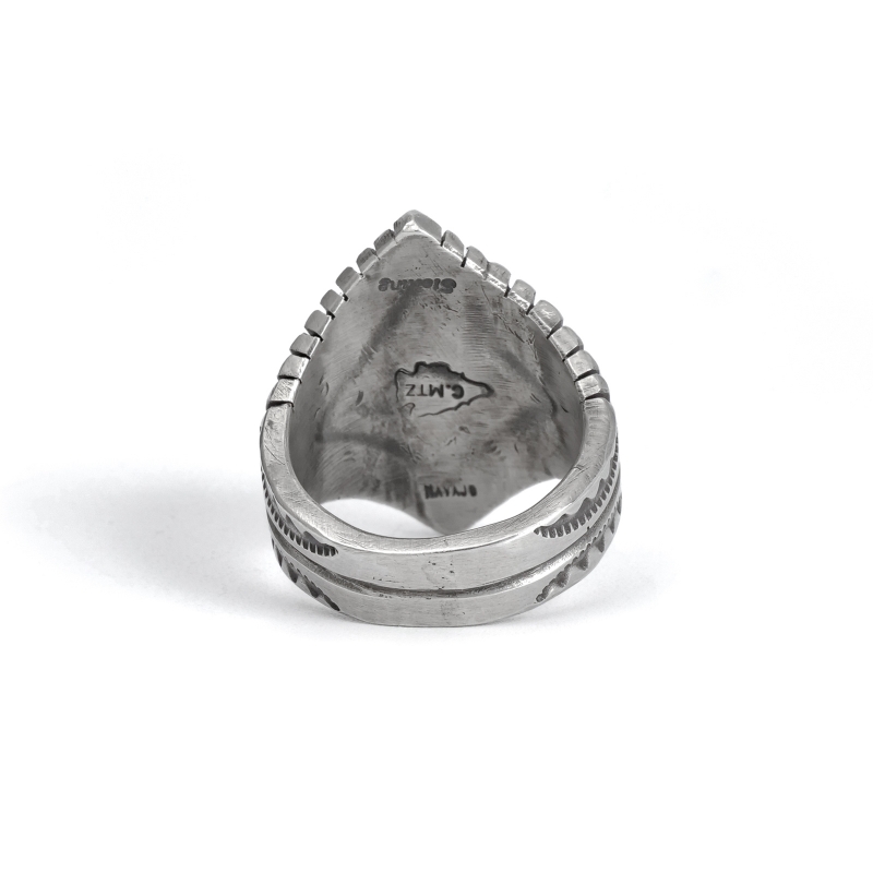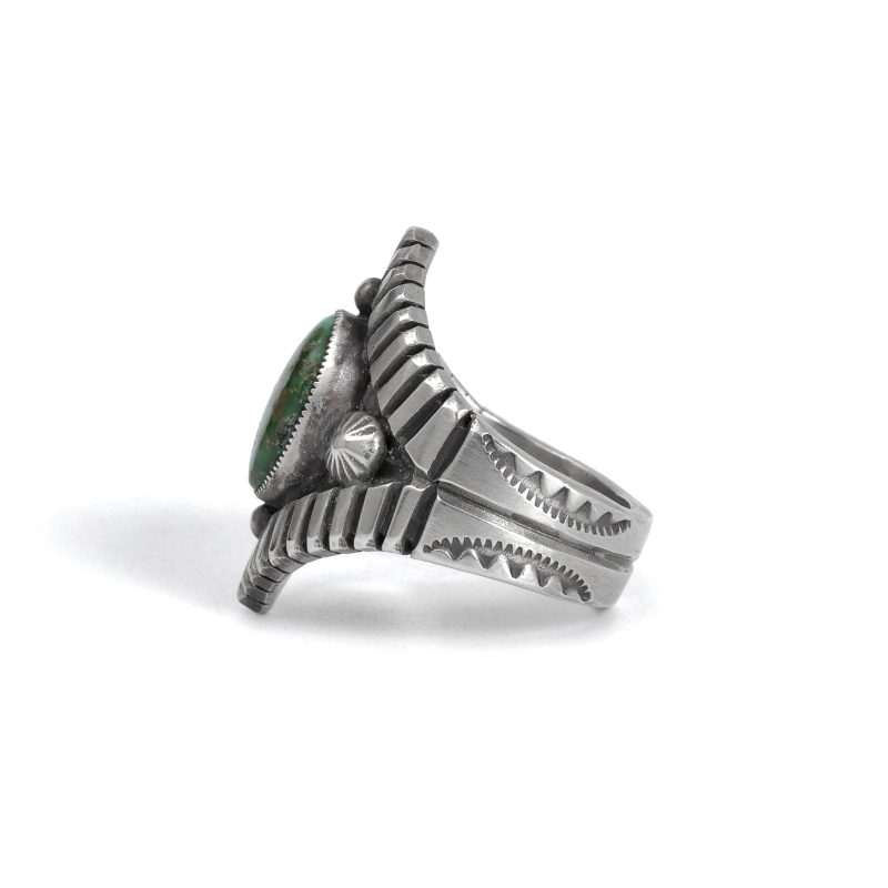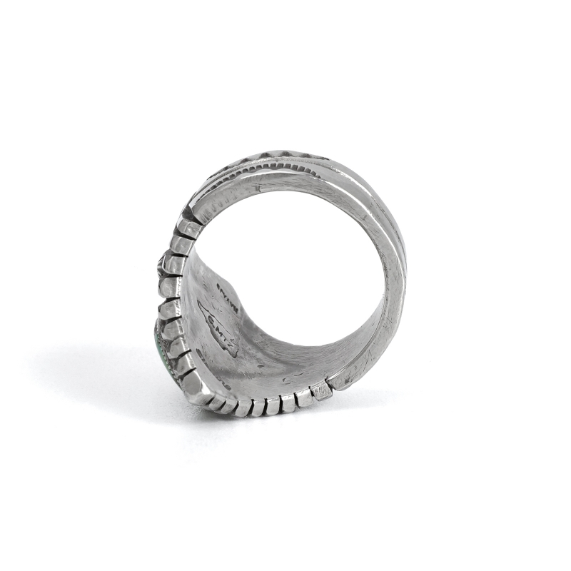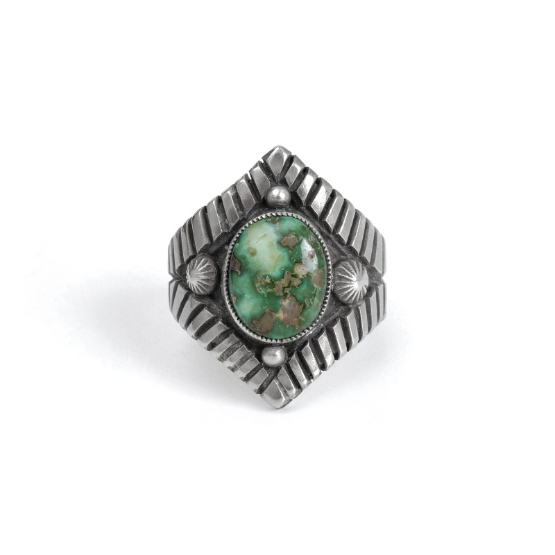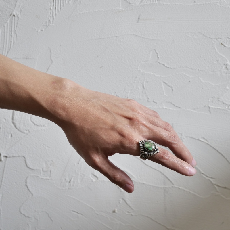カルヴィンマルチネスのターコイズリングです。グラデーションがかったハイグレードソノランゴールドをセットし、周りにコンチョやスタンプワークを配したオールドスタイルリング。インゴットシルバーの肉厚トップは十分なボリュームがありながら、背面はすっきりしていて手の動きを妨げません。ドロップひとつまで全て手仕事で制作するカルビンの、丁寧なハンドクラフトが細部まで感じられる1点。