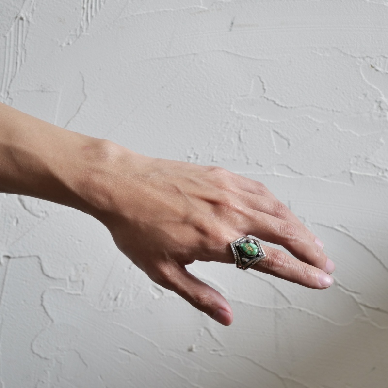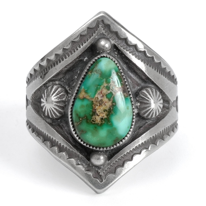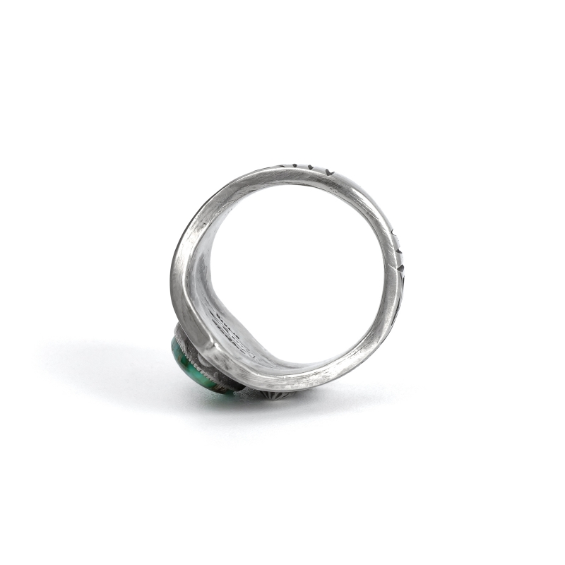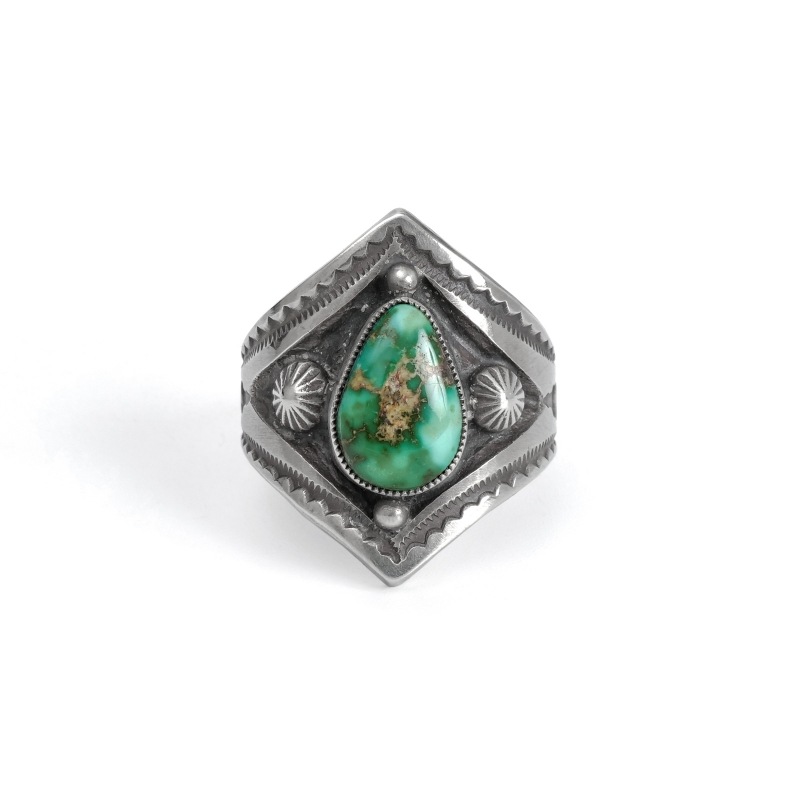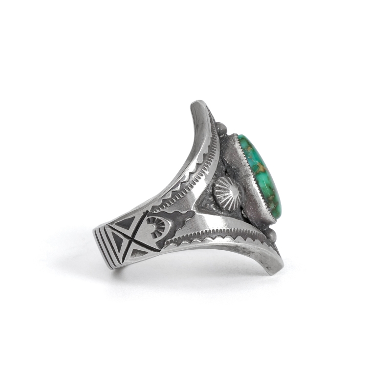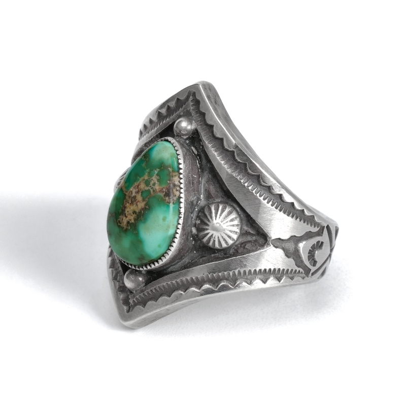 カルヴィンマルチネスのターコイズリングです。深いグリーンウェブの入ったハイグレードソノランゴールドをセットし、周りにコンチョやスタンプワークを配したオールドスタイルリング。インゴットシルバーの肉厚トップは十分なボリュームがありながら、背面はすっきりしていて手の動きを妨げません。ドロップひとつまで全て手仕事で制作するカルビンの、丁寧なハンドクラフトが細部まで感じられる1点。