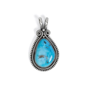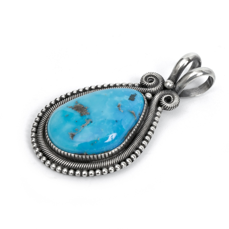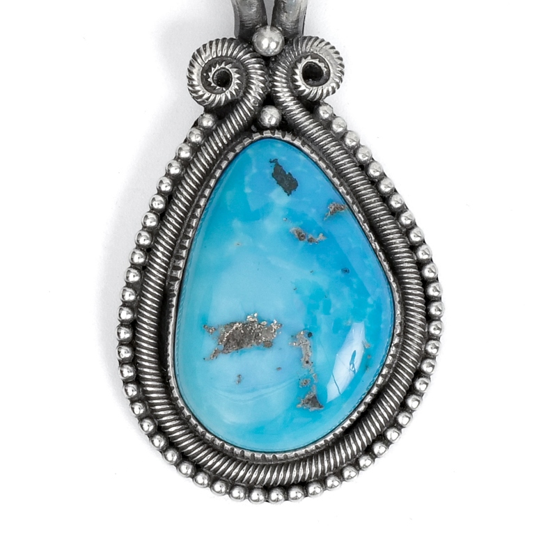 スティーブアルビソのハイグレードターコイズペンダントです。こちらはグラデーションが美しいスカイブルーにパイライトが散る大粒のキャンデラリアターコイズ。周囲のフレームは石の個性に合わせてチゼルワークベゼル・ツイステッドワイヤー・ドットラインの3層仕立て。ターコイズに相応しい手の込んだフレームでクラシックな風合いを生み出しています。石の良さをシンプルに味わいながらそれを活かす匠の技も堪能できる秀逸ペンダント。