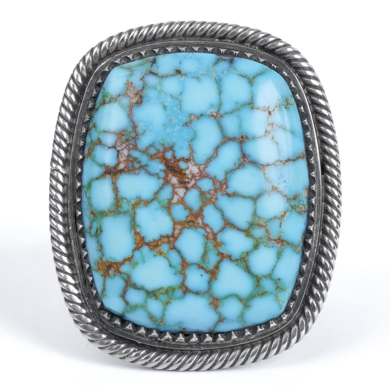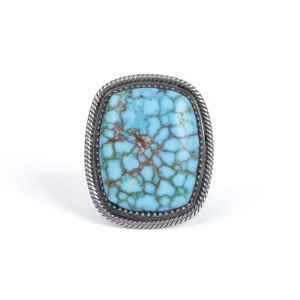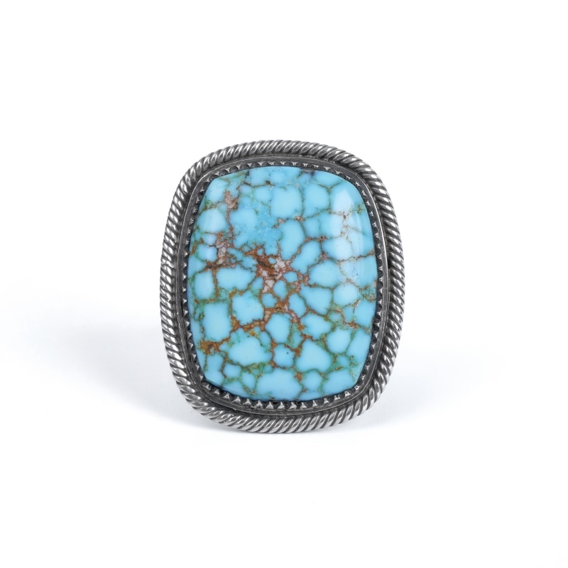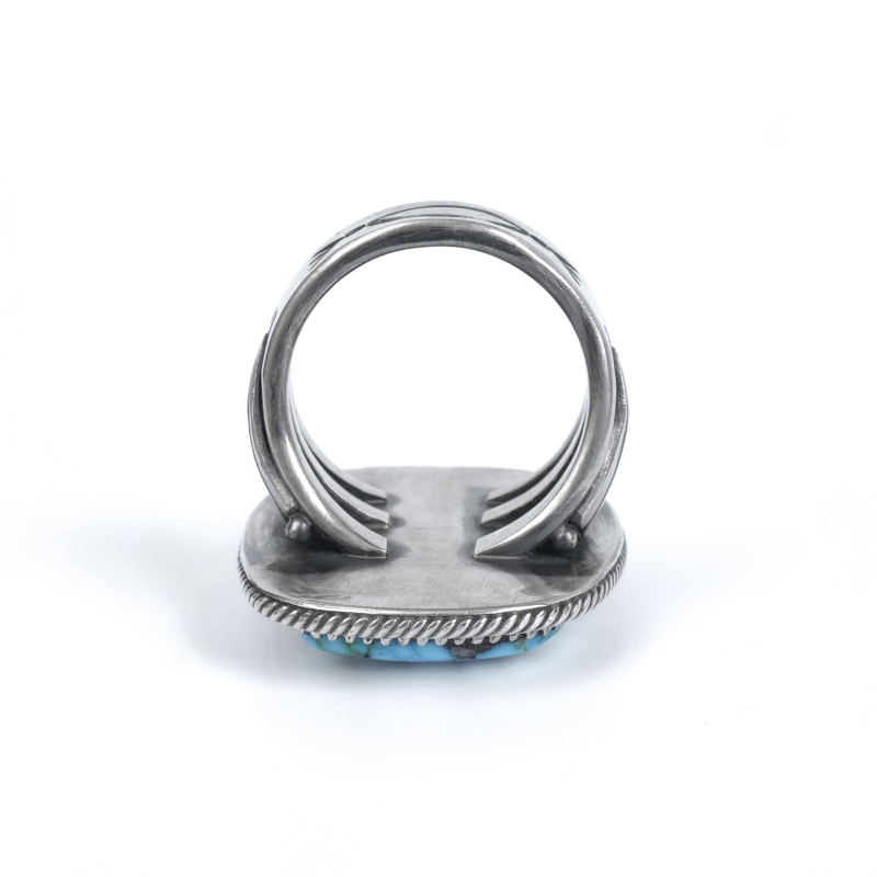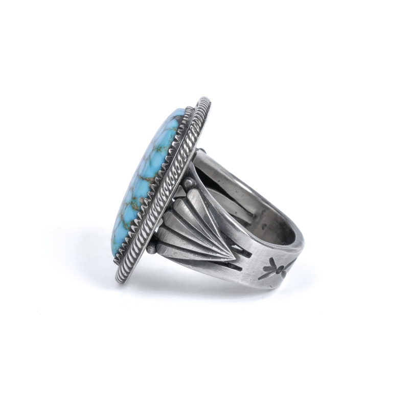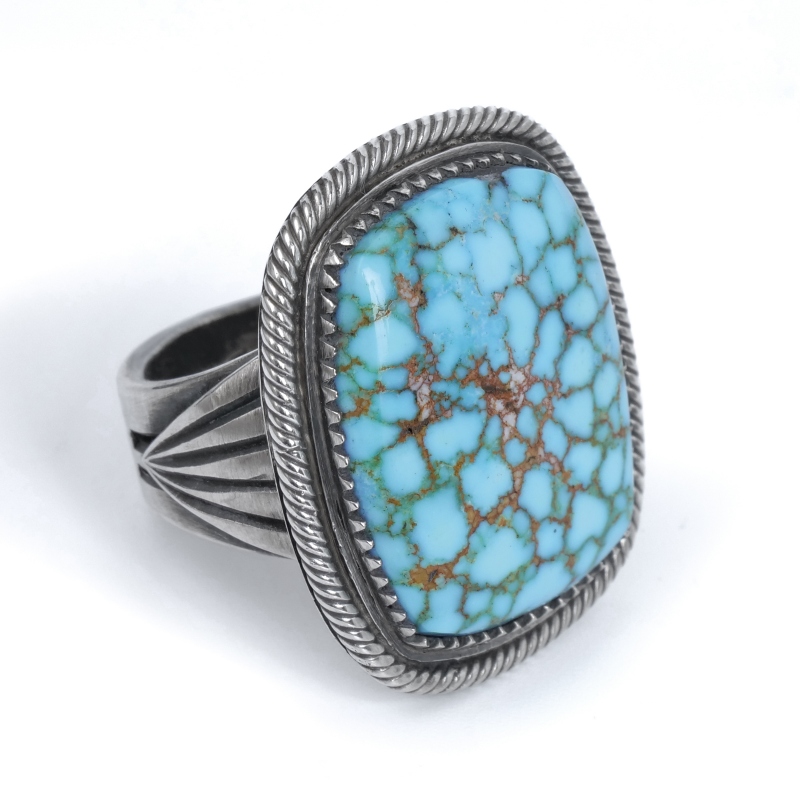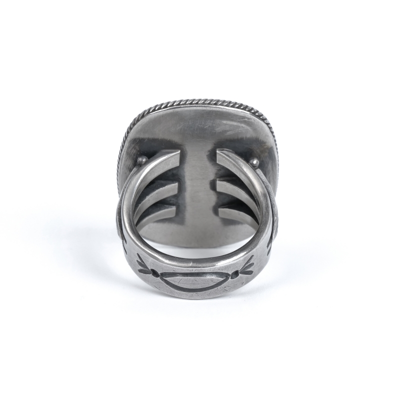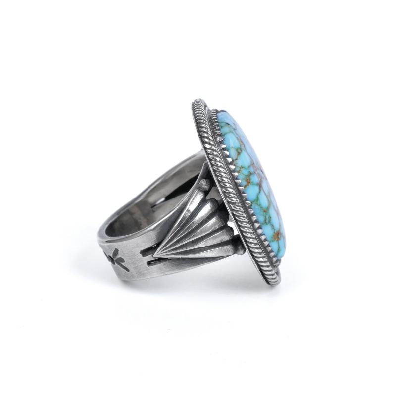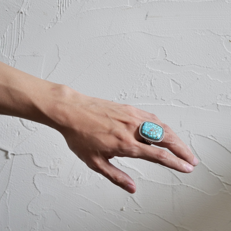 スティーブアルビソのハイグレードターコイズリングです。こちらは細かい赤茶スパイダーウェブが入った、スティーブ自らカット・研磨したキングマンターコイズ。人目を引かずにはおかない見事な大粒です。周囲のフレームは石の個性に合わせて鋸刃ベゼルにプレーンベゼルを重ね、ツイストワイヤーの3層仕立て。ターコイズに相応しい手の込んだフレームでクラシックな風合いを生み出しています。シャンクはスティーブのトレードマークといえるファンと『天と地・見守る眼』のモチーフ。石の良さをシンプルに味わいながらそれを活かす匠の技も堪能できる逸品です。