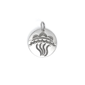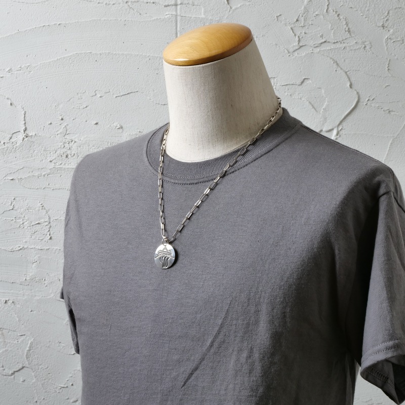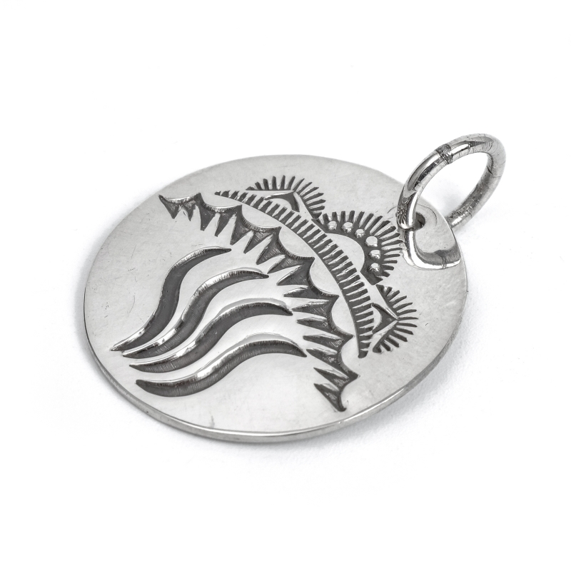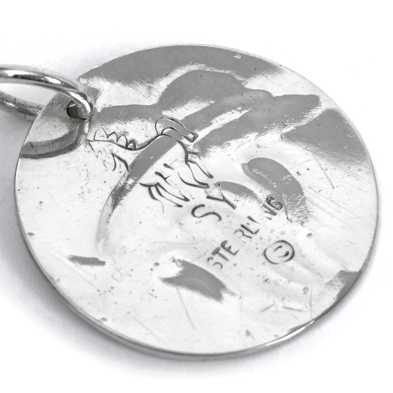 スティーブイエローホースのスタンプワークペンダントです。かなり薄手の鏡面プレートに小さなスタンプワークを組み合わせ、地球に彗星が衝突する様子を描きだした壮大なモチーフの1点。彗星はナバホ族に火を与えたBlack Godの母だという説も。またナバホリザベーションの外れ、アリゾナ州ウィンズローには直径1.2キロの『バリンジャー隕石孔』があります。隕石は「天の星が落ち、精霊が怒った場所」=神聖で畏れ多い地としてナバホ族は立ち入りを禁じてきました。もしも地球に彗星が衝突したら、隕石の衝突どころではない大変動が起きるはず。そんな自然や地球への畏敬の念をジュエリーに刻んだ、小品ながらスティーブらしい印象的なジュエリーです。