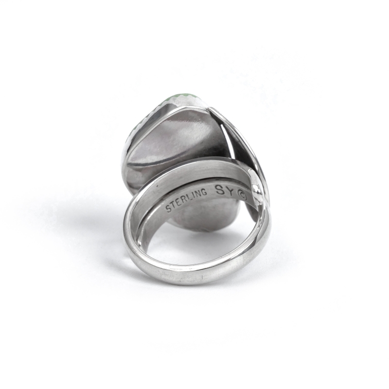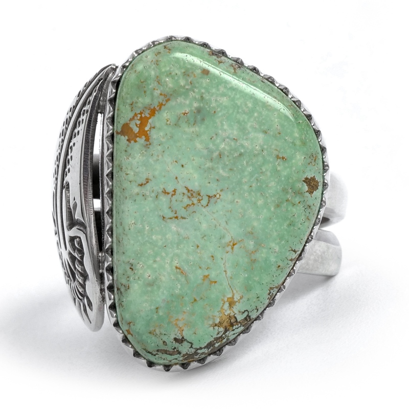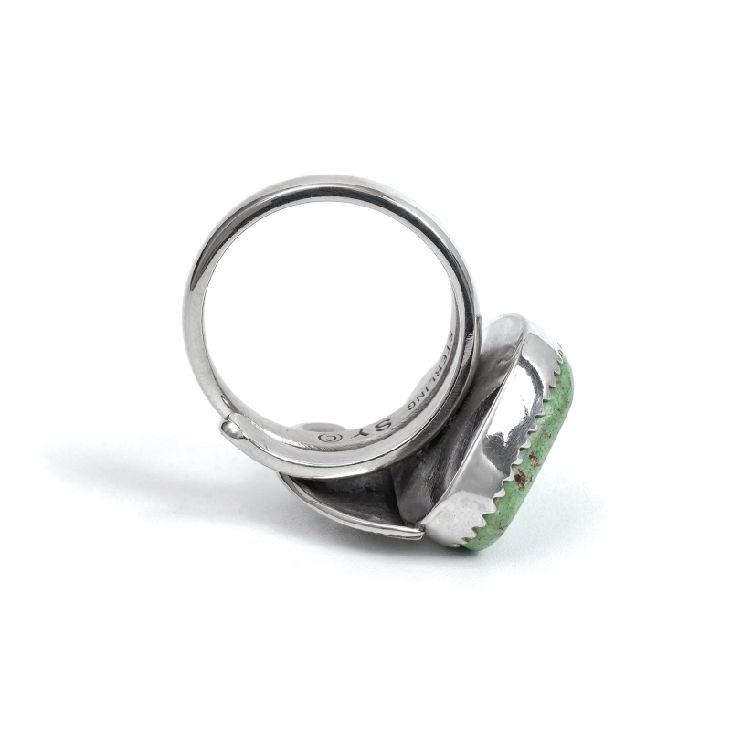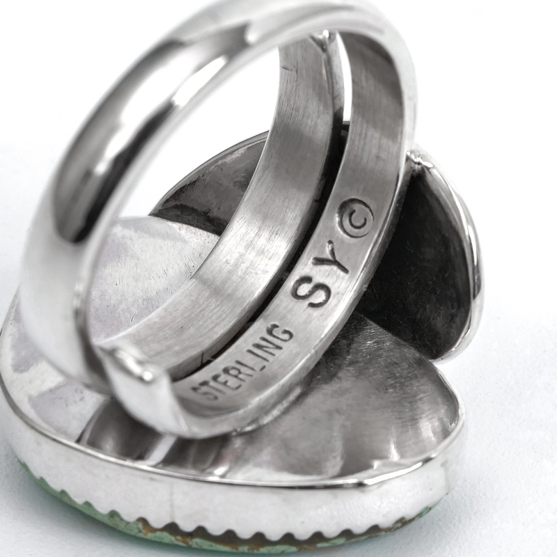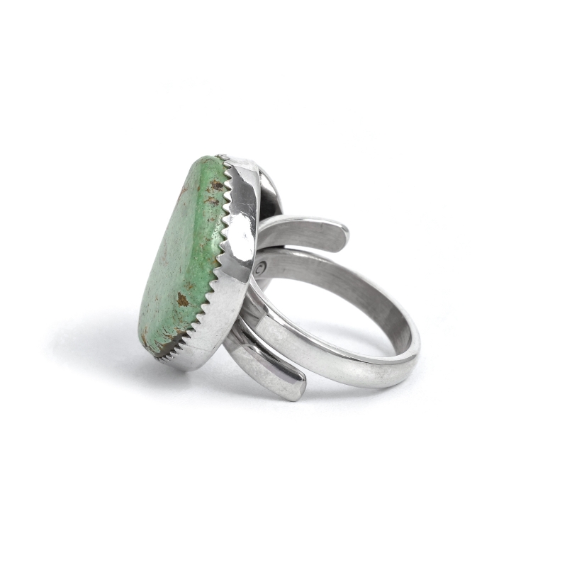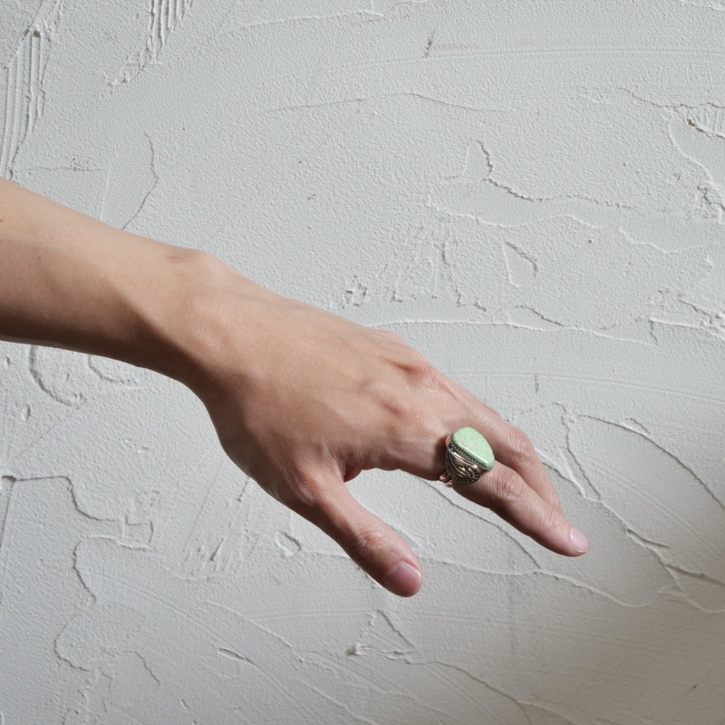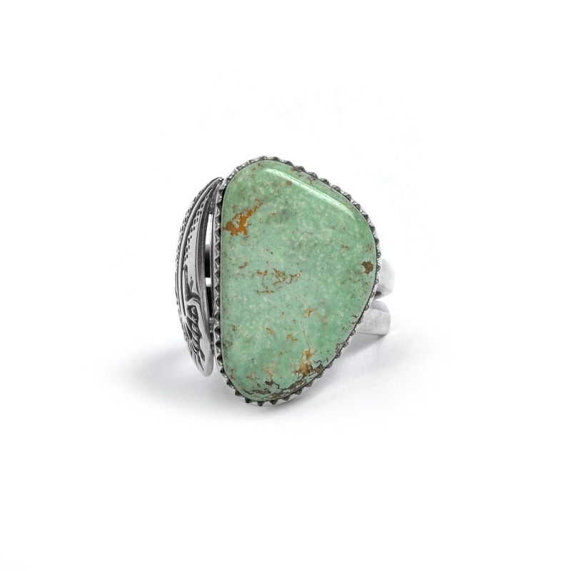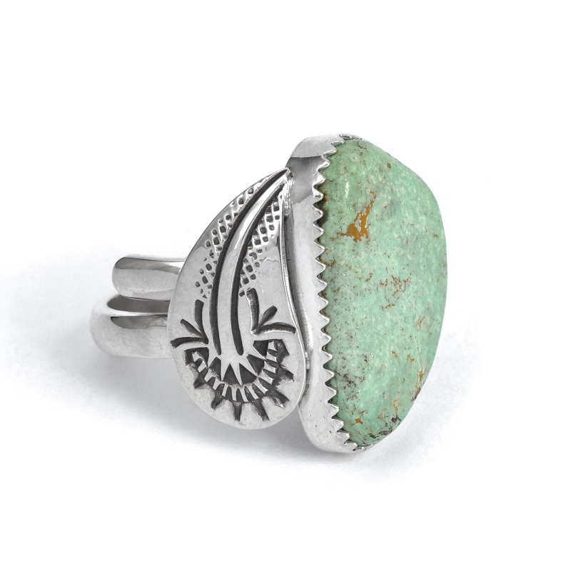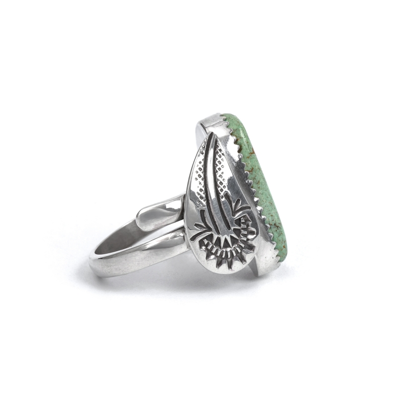 スティーブイエローホースのターコイズリングです。淡い色味のキャリコレイクターコイズに、自然や地球からインスパイアされたスタンプを打ったリーフパーツが添えられた1点。ネイティブアメリカンらしすぎないアートピースのようなジュエリーです。シャンクはアジャスタブルで多少の調整が可能なのも嬉しい。