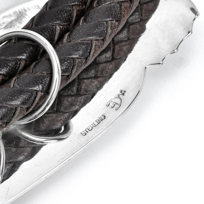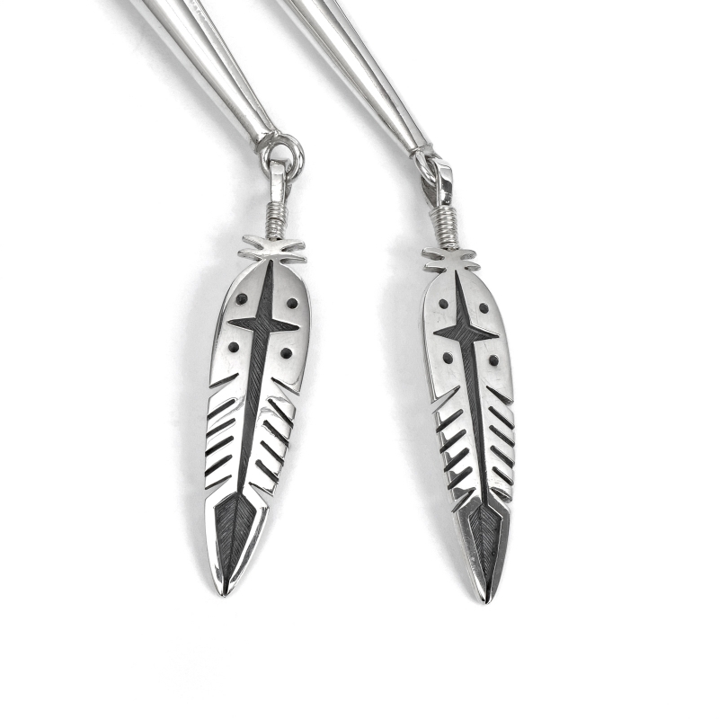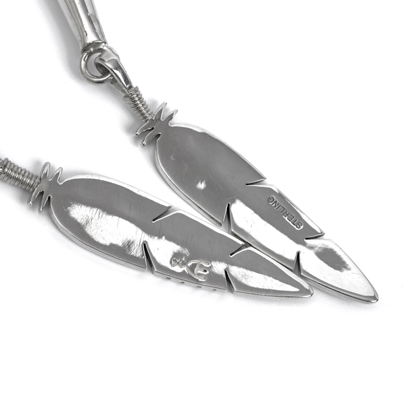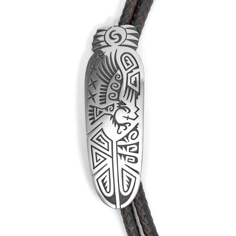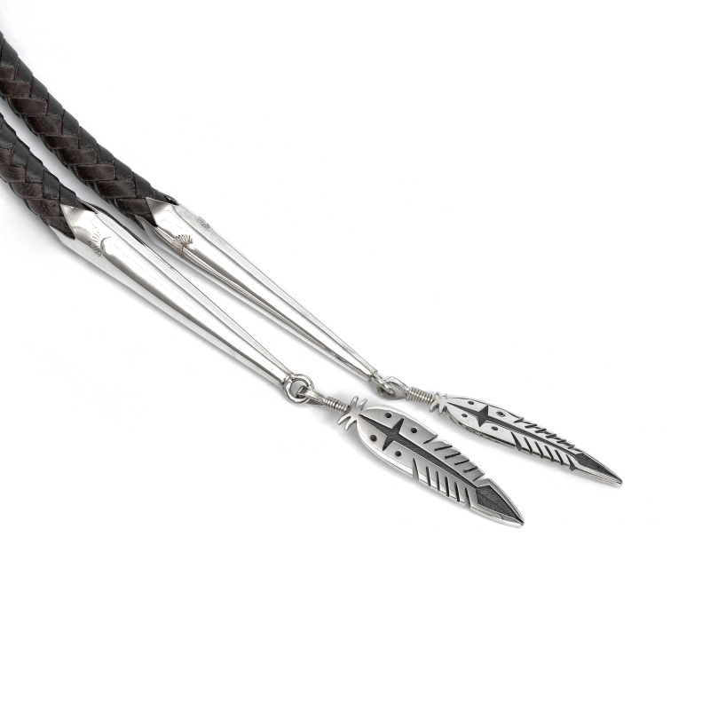 ルービンソウフキーのオーバレイボロタイです。何より目を惹くのはトップの大きなイーグルフェザー。その中には創造主の遣いとして知られるイーグルのデザイン。流麗なカッティング線からはホピの祈りと力強いスピリットを感じられます。チップ部分にもハンドメイドのイーグルフェザーが。太めの丸編みブラックレザーはネック部分を平らに仕立てた上質なもの、シルバーワークも手掛けるRay Skeet(レイスキート)の作です。年々減少しつつあるホピオーバーレイの大作、コレクションに相応しい1点。