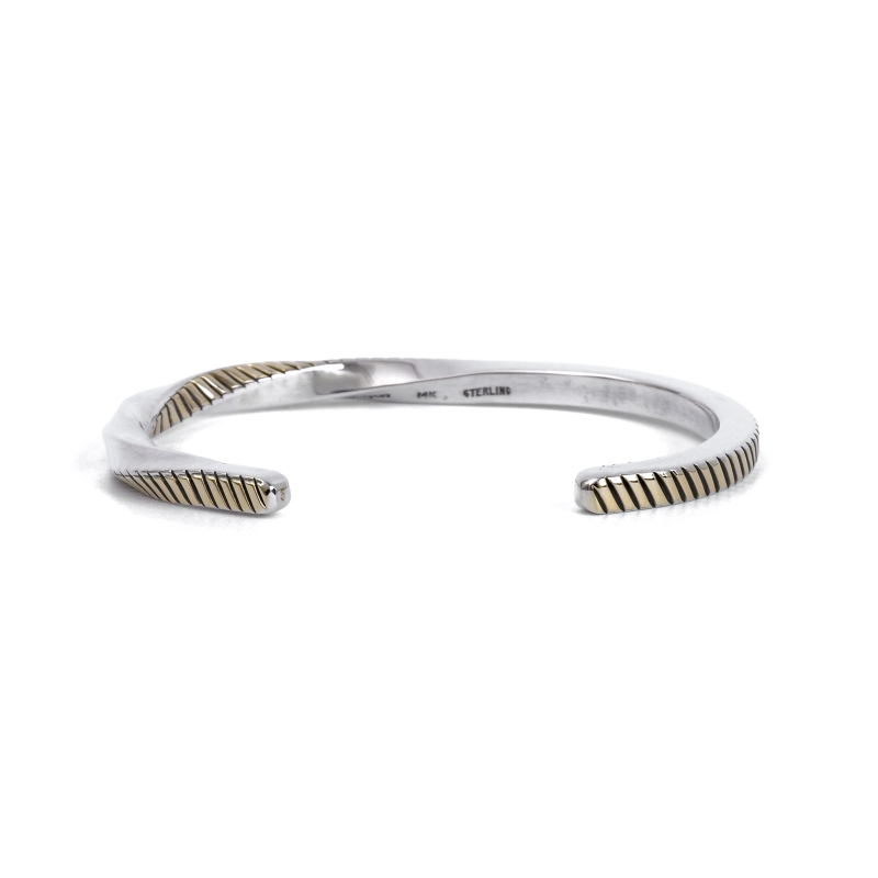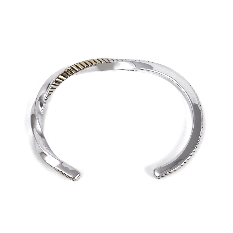 ナバホ族・ブルースモーガンの14金コンビバングルです。4mm角スクエアワイヤーの1面に14金シートをごく薄くオーバーレイ、エンドまでスタンプを打ち込み、片方だけひとねじりしたスタイリッシュな1点。アメリカ南西部では命の象徴ともいえる『Rain=雨』のモチーフで、シンプルなチゼルワークで打ち付ける嵐の雨を表現しています。細身でシンプル、伝統的なナバホのジュエリー技法のみで制作しながらも装いを選ばない洗練されたデザイン、年代性別を問わないのでペアジュエリーにもおすすめ。
