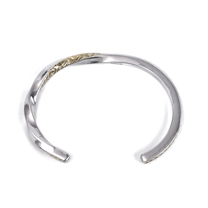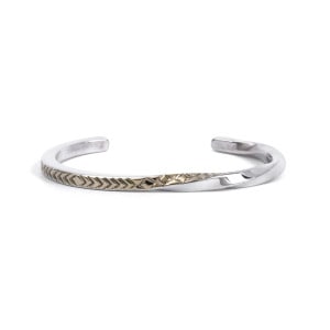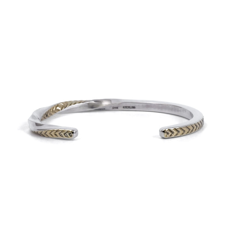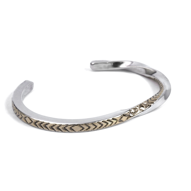 ナバホ族・ブルースモーガンの14金コンビバングルです。4mm角スクエアワイヤーの1面に14金シートをごく薄くオーバーレイ、エンドまでスタンプを打ち込み、片方だけひとねじりしたスタイリッシュな1点。ナバホの思想「Four direction=4つの方角」を表すダイヤモンドがスタンプで表現されています。細身でシンプル、伝統的なナバホのジュエリー技法のみで制作しながらも装いを選ばない洗練されたデザイン、年代性別を問わないのでペアジュエリーにもおすすめ。