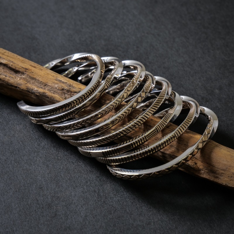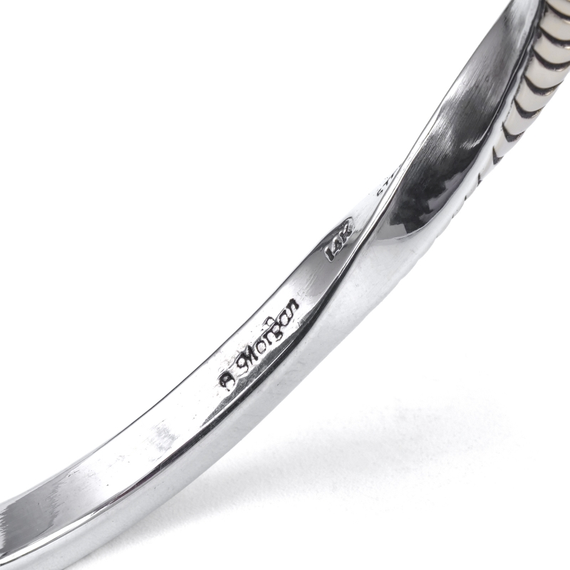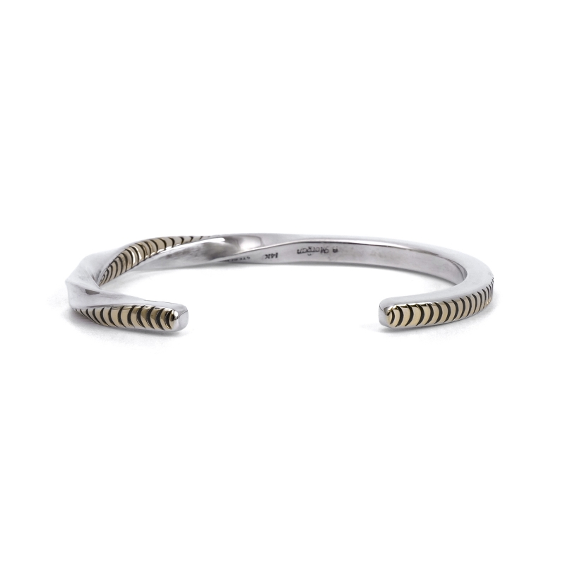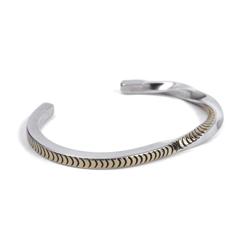 ナバホ族・ブルースモーガンの14金コンビバングルです。4mm角スクエアワイヤーの1面に14金シートをごく薄くオーバーレイ、エンドまでスタンプを打ち込み、片方だけひとねじりしたスタイリッシュな1点。アメリカ南西部では命の象徴ともいえる豊かな水を表す『Ripples=波紋』柄がシンプルなスタンプで表現されています。細身でシンプル、伝統的なナバホのジュエリー技法のみで制作しながらも装いを選ばない洗練されたデザイン、年代性別を問わないのでペアジュエリーにもおすすめ。