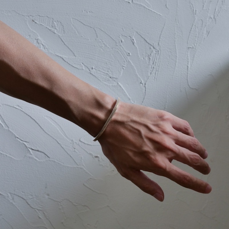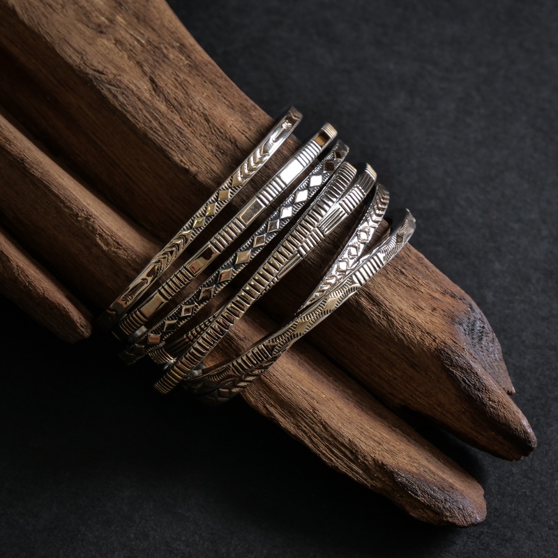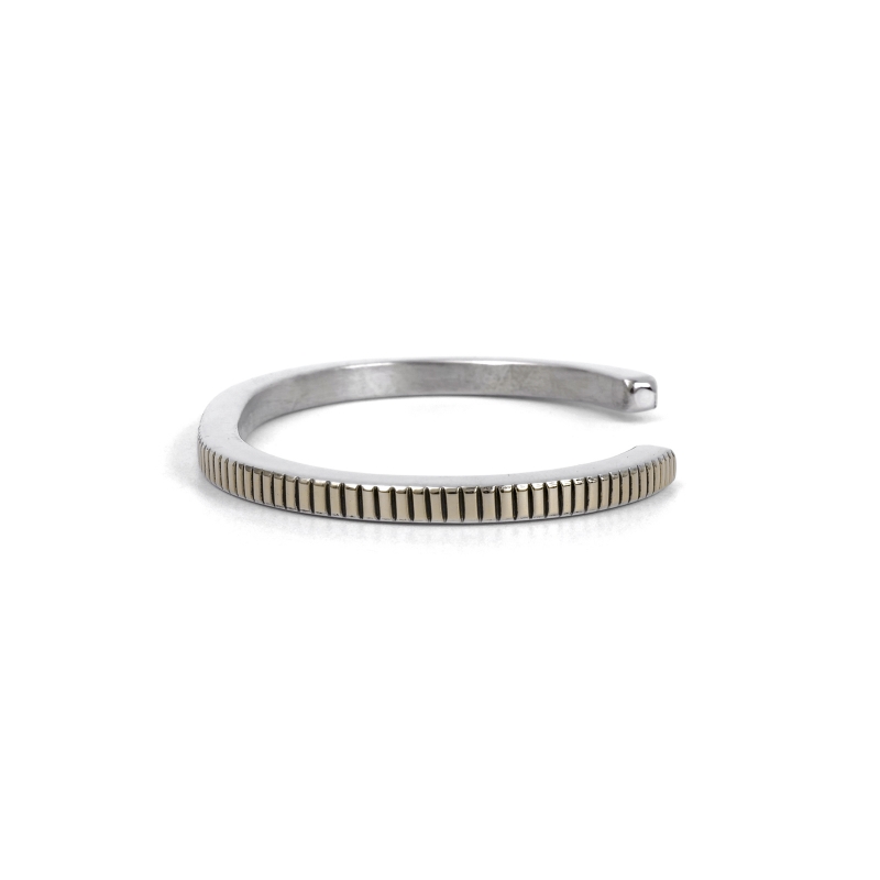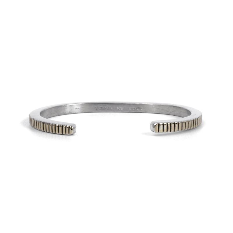 ナバホ族・ブルースモーガンの14金コンビバングルです。4mm角スクエアワイヤーの1面に14金シートをごく薄くオーバーレイ、エンドまでスタンプを打ち込んだスタイリッシュな1点。アメリカ南西部では命の象徴ともいえる『Rain=雨』のモチーフで、シンプルなチゼルワークで恵みの雨を表現しています。細身でシンプル、伝統的なナバホのジュエリー技法のみで制作しながらも装いを選ばない洗練されたデザイン、年代性別を問わないのでペアジュエリーにもおすすめ。