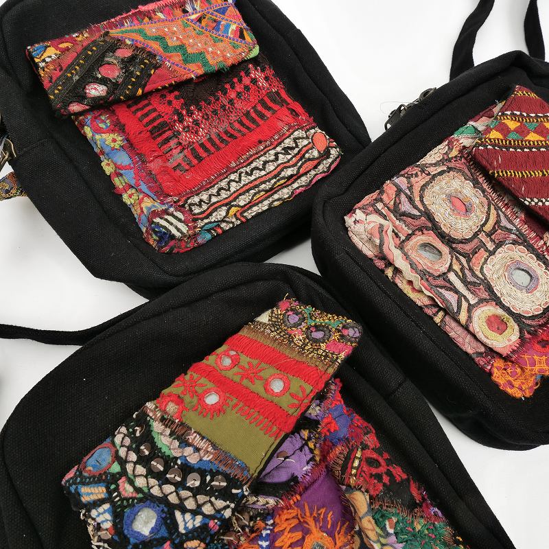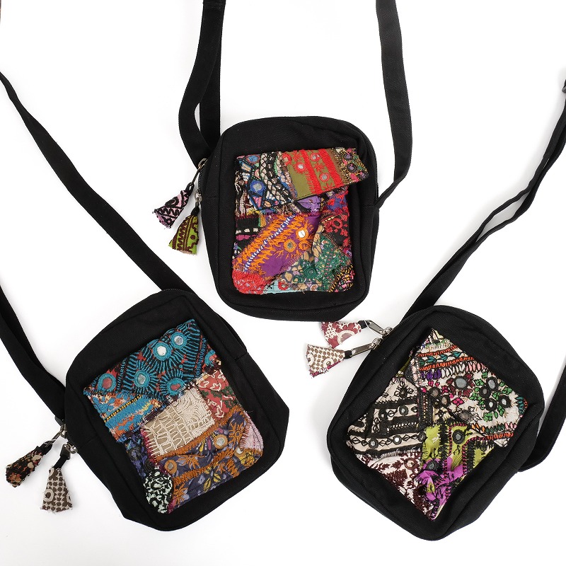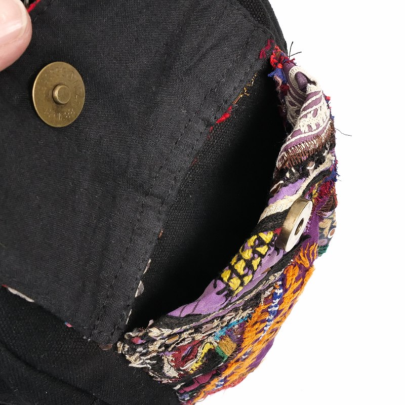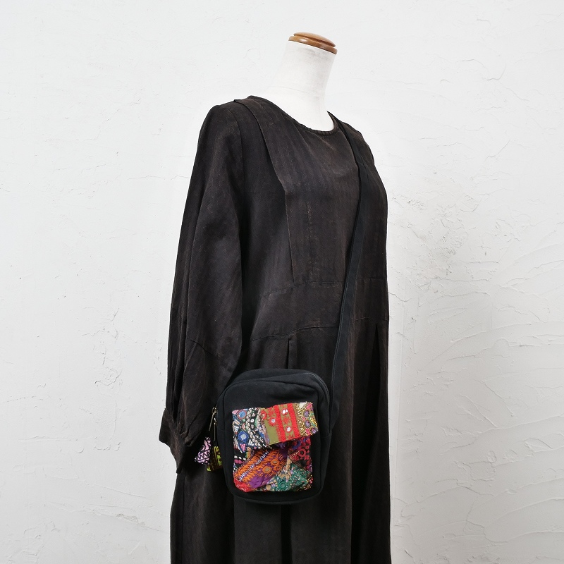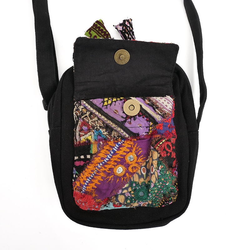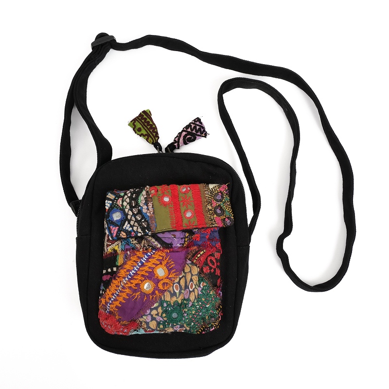 パキスタンのオールドドレスから集めた刺繍古布のパッチワーク生地を使用したミニショルダーバッグ。ブラックのキャンバスコットン生地が色彩豊かな刺繍生地を引き立てています。しっかりとした造りで、スマートフォンなど最小限の荷物を入れるのに便利。古布部分にマグネット付きポケット、裏側にもポケットがあり、機能性も充実。古布部分は全て1点ものです。