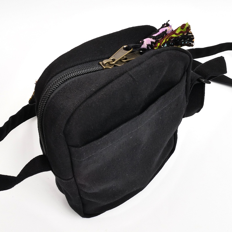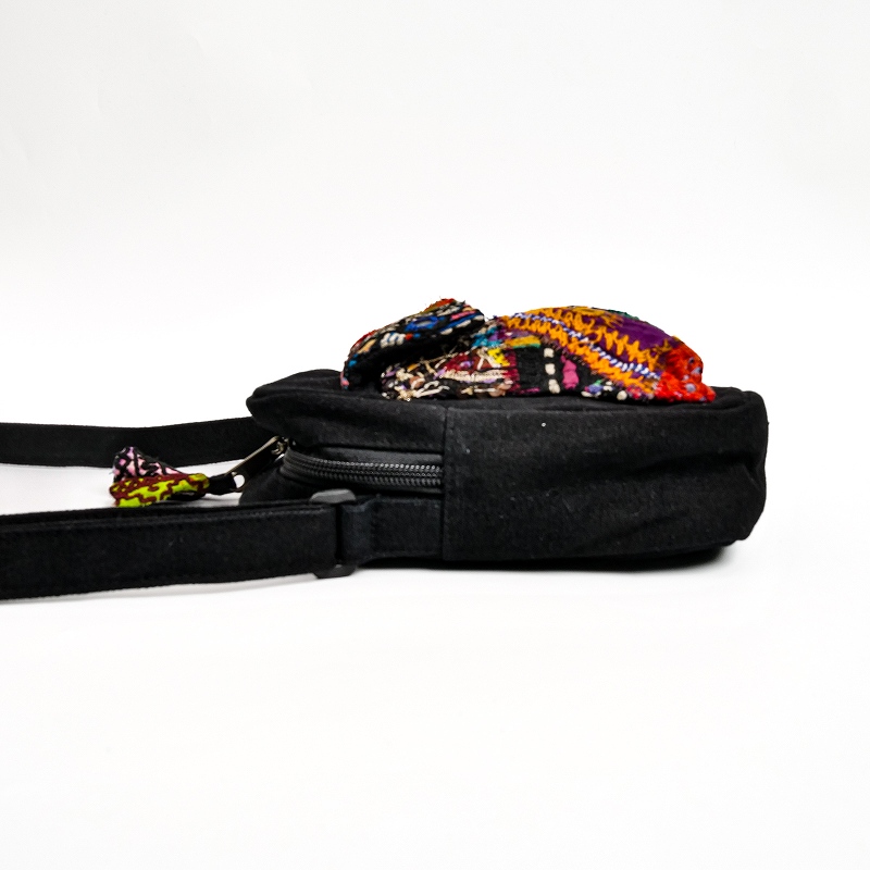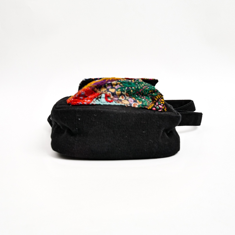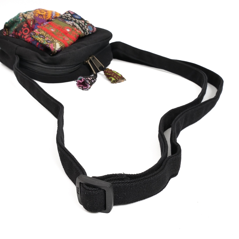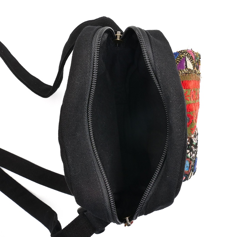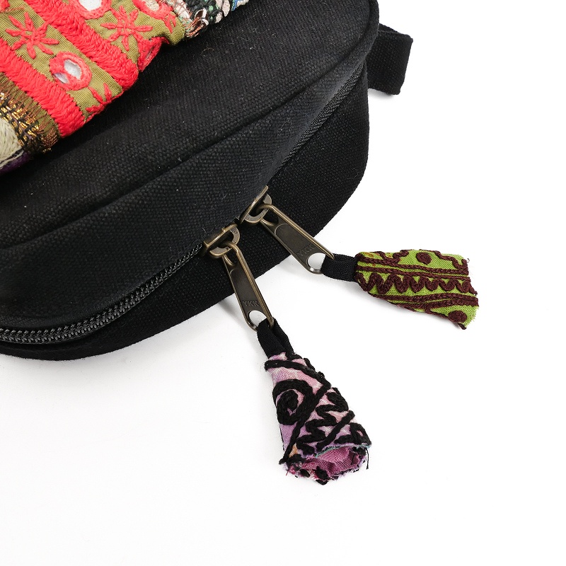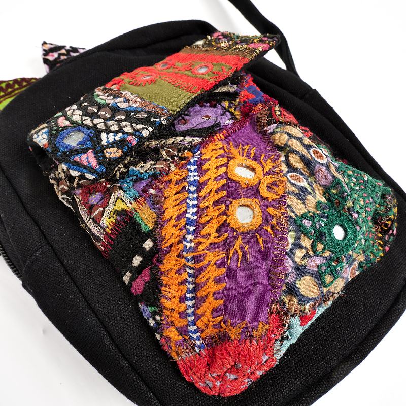 パキスタンのオールドドレスから集めた刺繍古布のパッチワーク生地を使用したミニショルダーバッグ。ブラックのキャンバスコットン生地が色彩豊かな刺繍生地を引き立てています。しっかりとした造りで、スマートフォンなど最小限の荷物を入れるのに便利。古布部分にマグネット付きポケット、裏側にもポケットがあり、機能性も充実。古布部分は全て1点ものです。