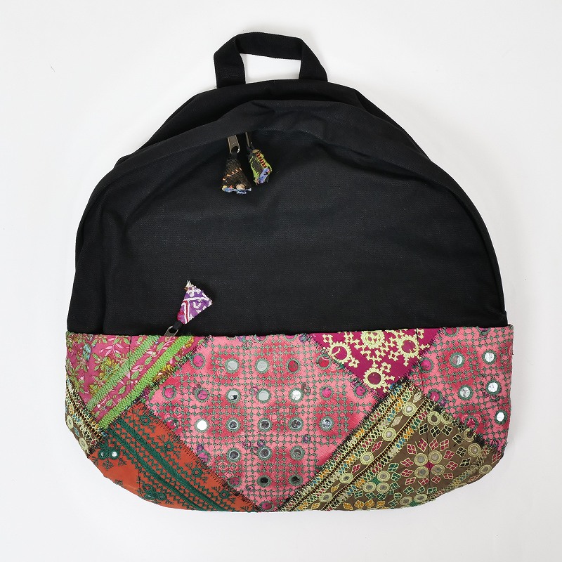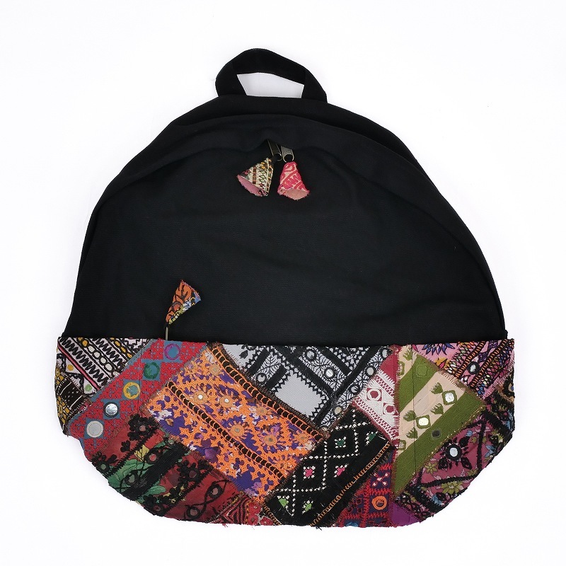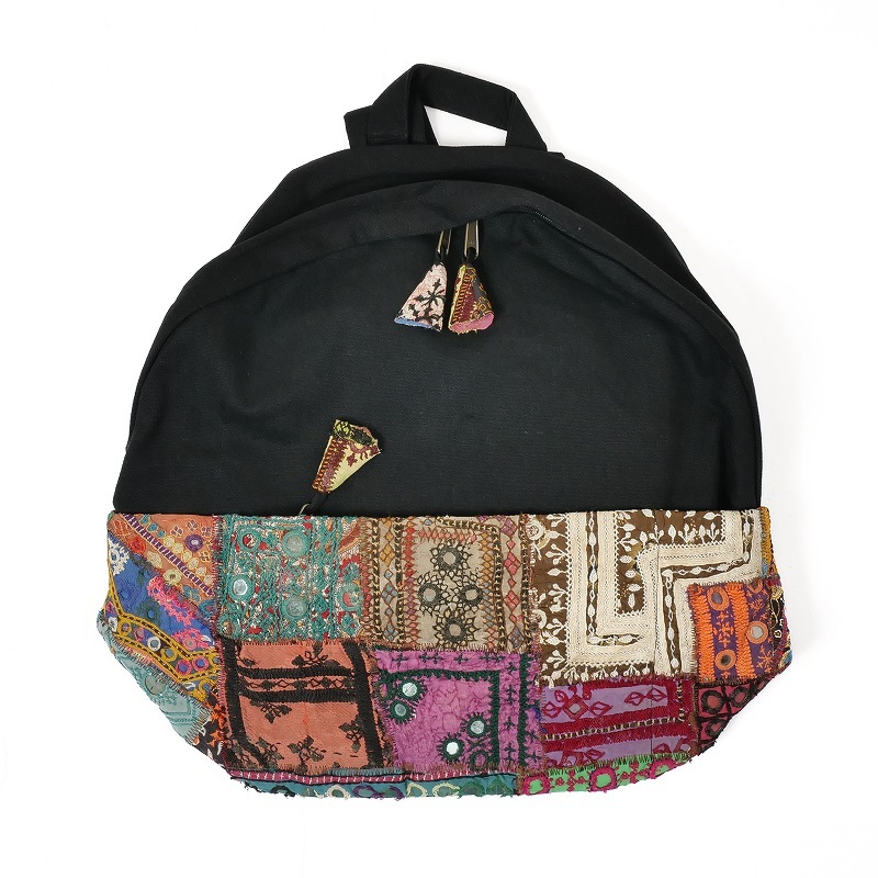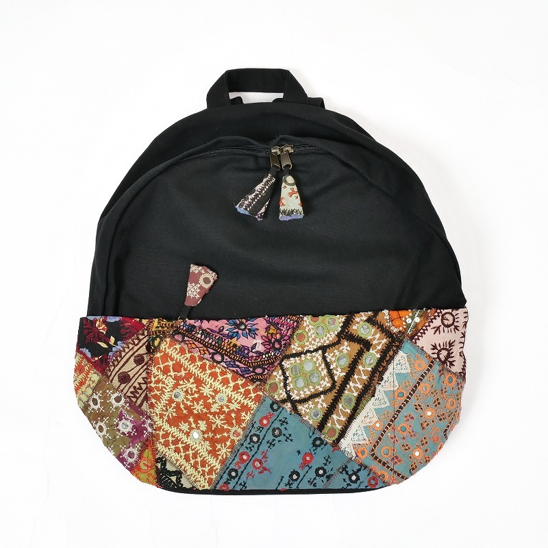 パキスタンのオールドドレスから集めた刺繍古布のパッチワーク生地を使用したリュック。ブラックのキャンバスコットン生地が色彩豊かな刺繍生地を引き立てています。縦にA4サイズが入り、通勤通学に使いやすい大容量。古布部分は中央にファスナー付きのポケット、両側にペットボトルなどを入れられるポケットがついています。内側にも大小のポケットやファスナー付きポケットがあり、機能性が充実。古布部分は全て1点ものです。
