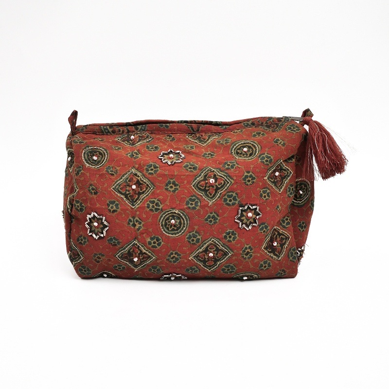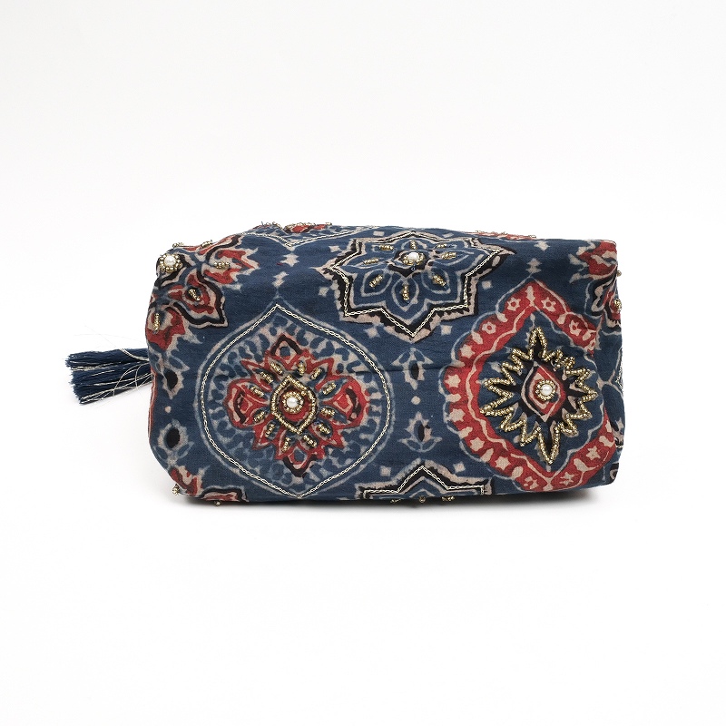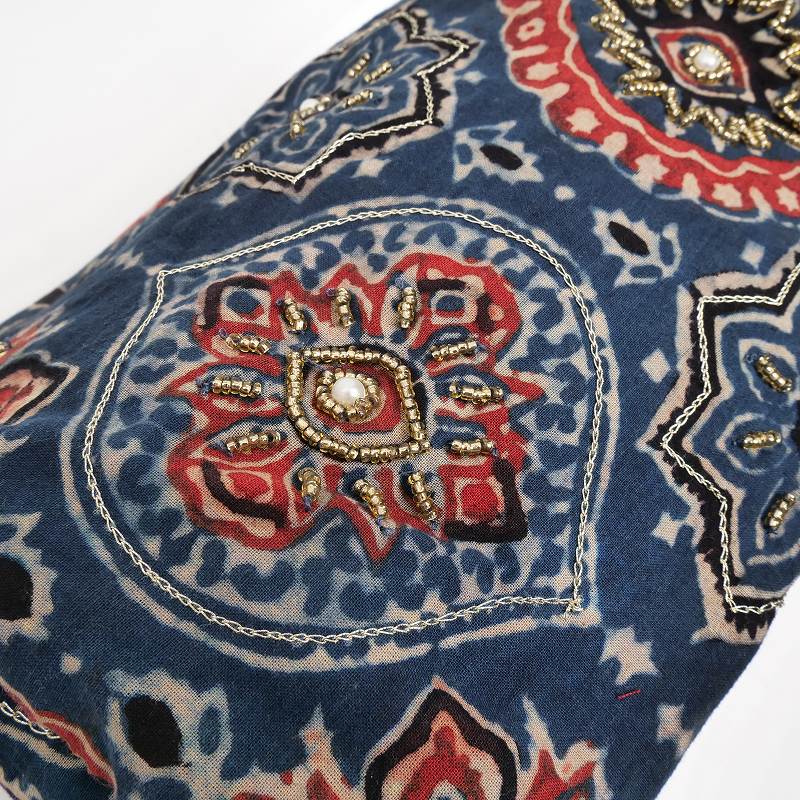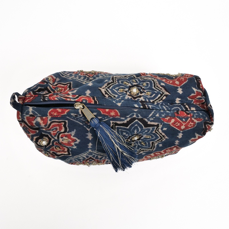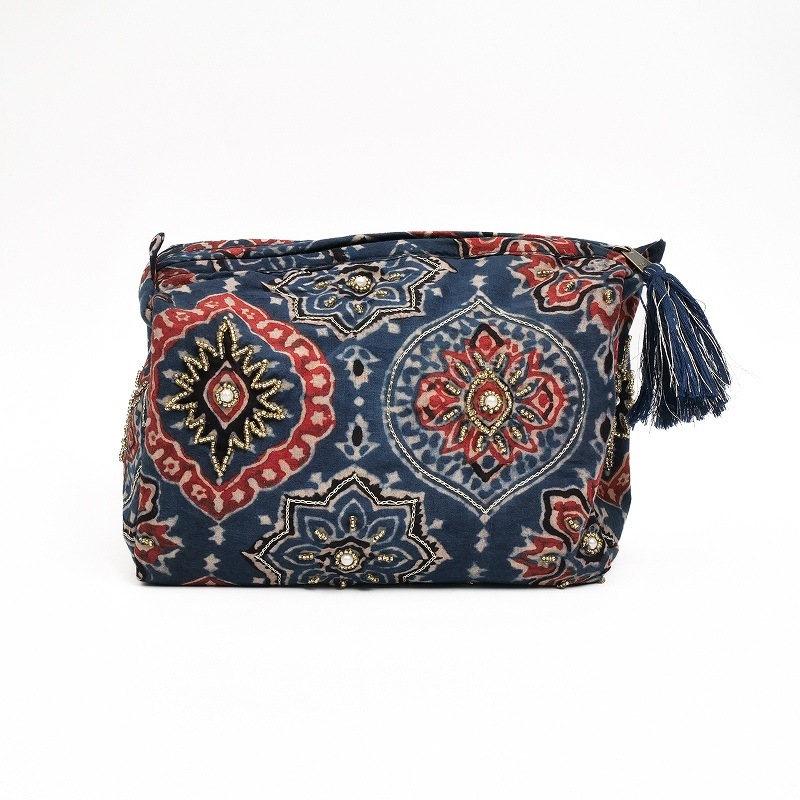 深みのあるアジャラクプリントにビーズ刺繍を施したポーチ