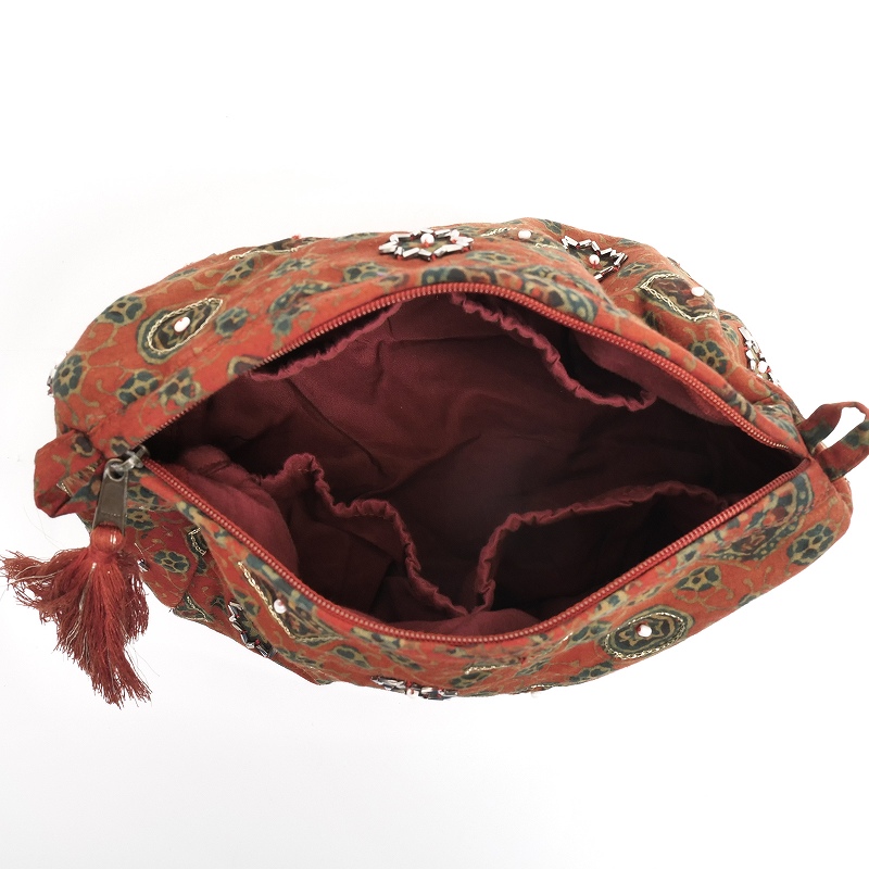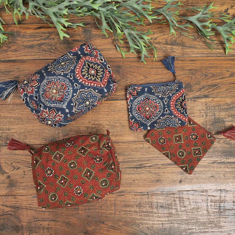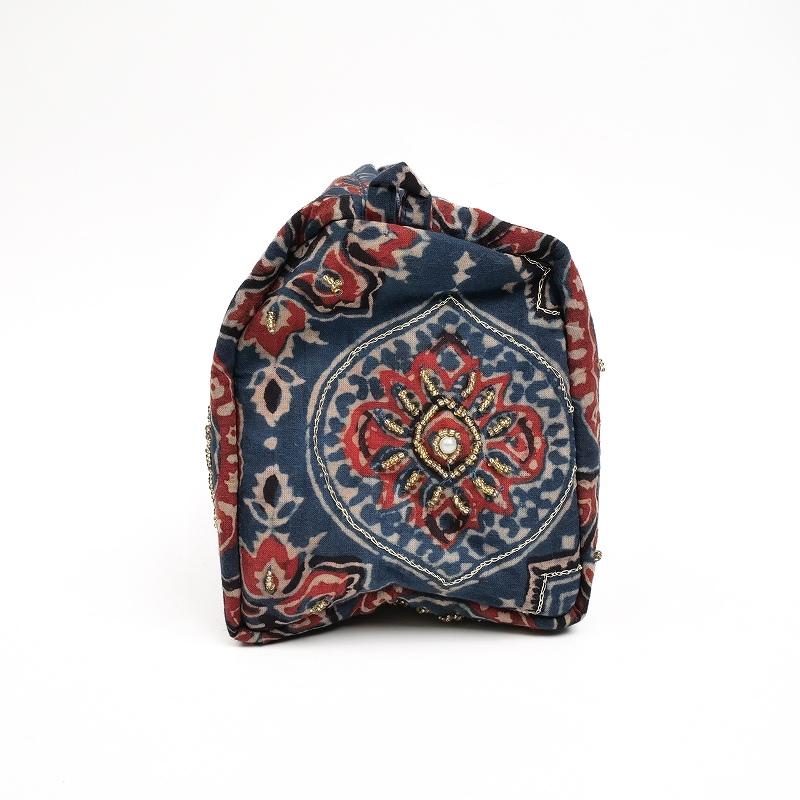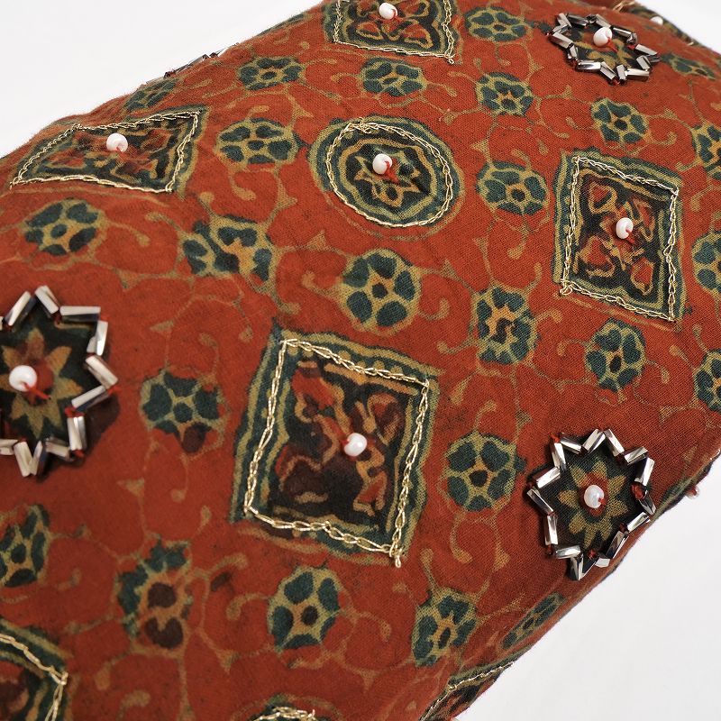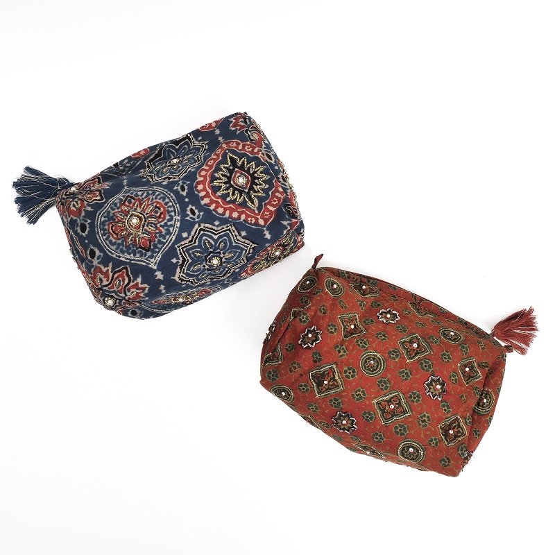 深みのあるアジャラクプリントにビーズ刺繍を施したポーチ