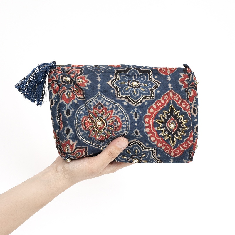イスラミックな幾何学模様と天然染料を使った深い色合いが魅力のアジャラクプリントと、その模様を引き立てるように施されたビーズ刺繍との組み合わせが目を引くポーチ。化粧ポーチなどに使いやすいサイズで、内側に4つポケットがあります。ビーズや金糸の刺繍によって上品さがプラスされていて、ギフトにもおすすめ。
