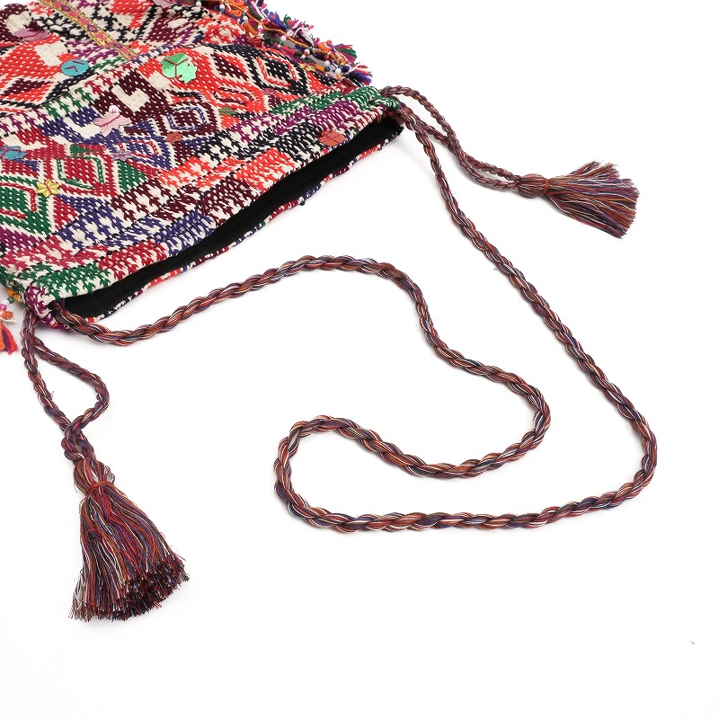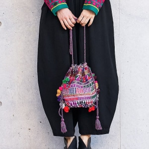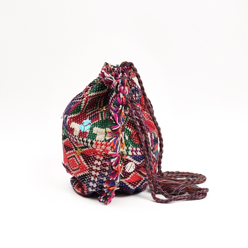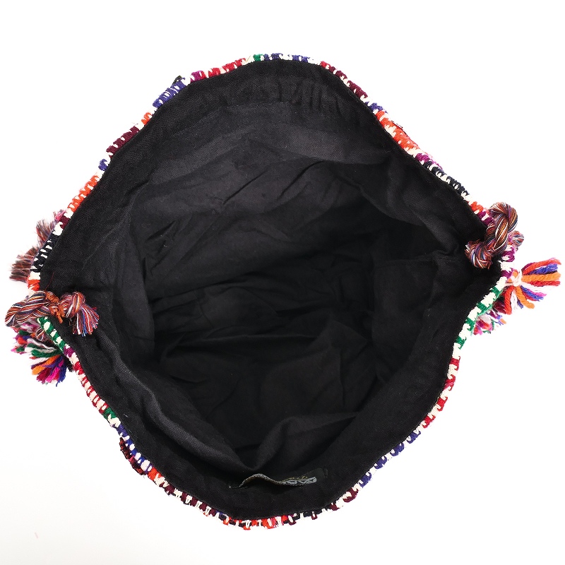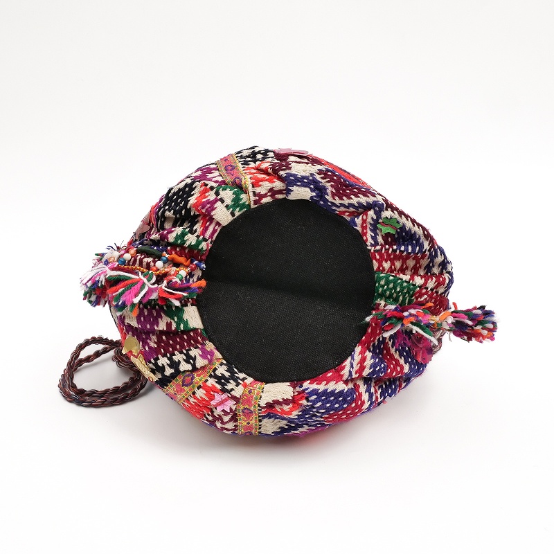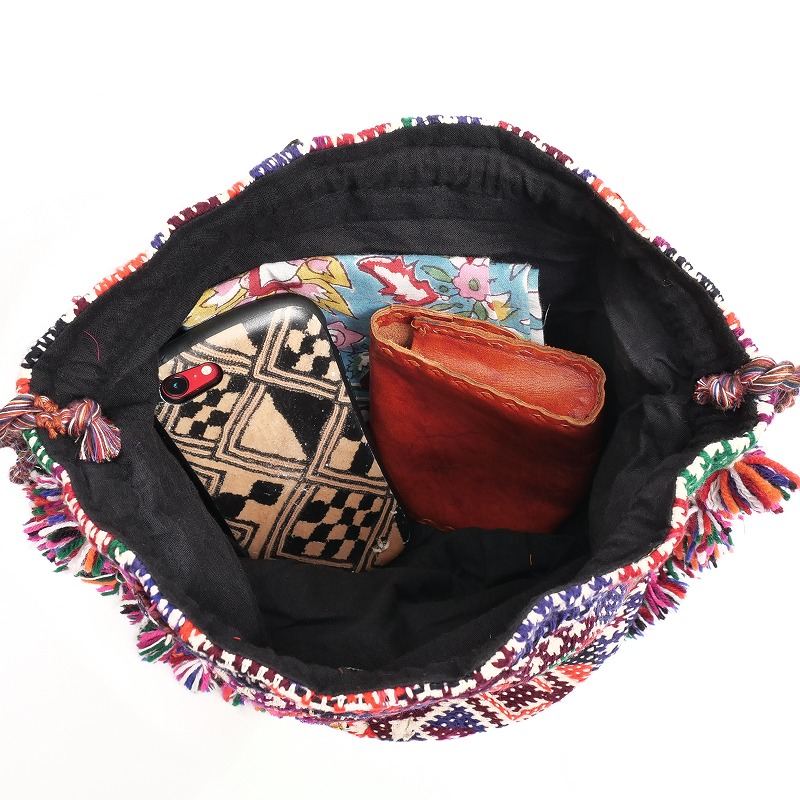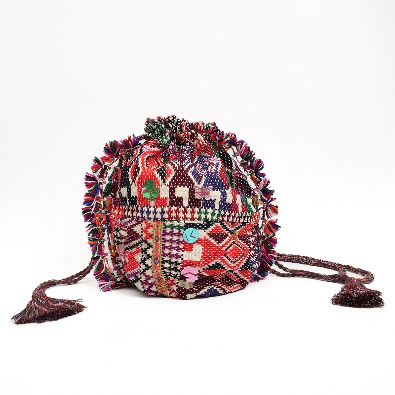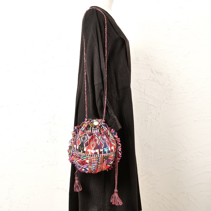 ラバリ族の古い民族衣装生地を使った巾着ショルダーバッグ。スマホとお財布、ハンカチ、小さめのポーチくらいの荷物でお出掛けする時にちょうど良いサイズ。巾着を絞ると丸いフォルムになり、色鮮やかな刺繍生地とサイドのタッセルが際立ちます。コーディネートの主役になるアイテム。