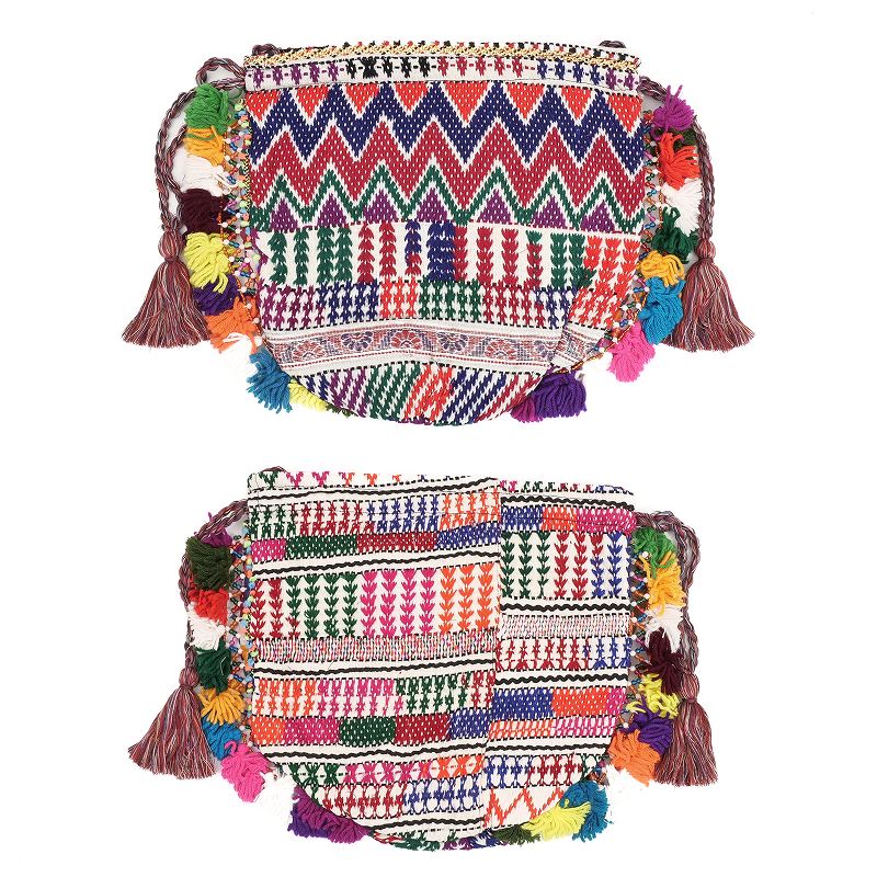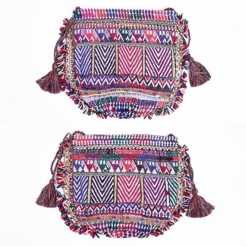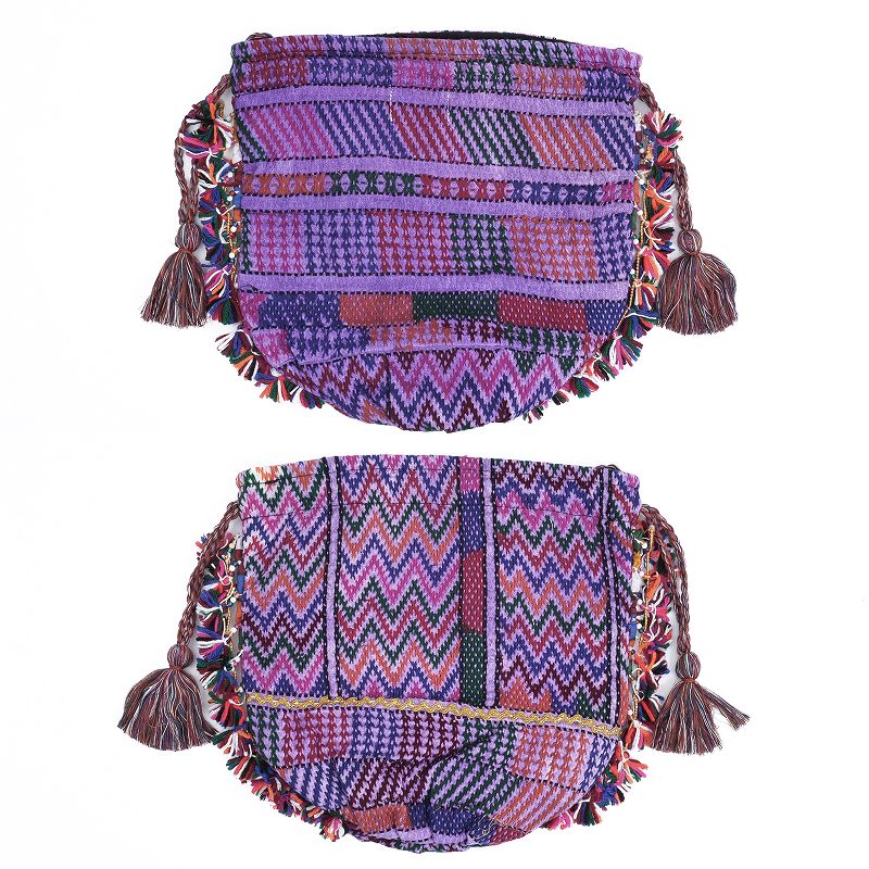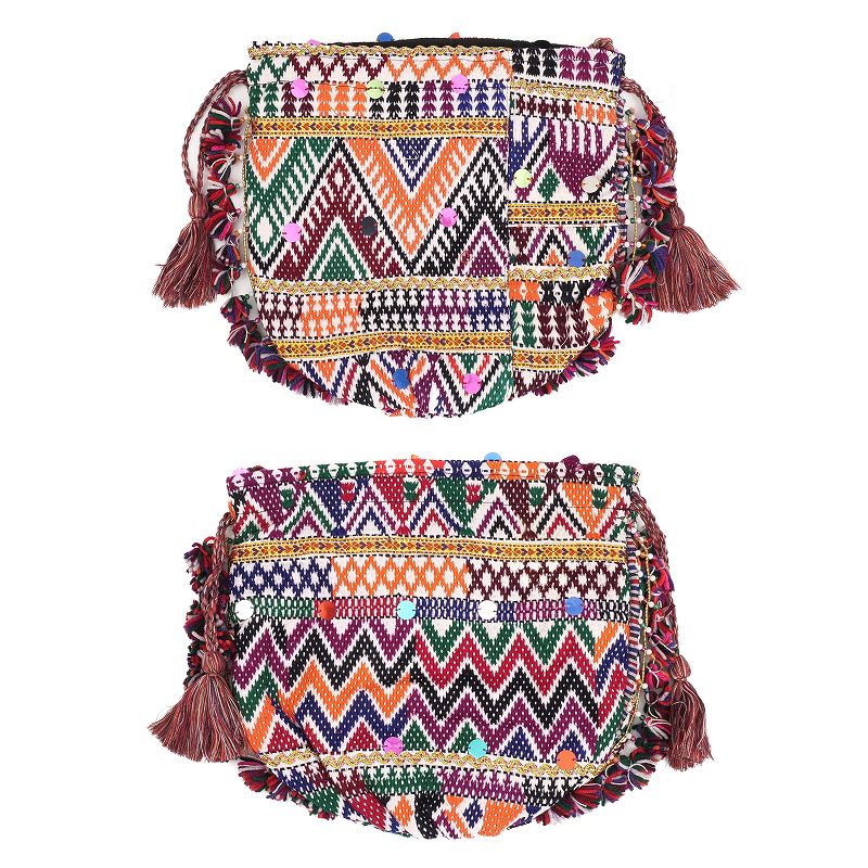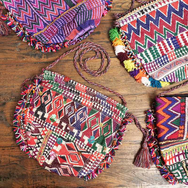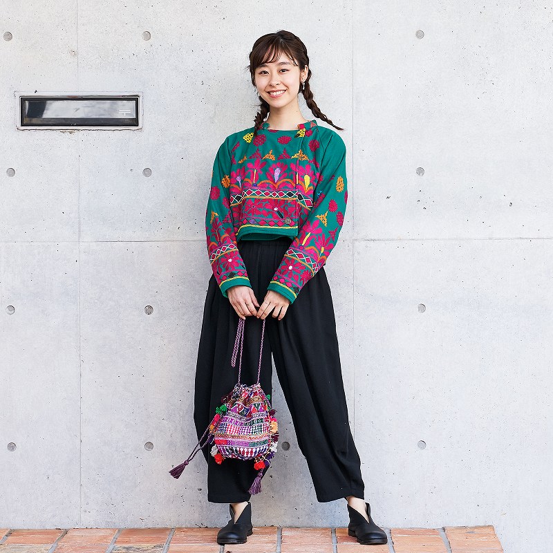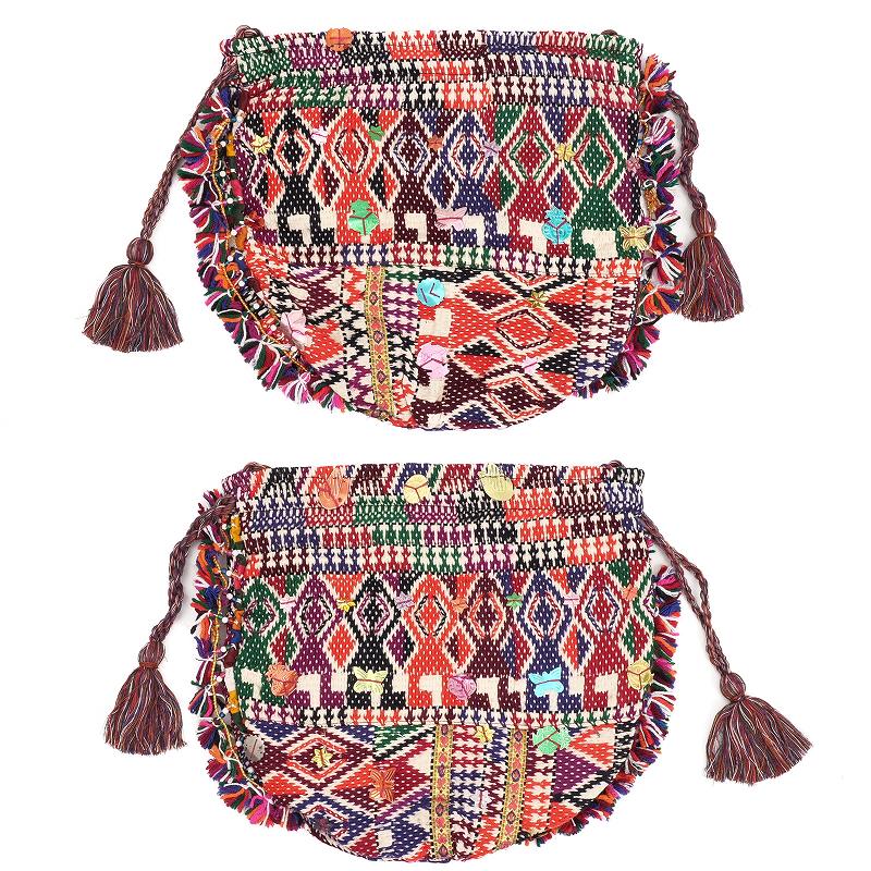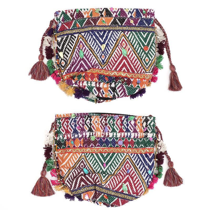 ラバリ族の古い民族衣装生地を使った巾着ショルダーバッグ。スマホとお財布、ハンカチ、小さめのポーチくらいの荷物でお出掛けする時にちょうど良いサイズ。巾着を絞ると丸いフォルムになり、色鮮やかな刺繍生地とサイドのタッセルが際立ちます。コーディネートの主役になるアイテム。
