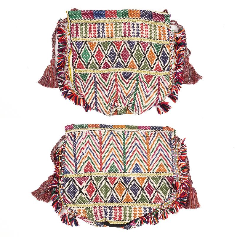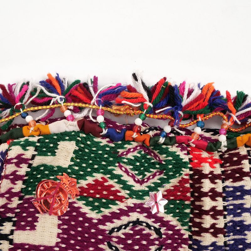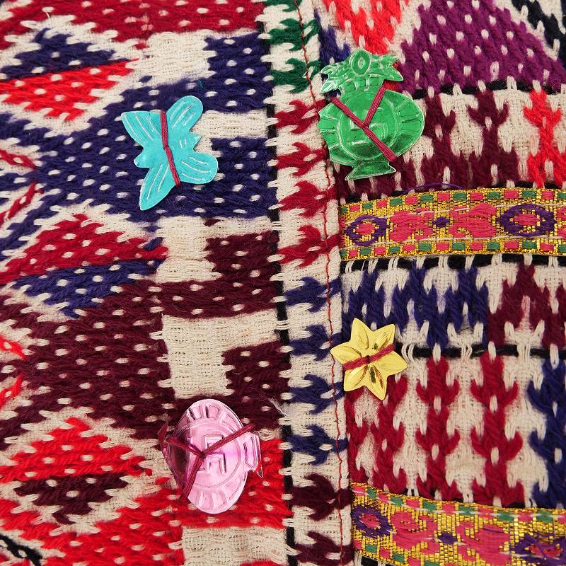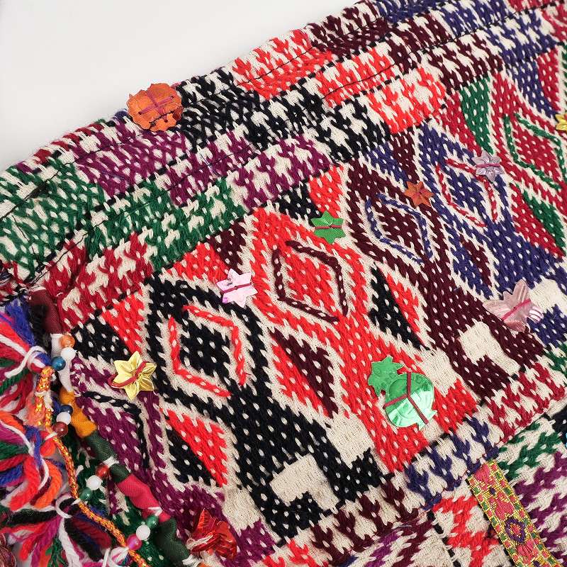 ラバリ族はインド北西部ラジャスタン州やグジャラート州、パキスタンのシンド州にかけて広く住んでいる民族です。ラクダ・山羊・羊を飼う牧畜民で以前は遊牧をしながら暮らしていましたが、現在は定住化が進んでいます。男性が放牧に出掛けたあと、女性たちは家を守りながら多くの時間を針仕事に費やして衣生活を支え、美しい刺繍が生み出されました。刺繍は衣装だけではなく、家屋の壁飾りや袋などの調度品、家畜の装身具にも施されます。これらは婚姻のときの持参財としての役割を担っています。ラバリ族のミラーワークは丸形・三角形・ひし形など様々で、文様も抽象的な表現を好みます。