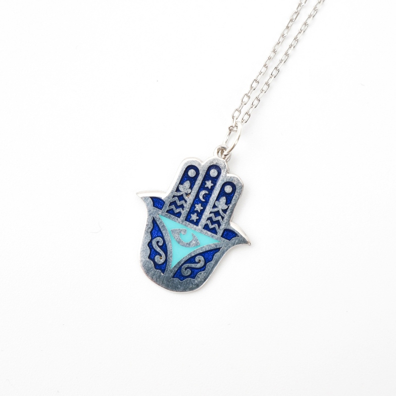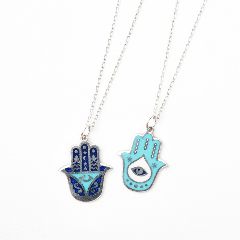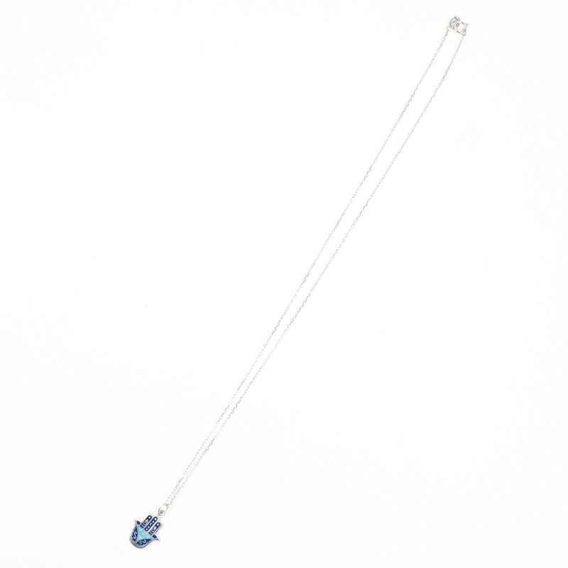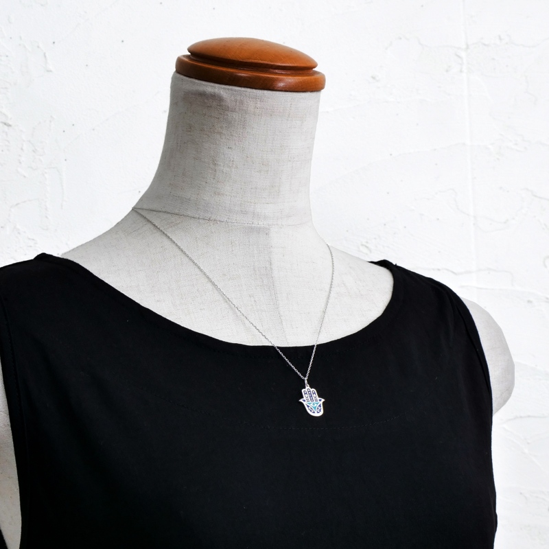 1500年以上の歴史を持つ中東の幸運モチーフ「ハムサ」はアラビア語で「5」を意味し、神の加護の手を象徴するお守り。邪気や妬みを払い、幸福を招くといわれる人気のモチーフ。こちらのネックレスは日常使いしやすいサイズ感のシルバーに、三日月と夜空を思わせる深いブルーが印象的。着け心地は軽やかで、落ち着いた色合いが上品な印象。配色が反転したデザイン違いのトルコハムサチャームネックレス(SN039064E)と対にして揃えるのもおすすめ。