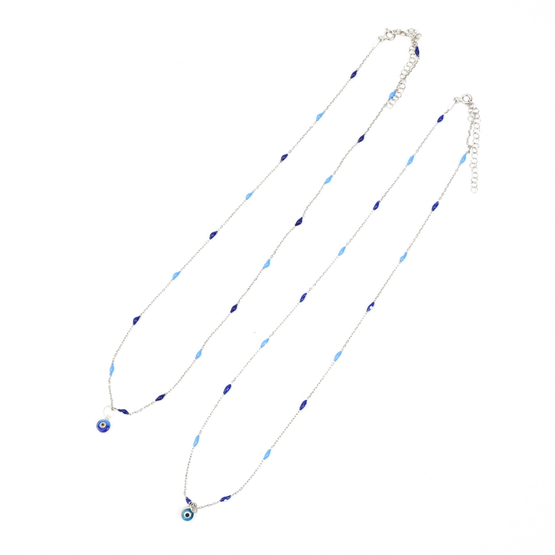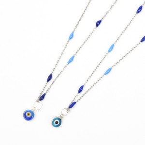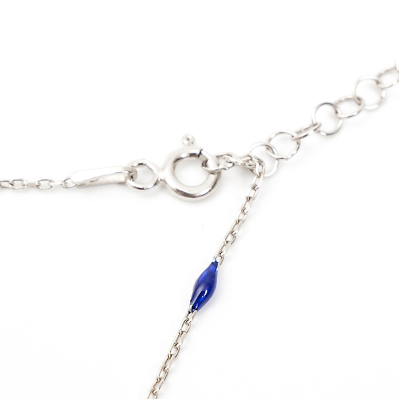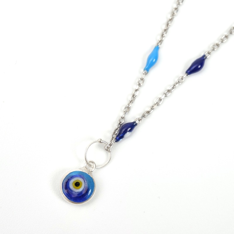 ナザールボンジュウは身に着けることで邪視から災いを跳ねのけると信じられている青い目玉の形をしたトルコのお守り。小粒のナザールボンジュウをあしらったこちらのネックレスは、日常使いしやすいシンプルなデザイン。一見するとナザールボンジュウと気づかれない遊び心が魅力。シルバーとガラスの組み合わせが華やかさを添え、自分用のお守りにはもちろん大切な人への贈り物にも。