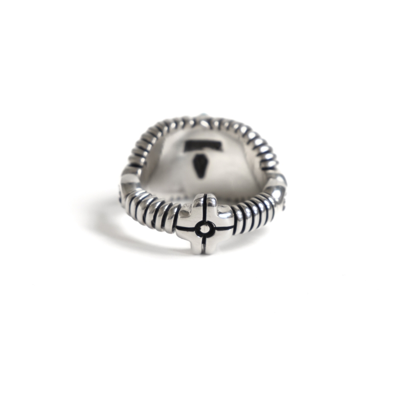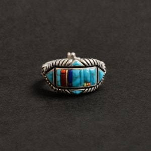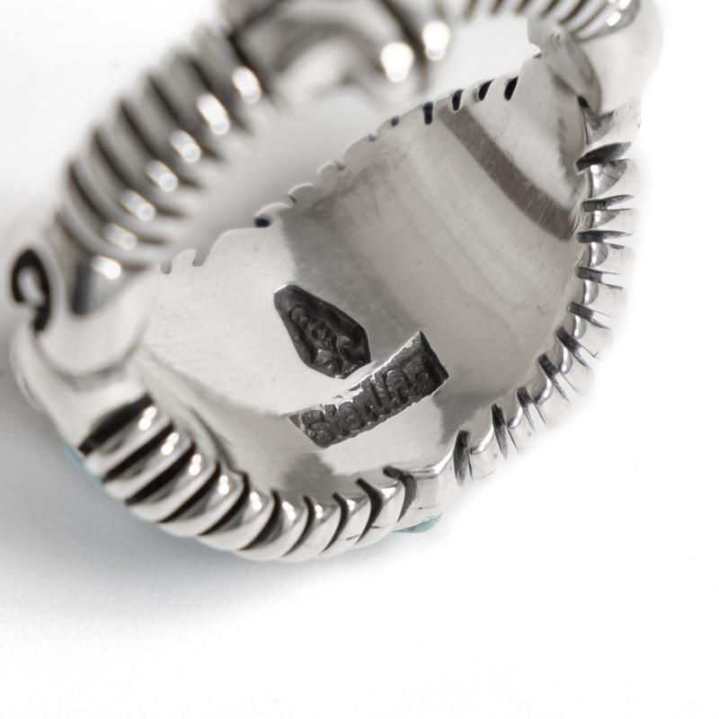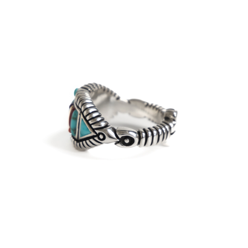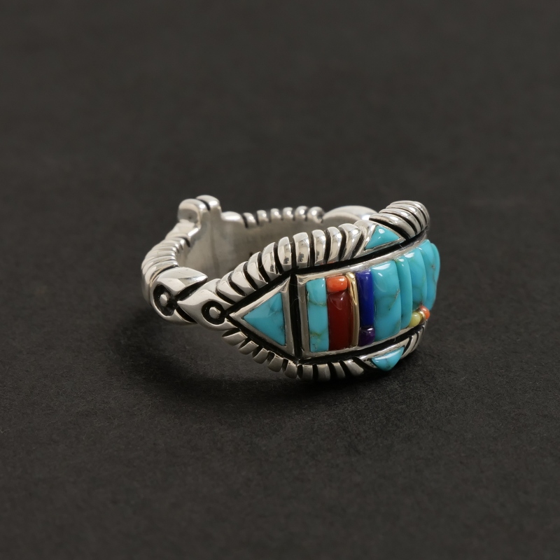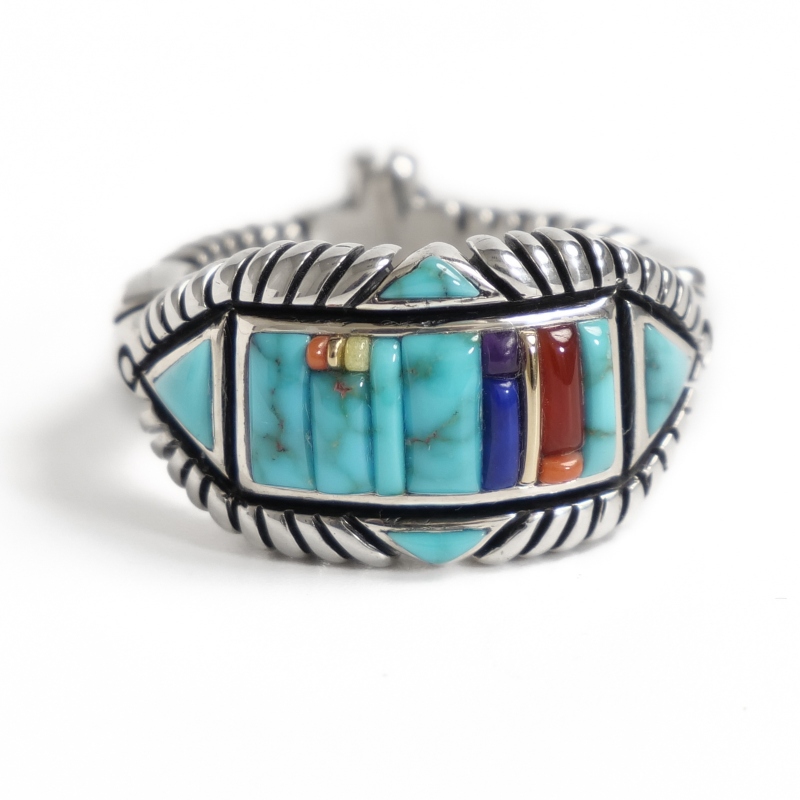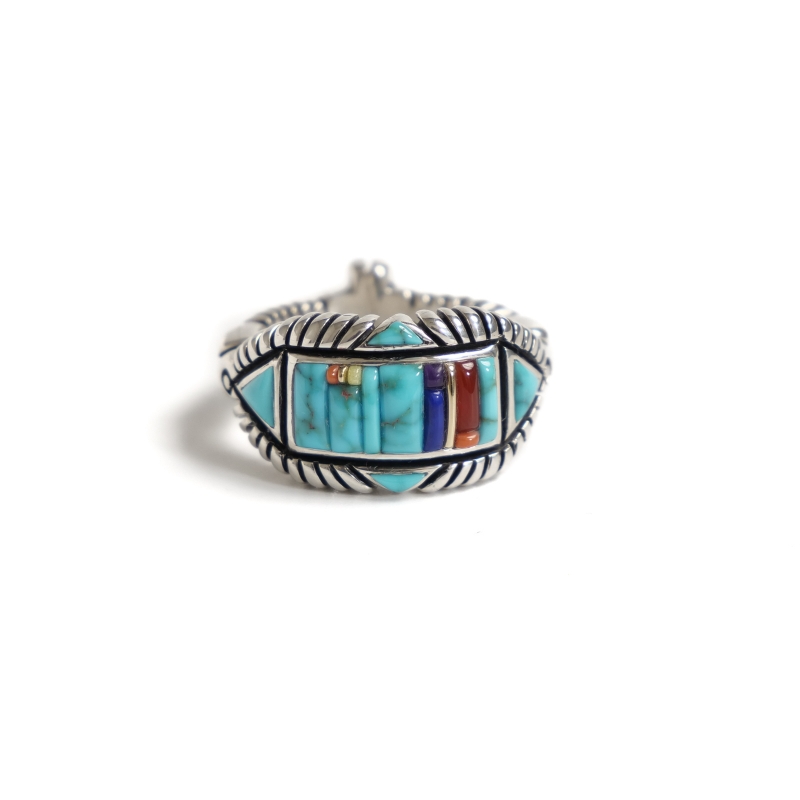 巨匠・ナバホ族レイモンドヤジーのインレイリングです。緻密なインレイワークを普段使いできるような細身幅で特注した大変貴重な作品。重厚さを出すため2層重ねられたシルバーの上に、一つ一つ極繊細にカット・象嵌されたハイグレードのナチュラルローンマウンテンターコイズを配置。ラピスラズリ・コーラル・14金ストリップなどでアクセントが添えられています。それぞれ少しずつ違う幅でデザインされたアシンメトリーなリズムにも巨匠の感性が。上下左右の矢印と背面のクロスはナバホの思想である神聖な4方向『フォーディレクション』の意匠、丸みをもって擦りだされた肉厚なシルバーのアクセントとなっています。細部までこだわり抜いて仕立てられた究極のインレイリング、じっくり眺めるほどに味わい深くエレガント。スミソニアン博物館など名だたる美術館に収蔵されてきたレイモンドヤジーが数か月がかりで仕立てた逸品、なかなか入手できない名品をぜひその手に。