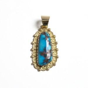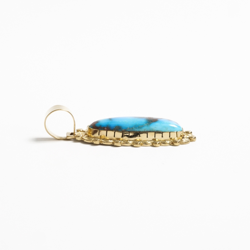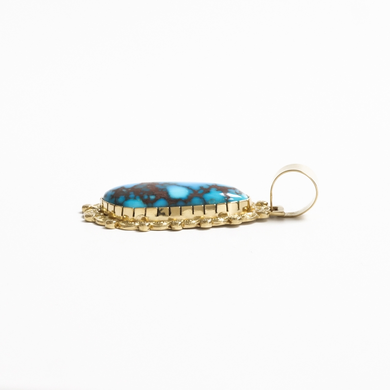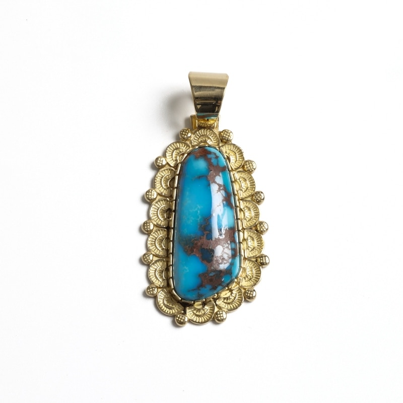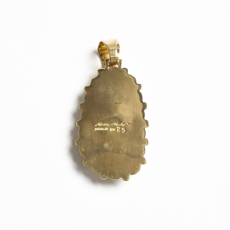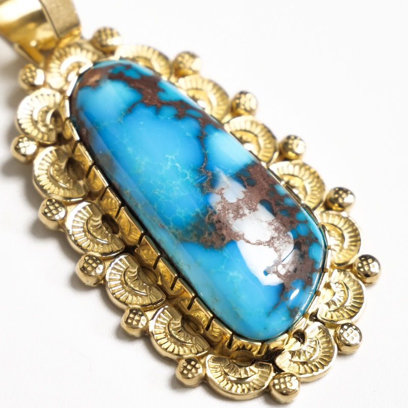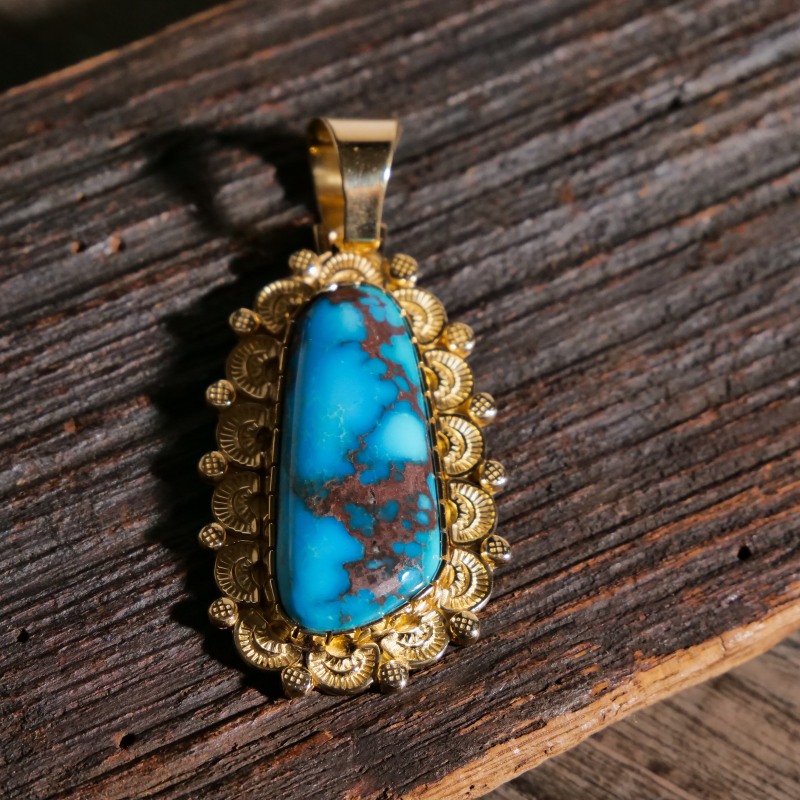 ナバホ族アーティスト、マシューチャーリーによる総18金のビズビーペンダントです。赤茶色のウェブ、透明感のあるブルー、特大のビズビーターコイズはマシューの目で自ら選んだ最高級のターコイズ。鮮やかなブルーと華やかなゴールドが実に美しい。トラディショナルなスタンプワークをあえて18金という高価な素材に施すことでナバホ族の矜持を表した作品。年々貴重になってゆく特別なビズビーを贅沢にゴールド仕立てにした『身に着ける資産』というに相応しいジュエリーです。