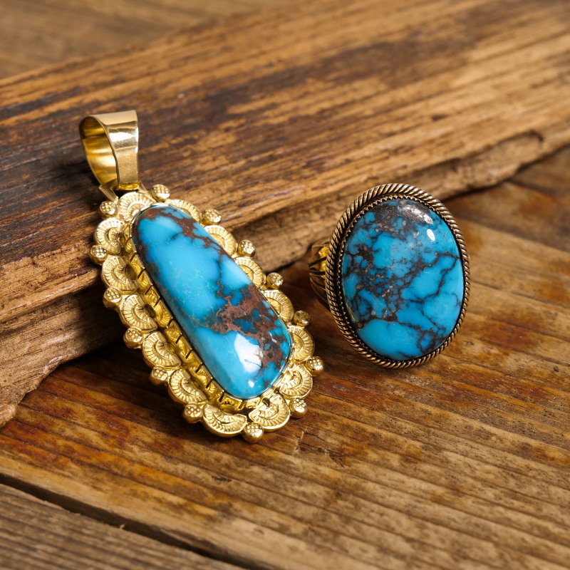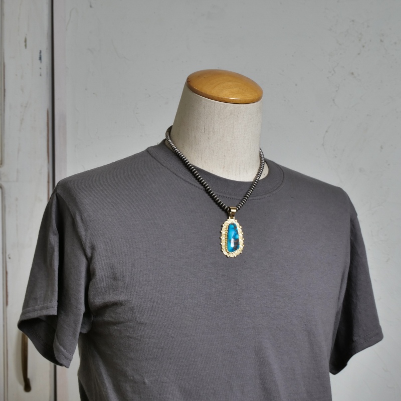 アリゾナ州にあるビズビーでとれるターコイズ。ビズビーも銅山で、ターコイズが発見されたのは6キロも深い地下だったそうです。そこからとれた石は深い紺~黒に近いような青色に茶色~黒のマトリックスが入っており、色が非常に特徴的で人気のあるターコイズの一つになっています。中でも、曇っているように見えるマトリックスが入っているものはスモーキービズビーやラベンダーなどと呼ばれ、コレクターアイテムの一つとなっています。青色が濃く、その中から染み出しているようなマトリックスが入っているものが人気が高く、高価になります。