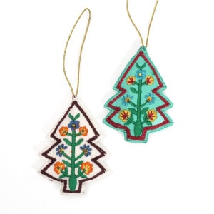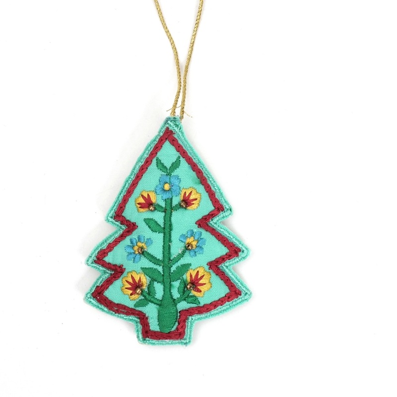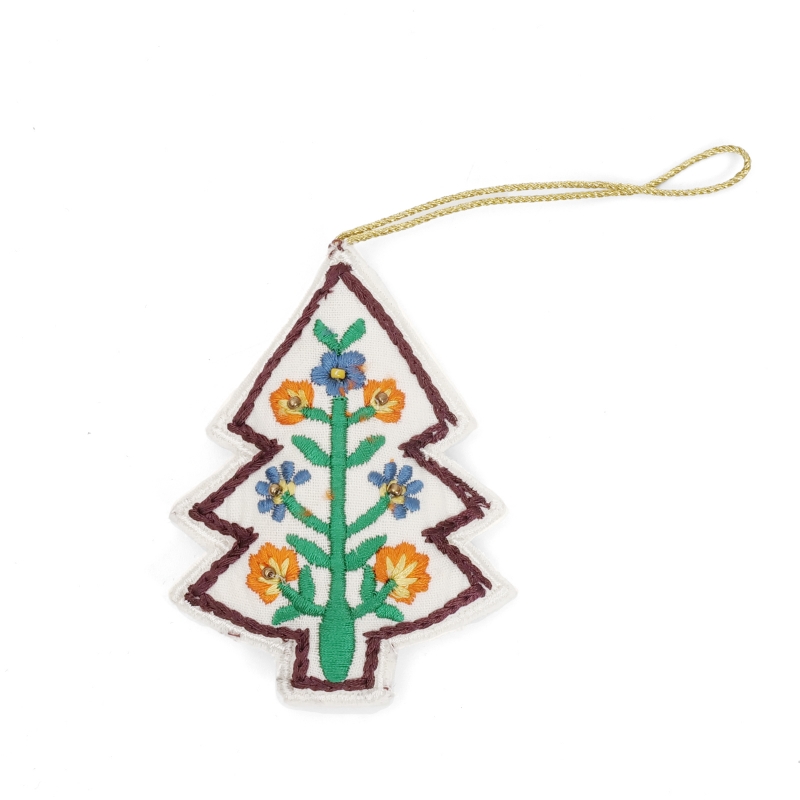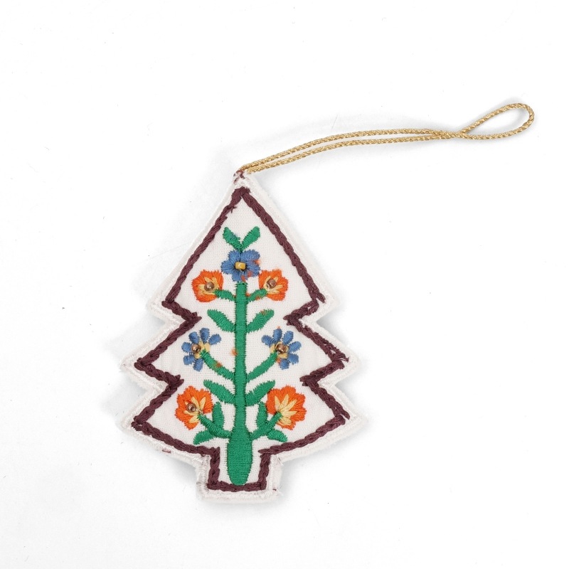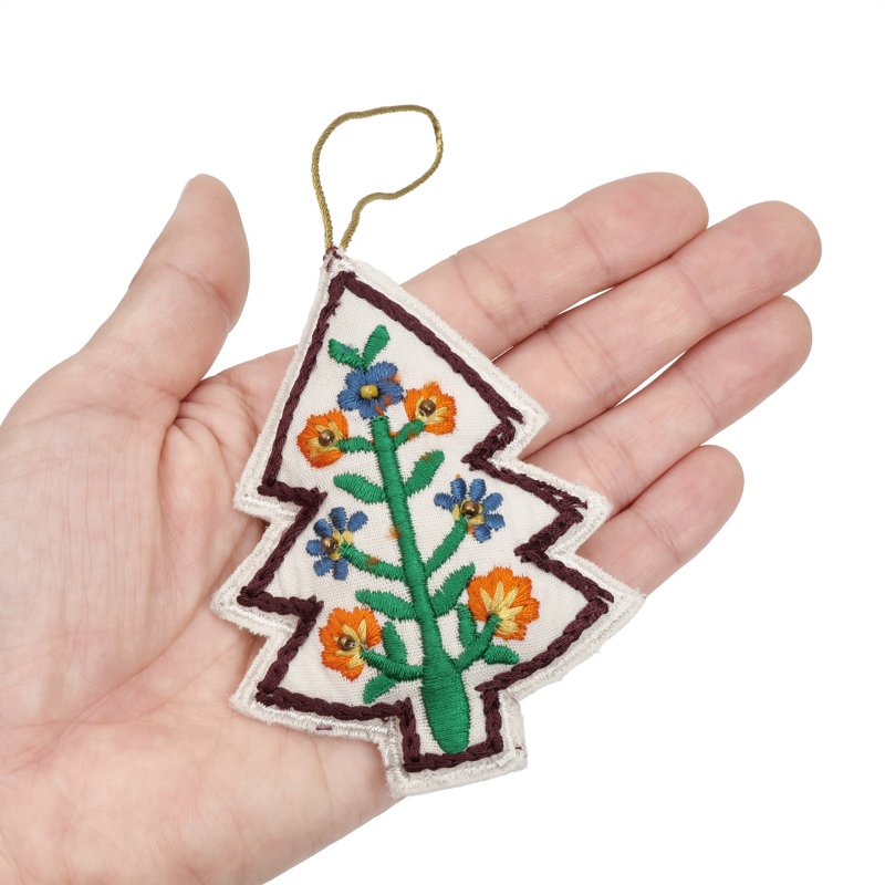手のひらサイズのツリー型のクリスマスハンギング。カラフルな刺繍とビーズでもぴょうが描かれ、あたたかみのある手仕事の風合いが魅力です。クリスマスツリーに飾るのはもちろん、壁やドアノブ、カバンに掛けてもかわいいアイテム。ちょっとしたギフトにもおすすめです。置いておくだけでホリデー気分を楽しめるアイテムです。