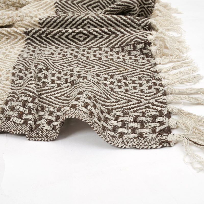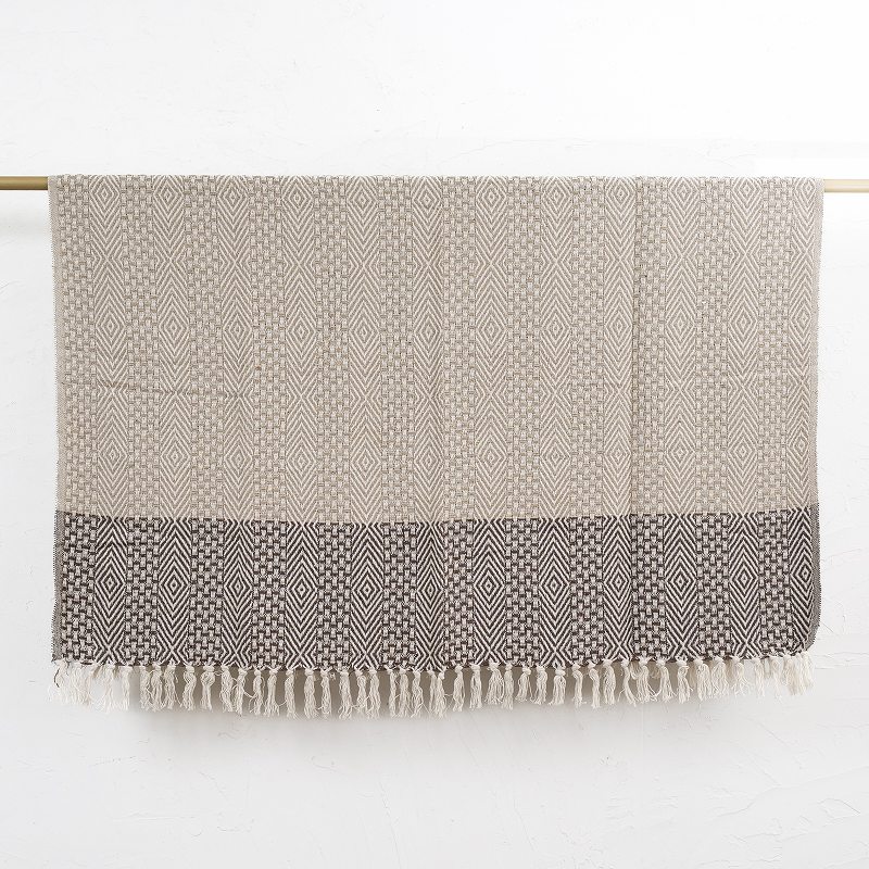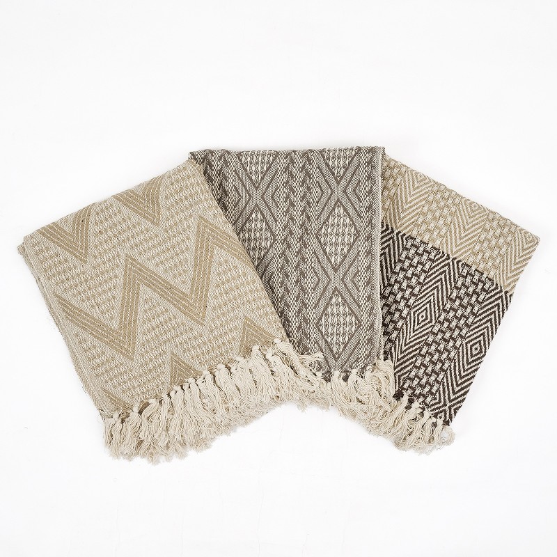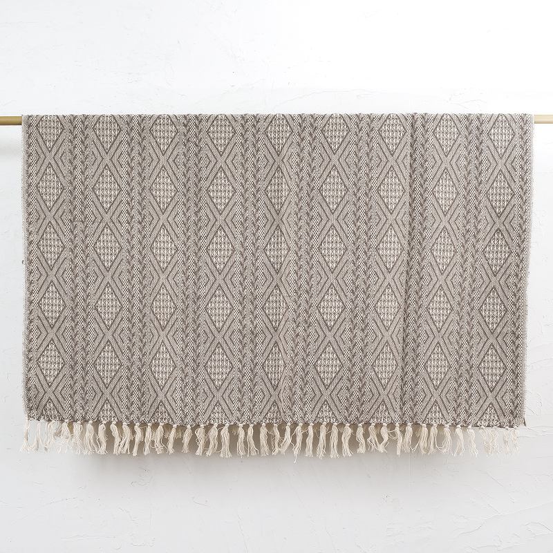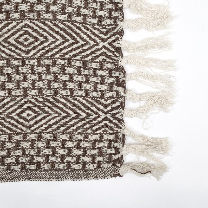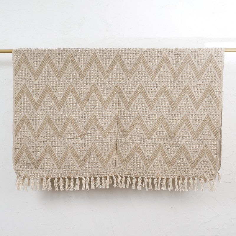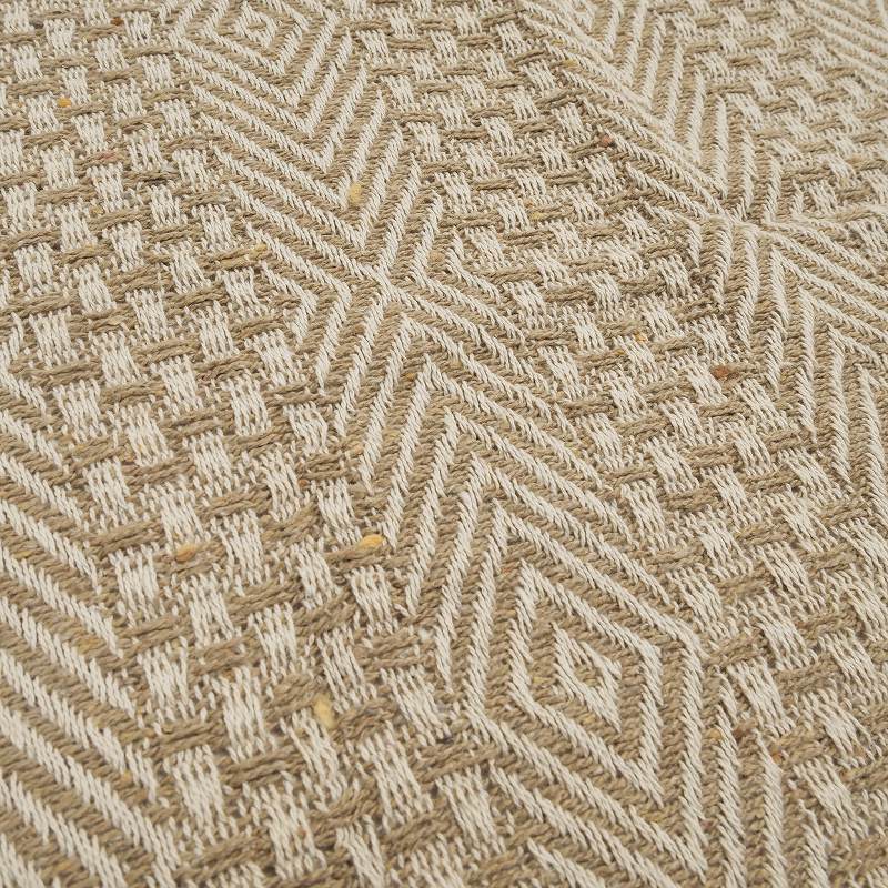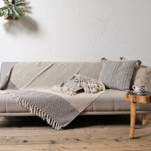 リサイクルコットンを使った、ナチュラルな風合いのスローケット。縫製工場などで出る端切れや余り生地を再利用して紡いだ糸を使用しています。緯糸にはリサイクル素材を、経糸には織物の強度を保つためコットン100%のバージン素材を使用。ふんわりと柔らかく撚った糸を、手織りでざっくりと織り上げており、糸の節や織りムラが素朴で温かみのある表情を生み出します。ナチュラルテイストのインテリアにおすすめ。